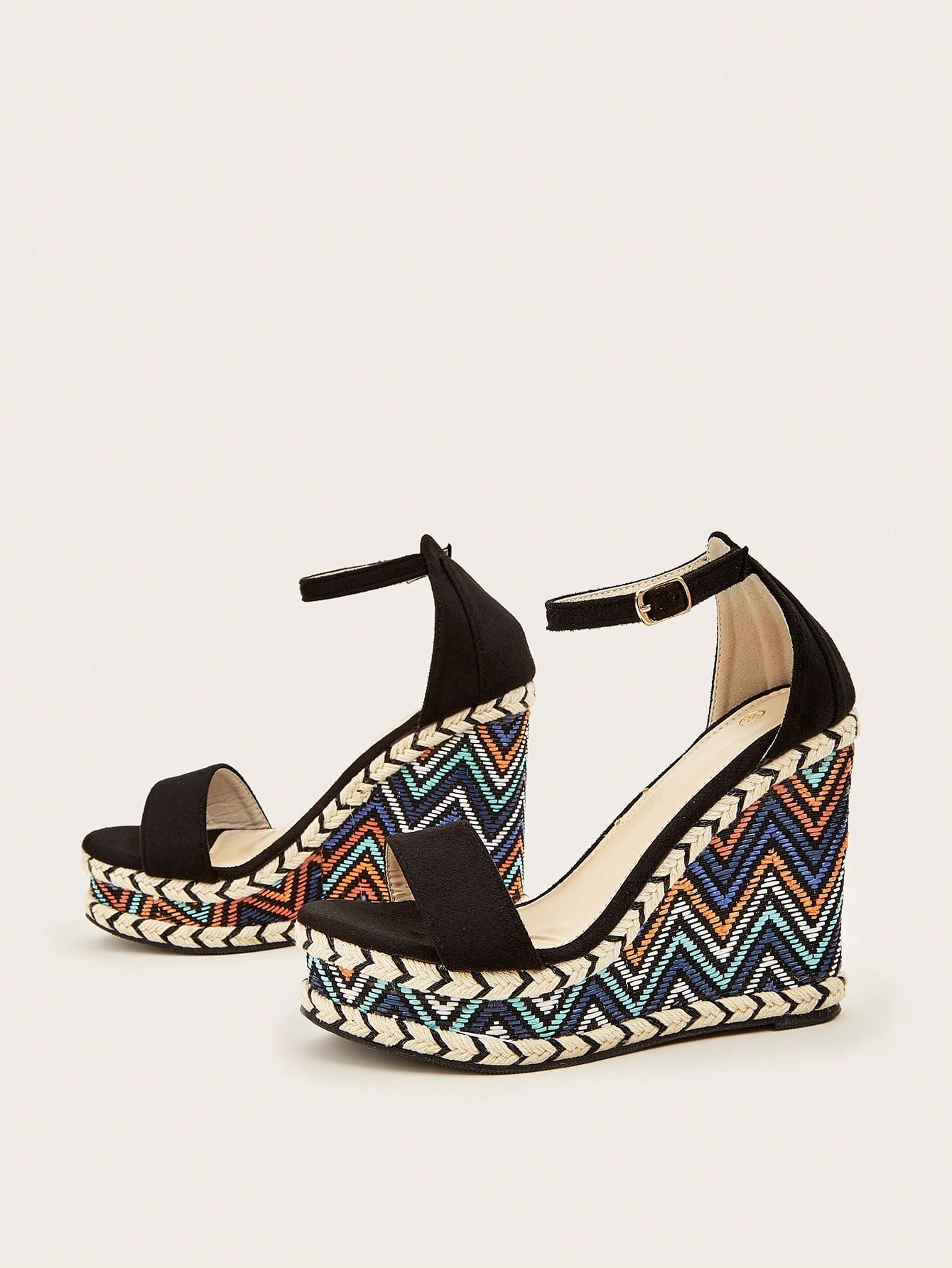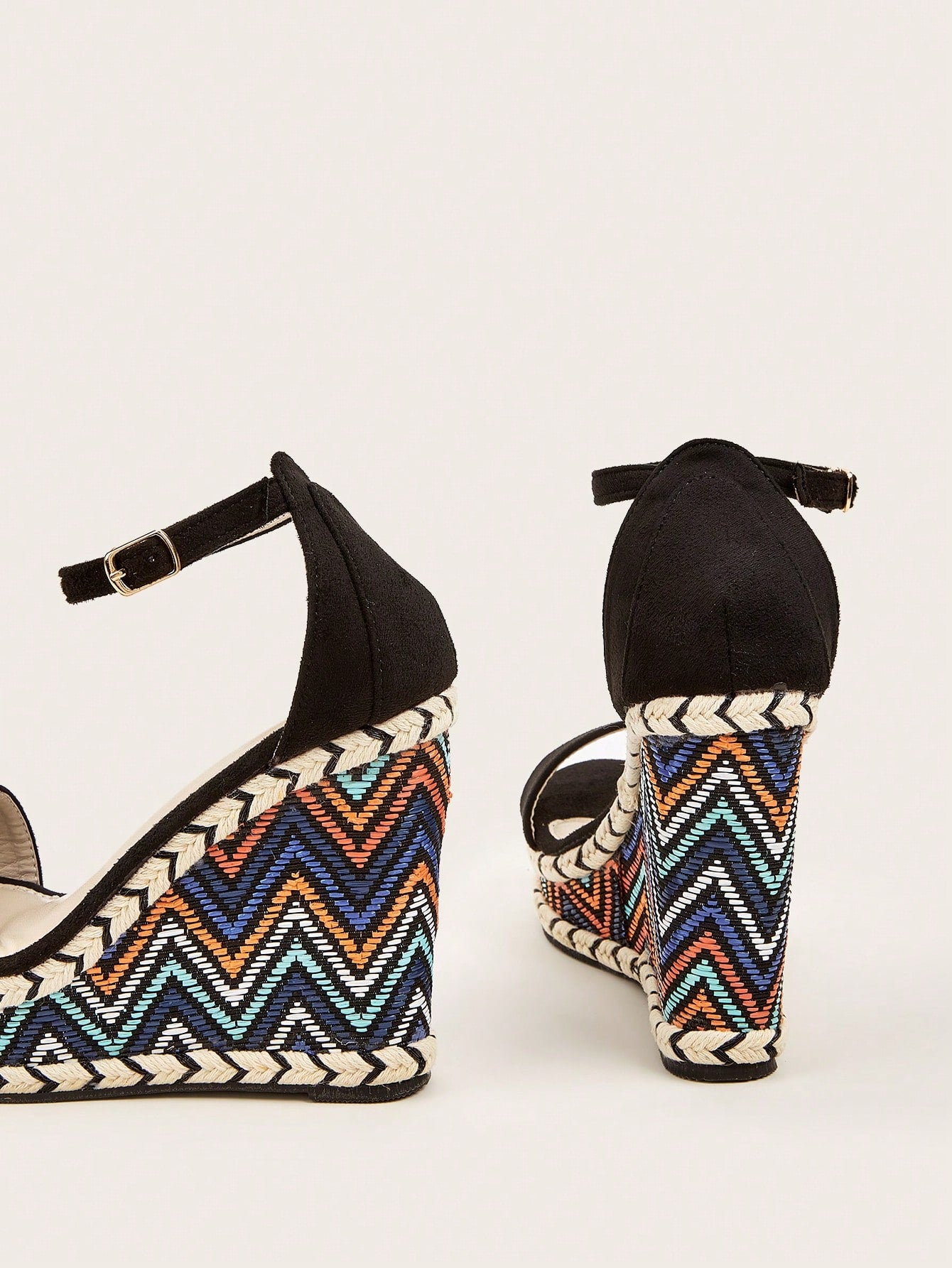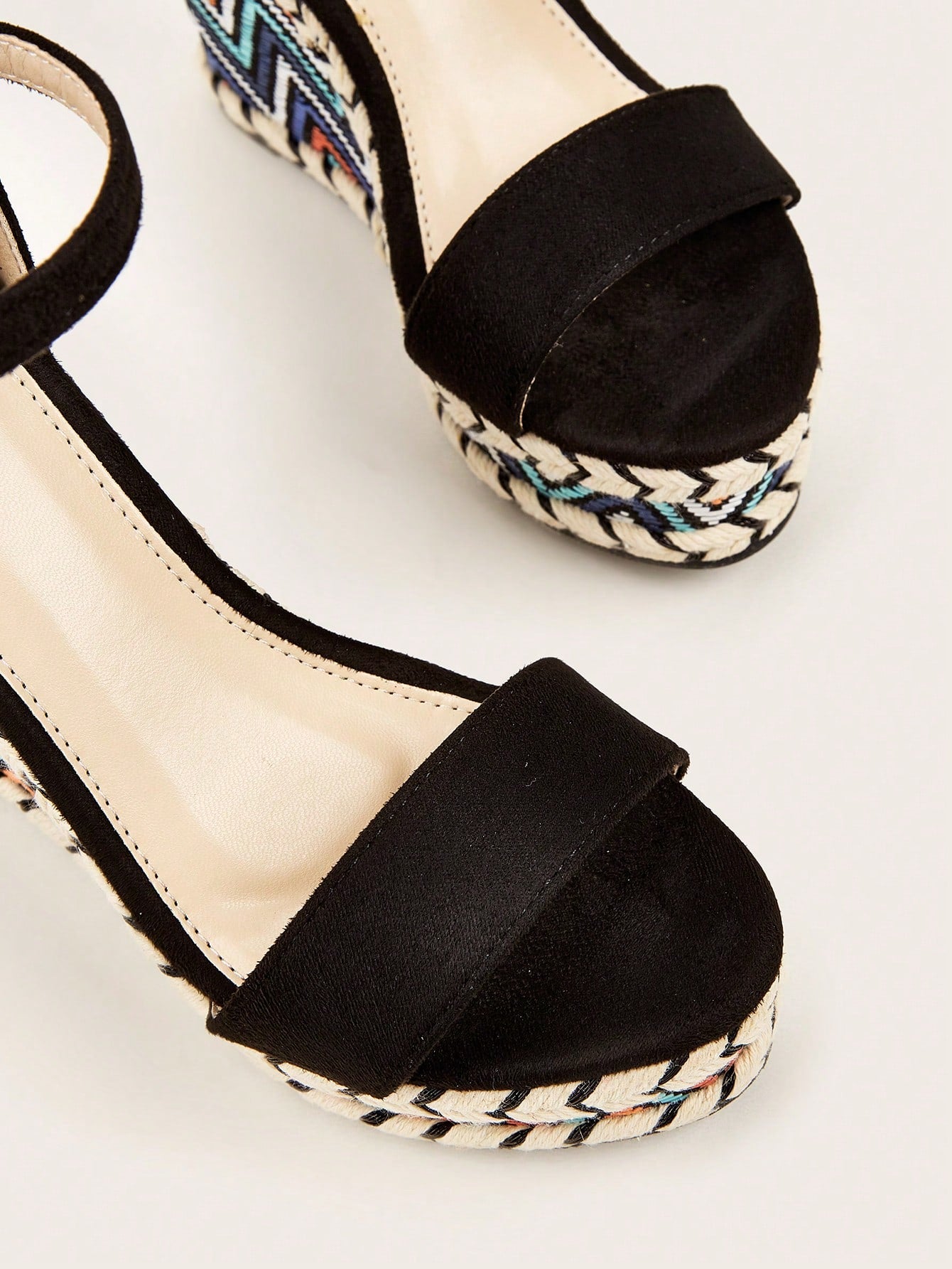 صندل بكعب مكتنز من الجوت ملتف على شكل إجازة ومقدمة مفتوحة مع حزام من جلد الغزال الأسود