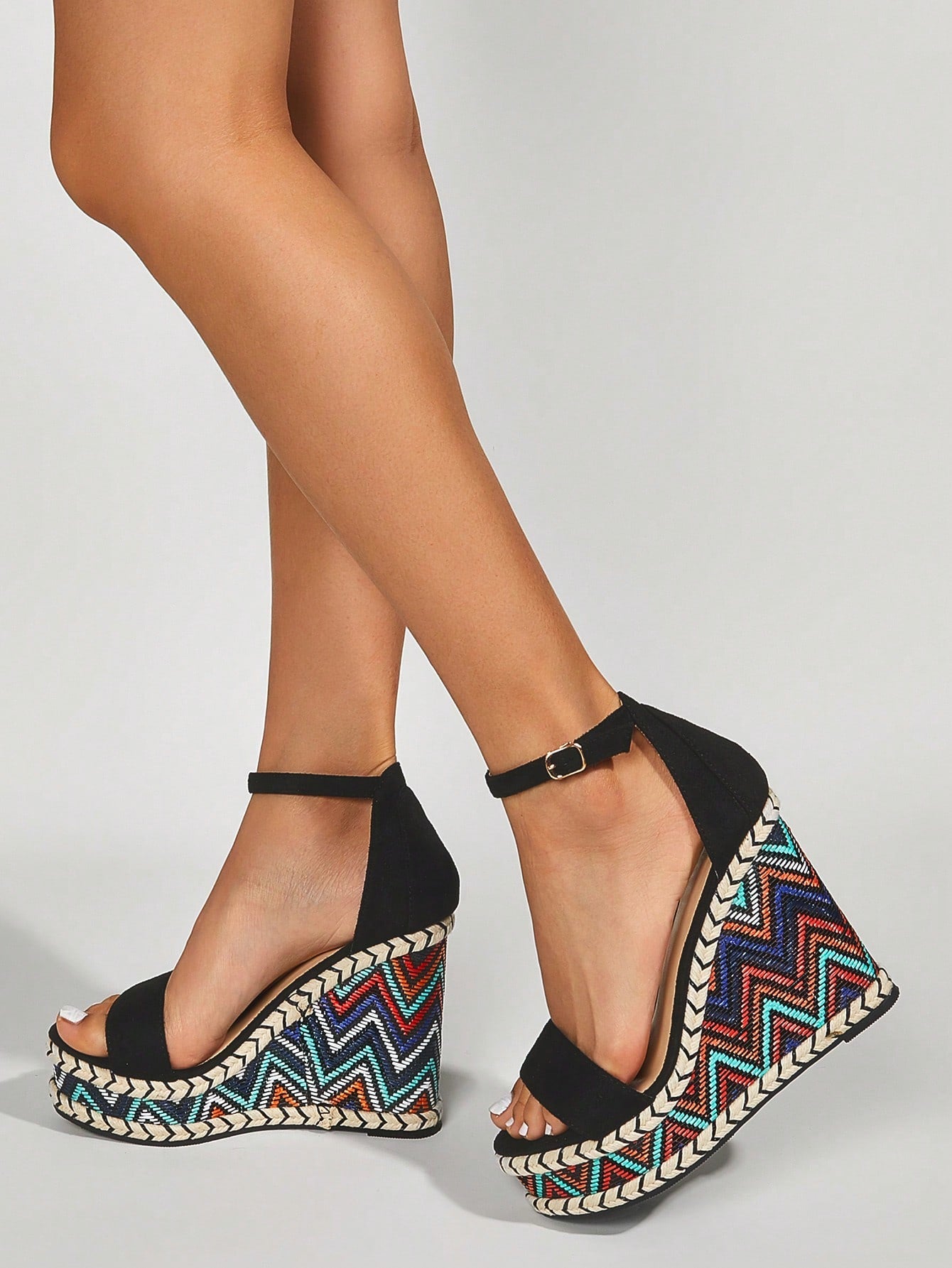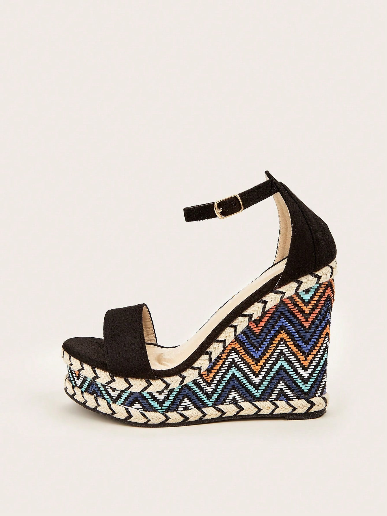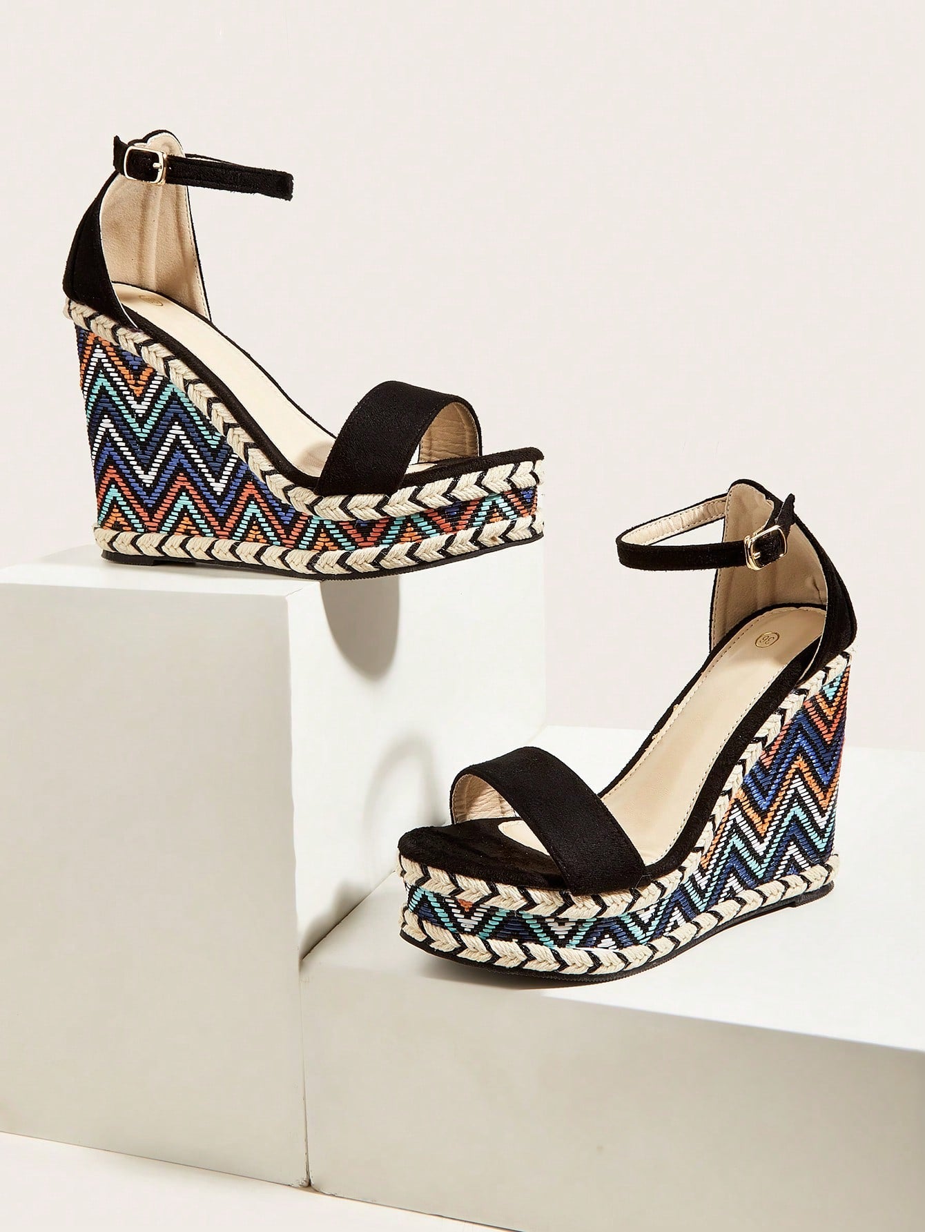 صندل بكعب مكتنز من الجوت ملتف على شكل إجازة ومقدمة مفتوحة مع حزام من جلد الغزال الأسود