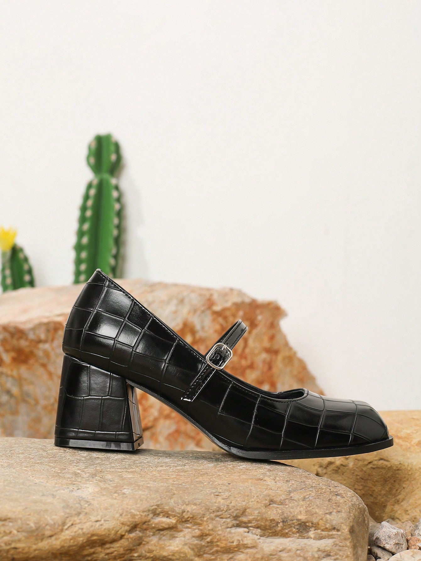 صندل موضة ربيع وخريف ذو كعب سميك بتصميم نقش الحجر المنسوج، بتصميم كعب عالي مربع، أسود مناسب لارتداء المكتب والعمل