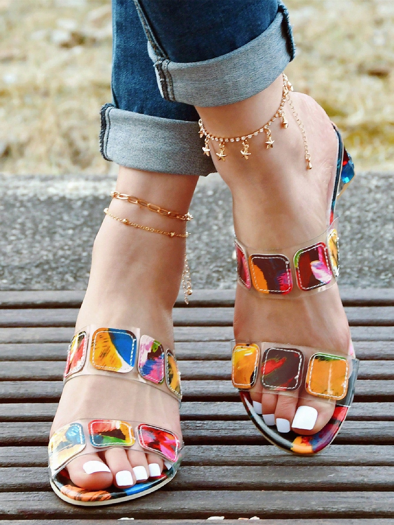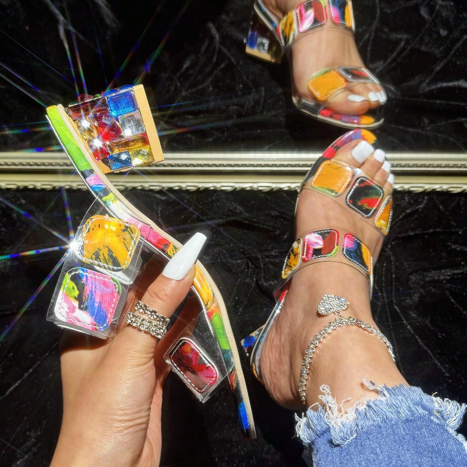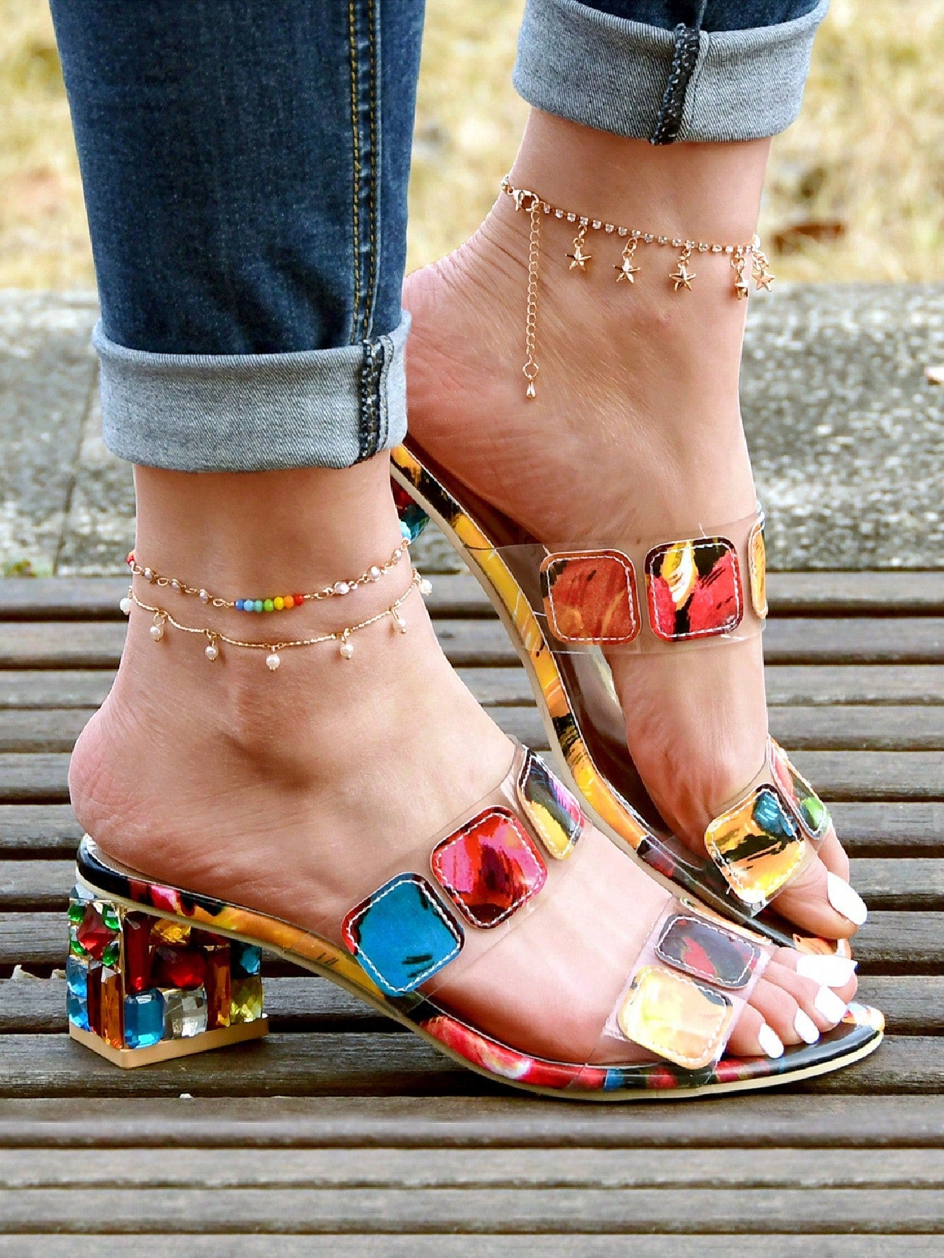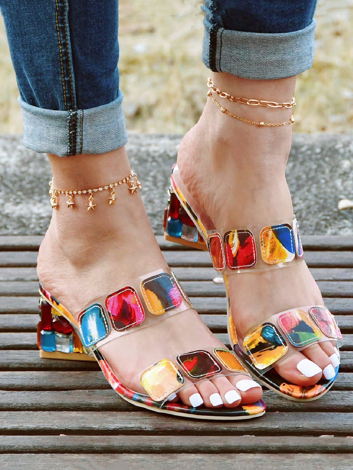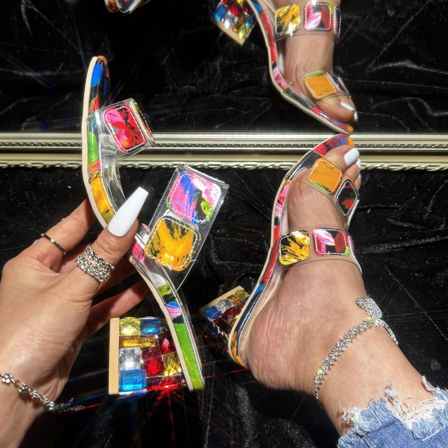 صندل نسائي بكعب عالٍ مكتنز يتميز بحجر الراين الملون، عصري وأنيق