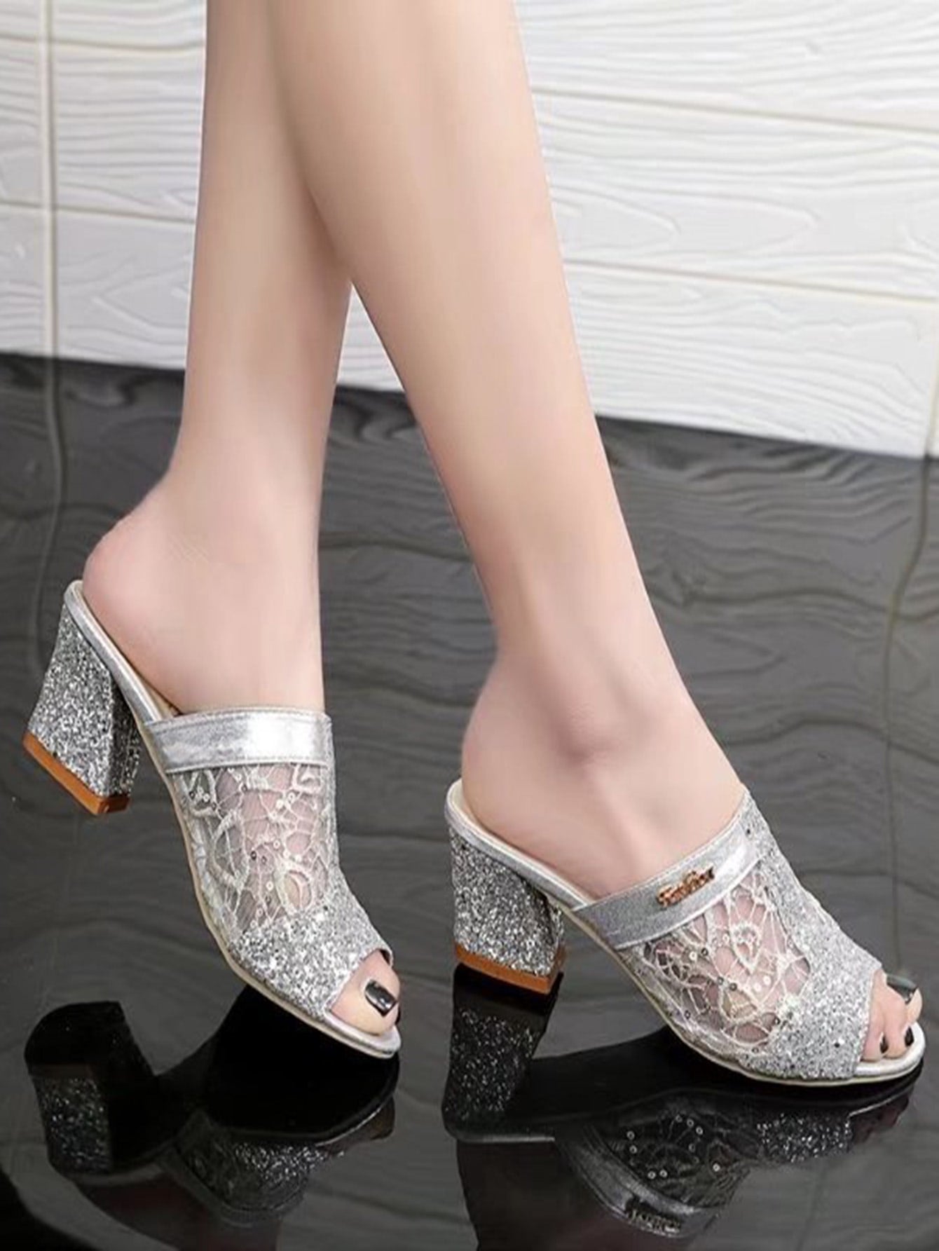صندل نسائي شبكي مزين بالترتر مزين بمقدمة مفتوحة بكعب مكتنزة وصنادل بكعب مأدبة براقة