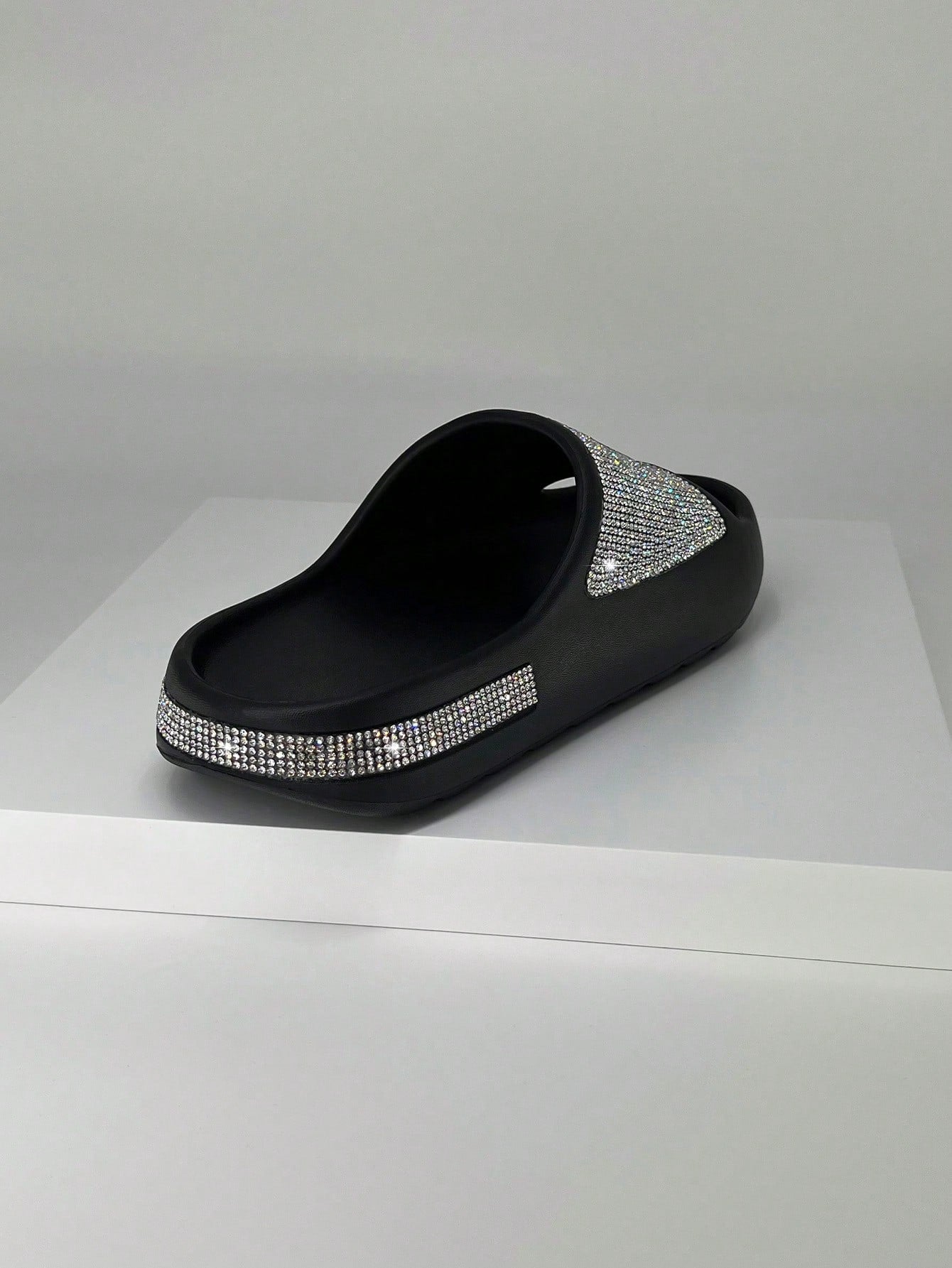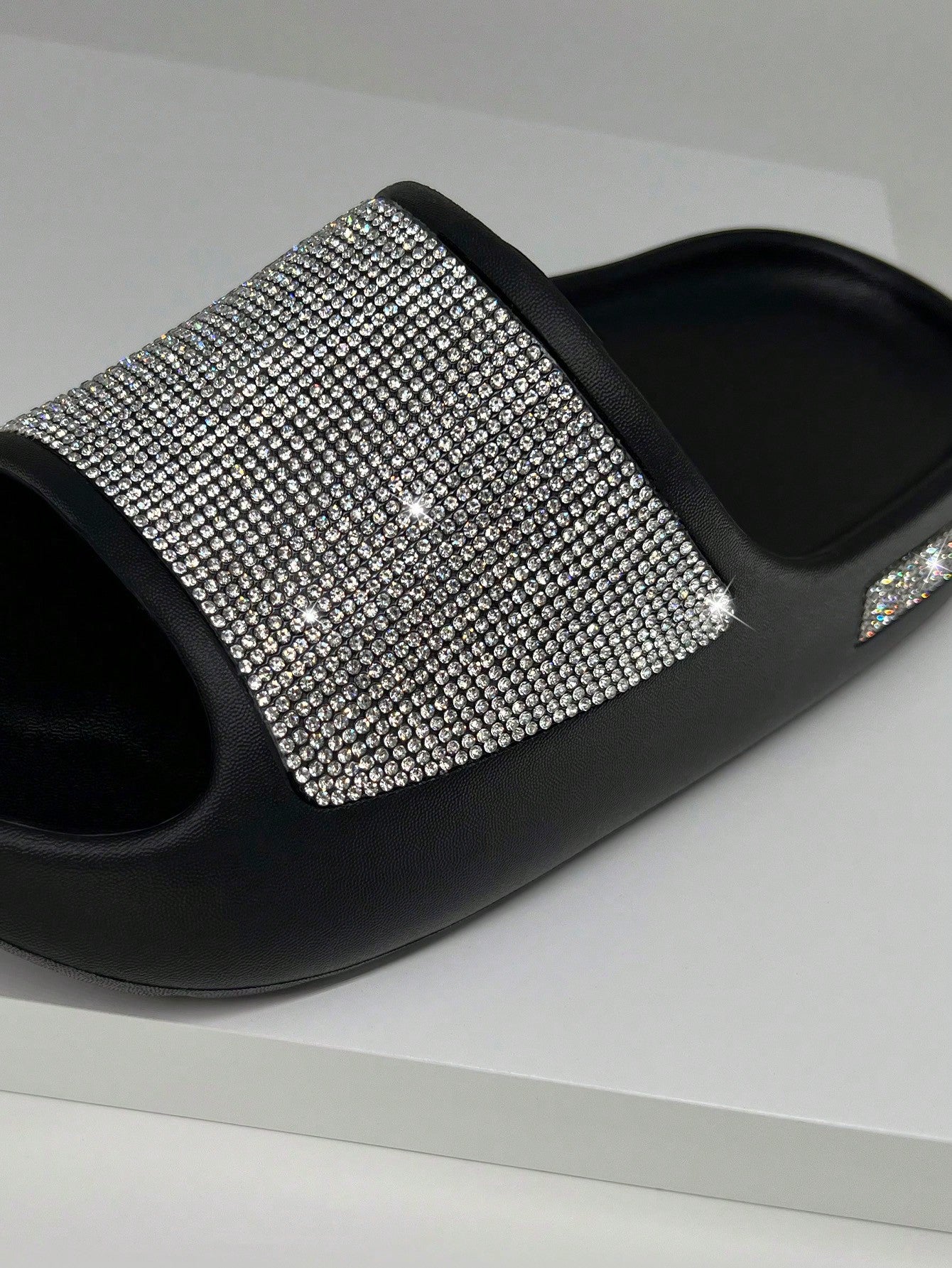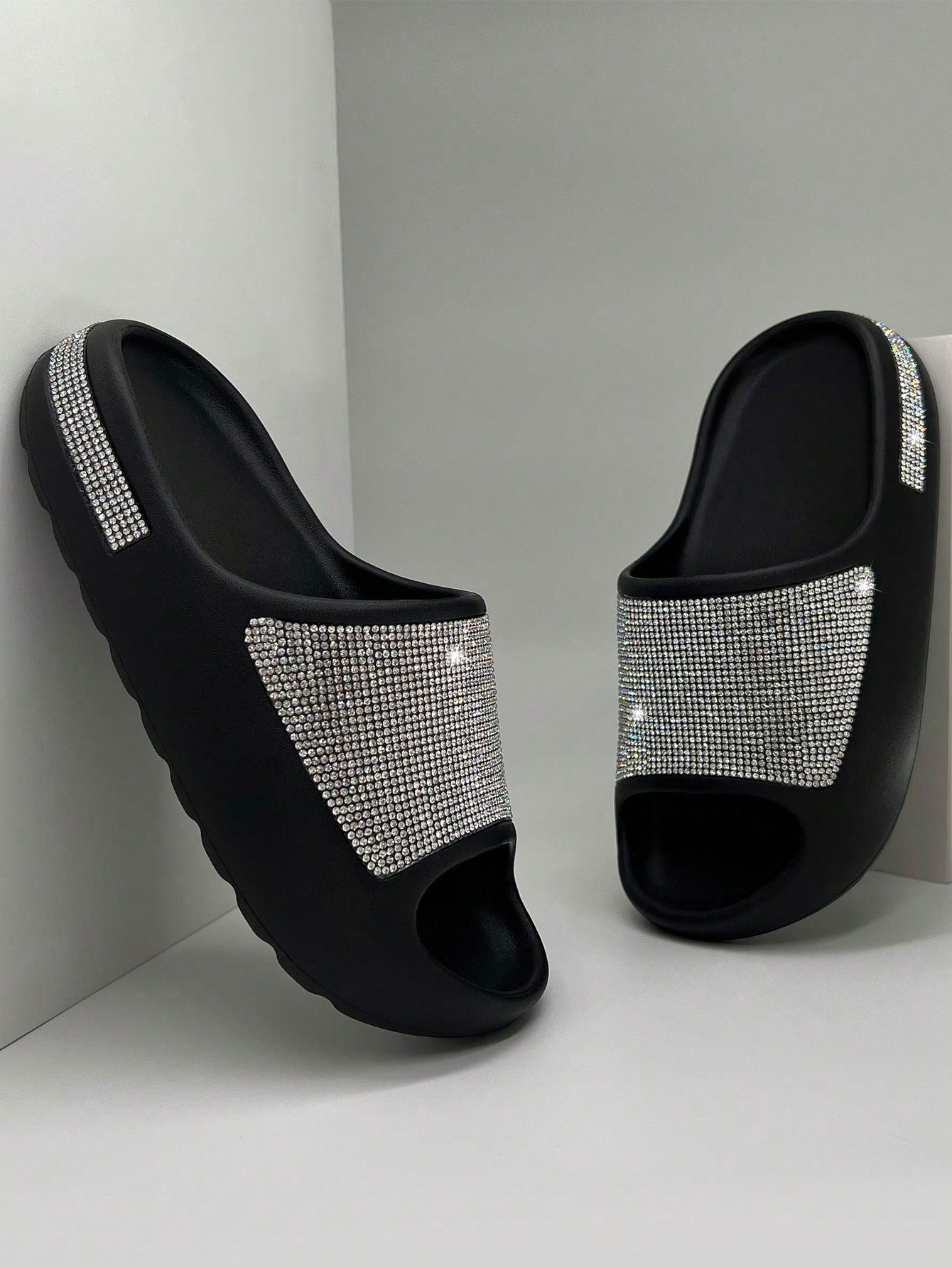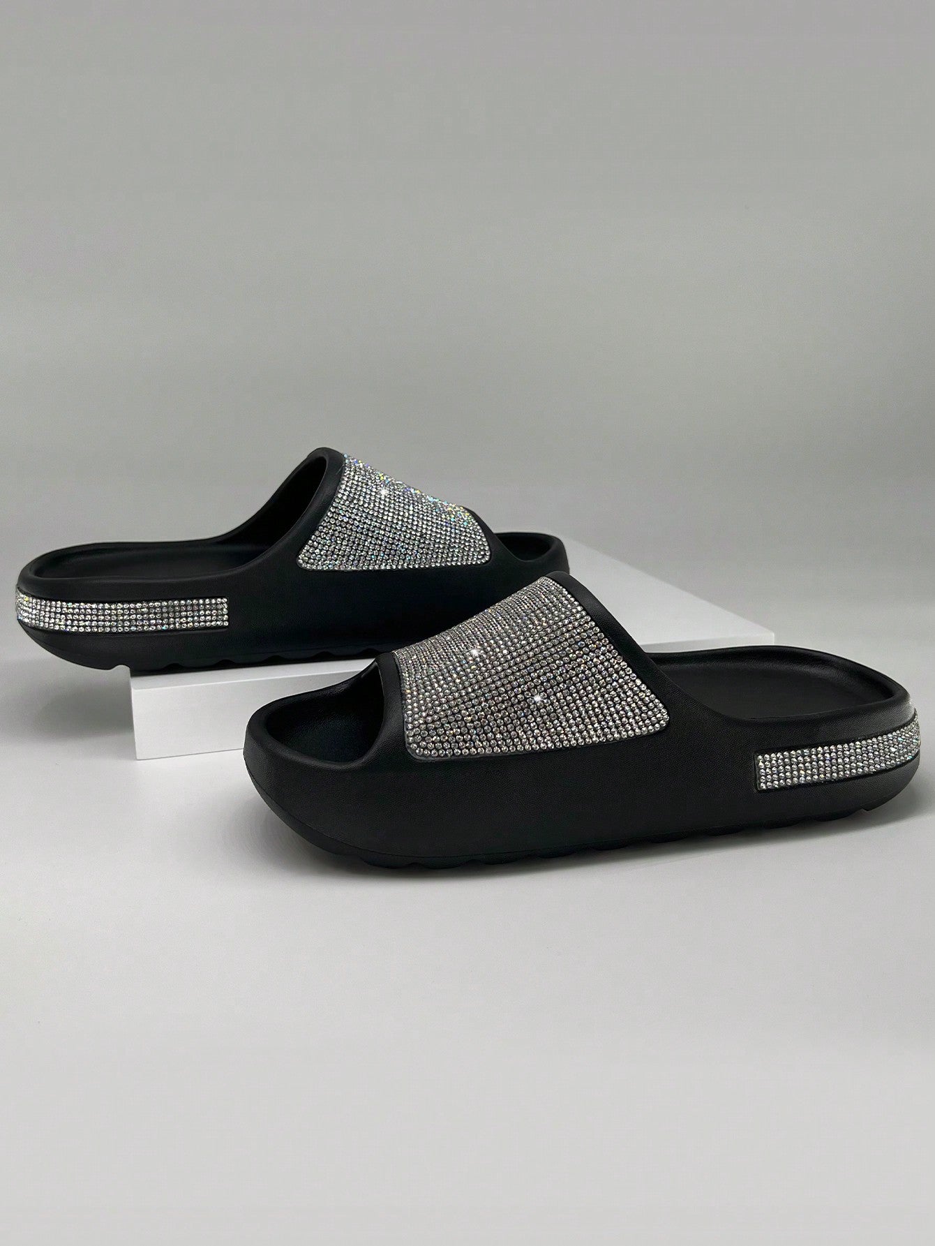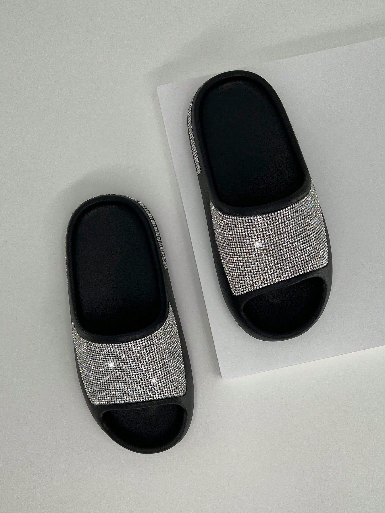 صندل نسائي مسطح بحجر الراين ونعل سميك، شبشب خارجي أنيق، أسود