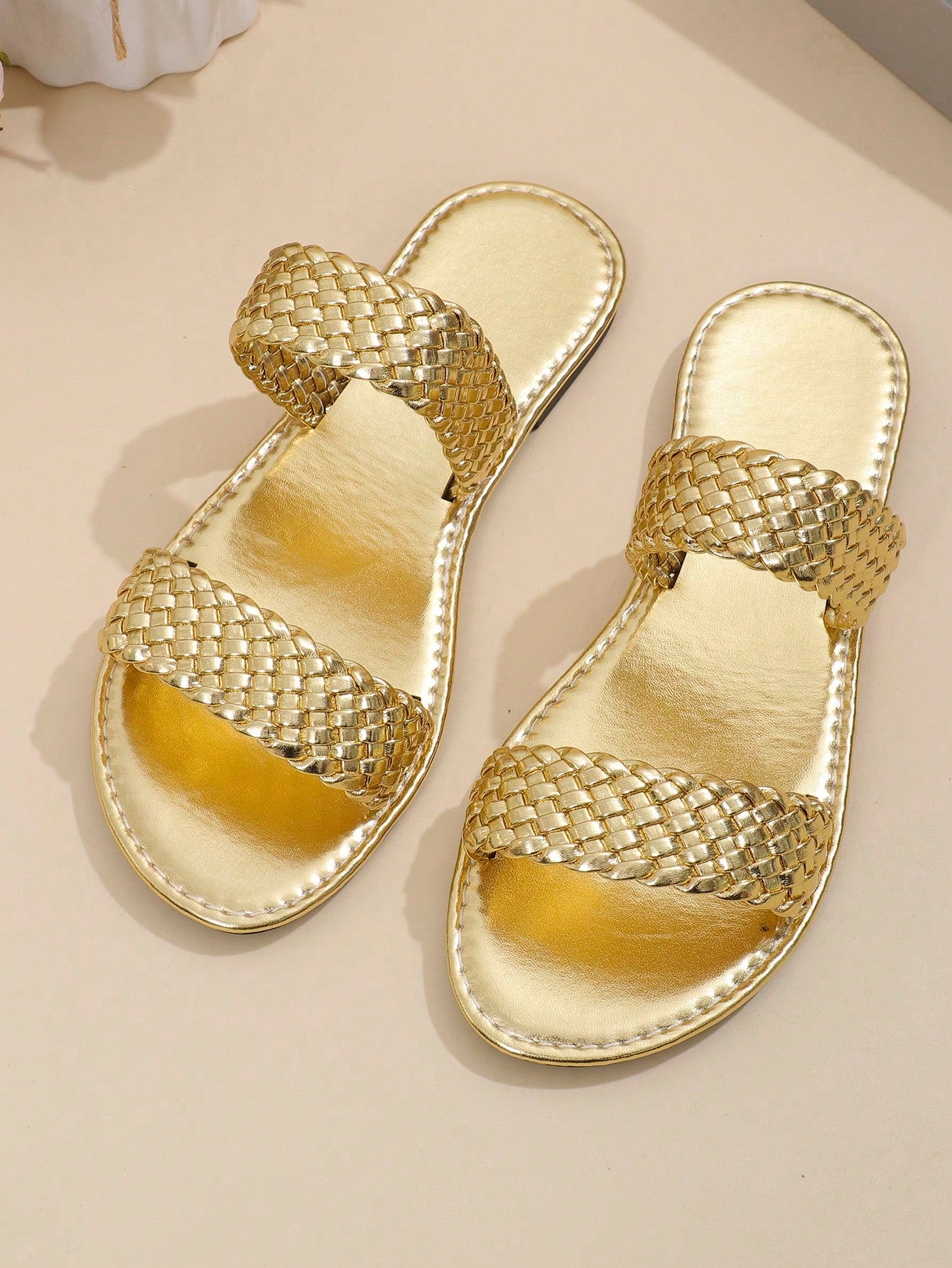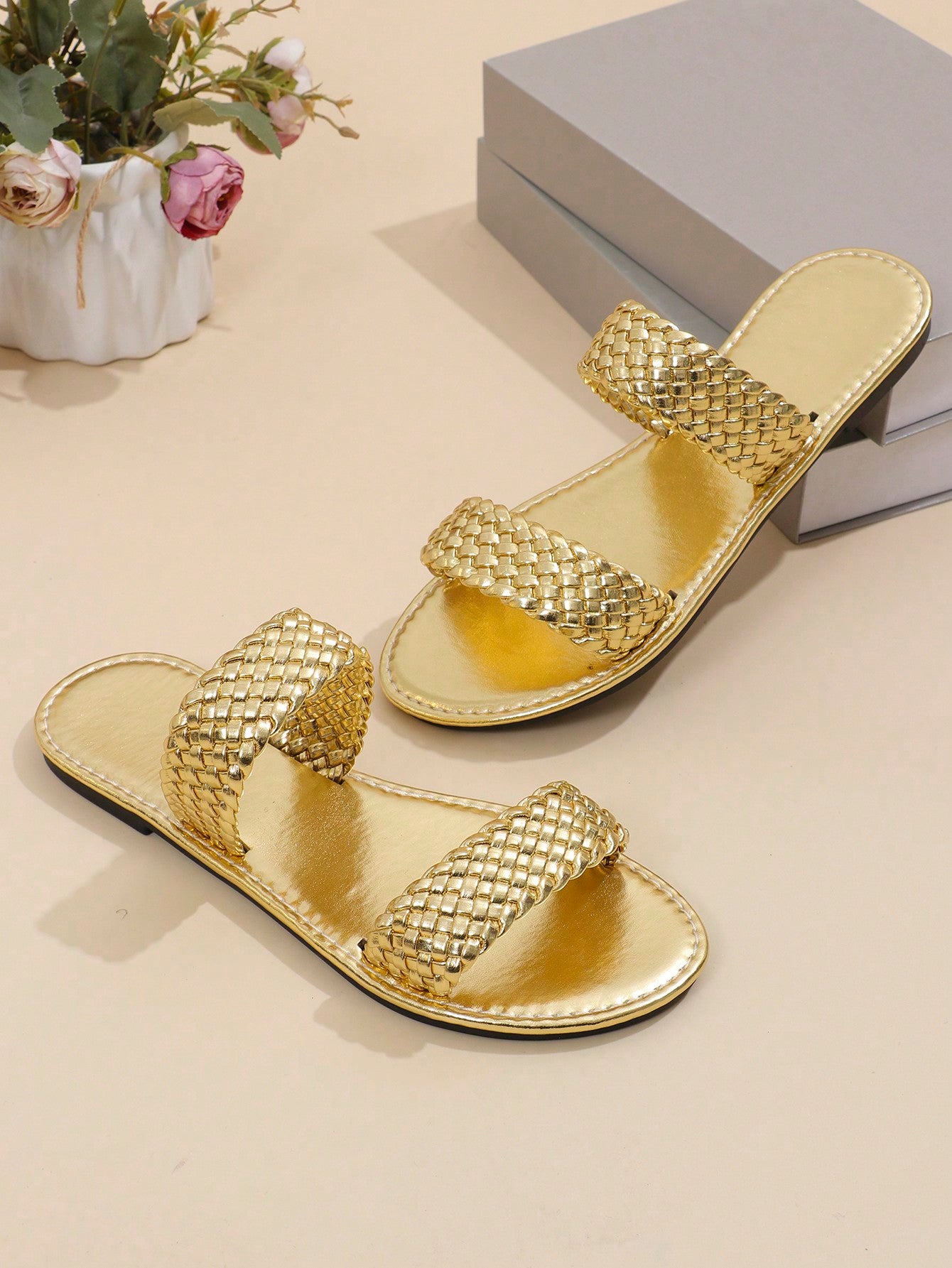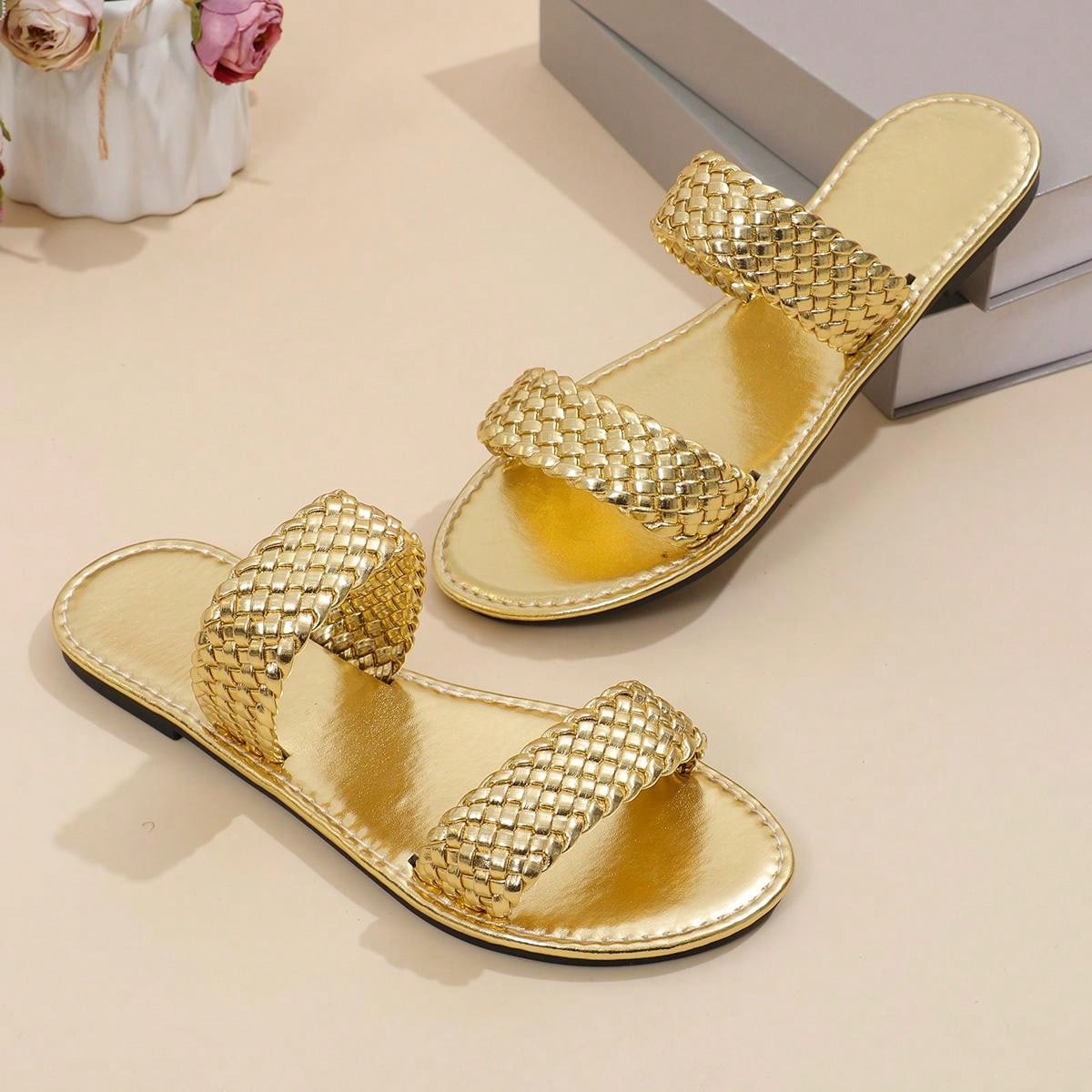 صندل نسائي مسطح محبوك بأصبع دائري جديد بنمط بسيط من الخط الواحد، مناسب للشاطئ