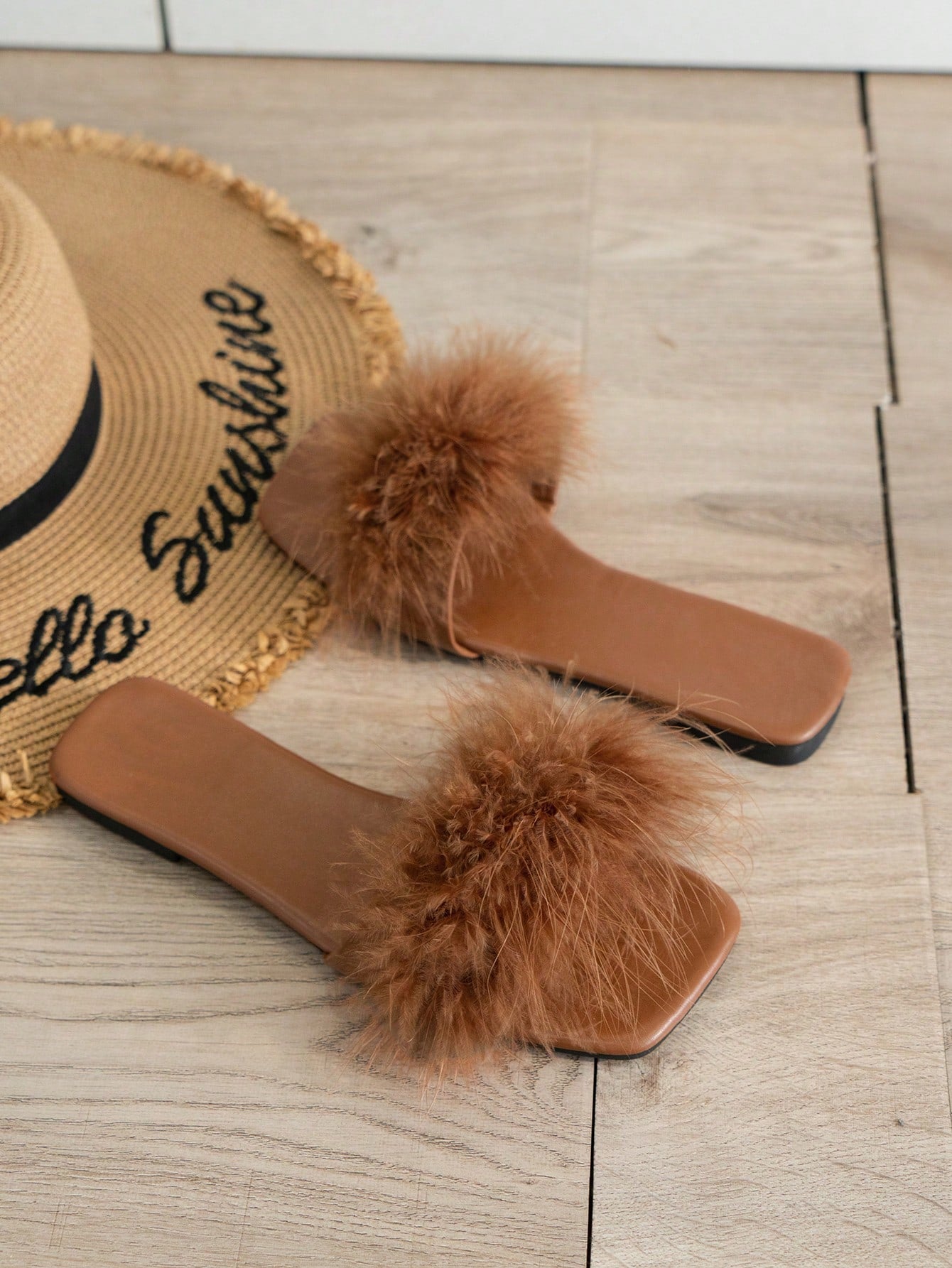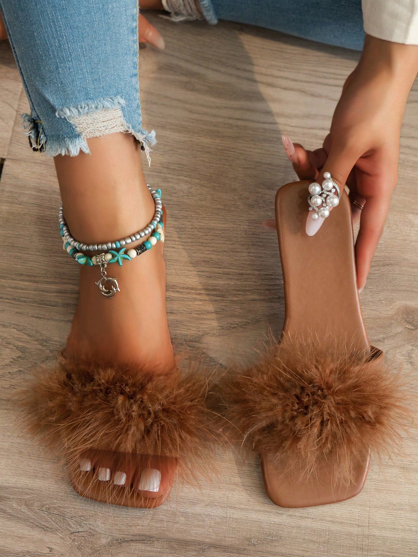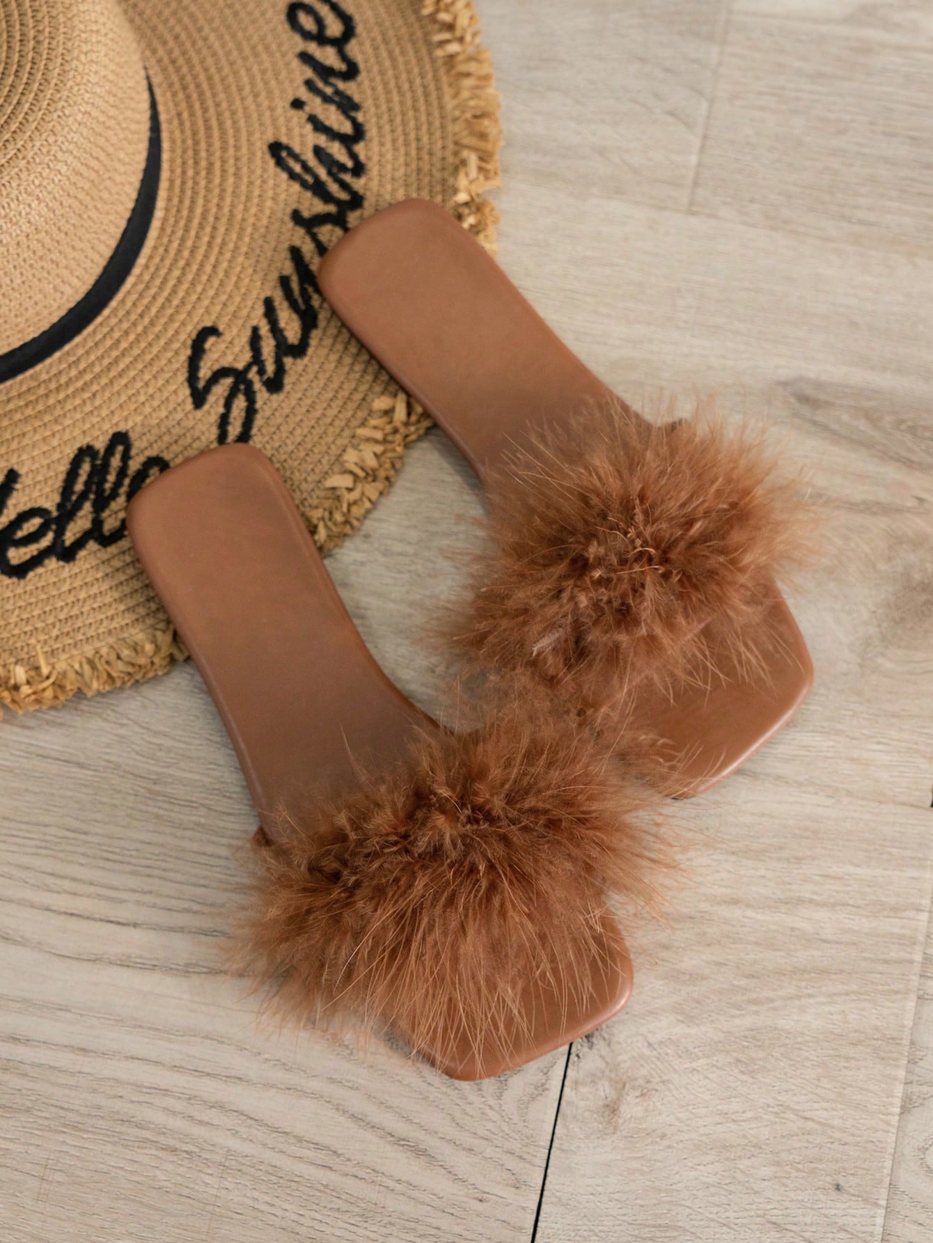 صندل نسائي مسطح منفوش ديكور ، صنادل براقة باللون البني