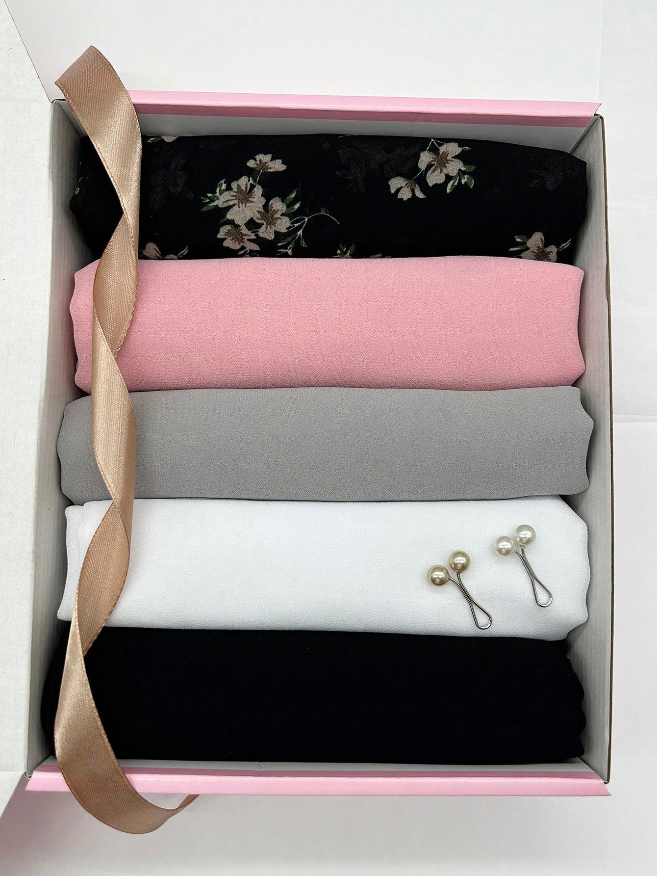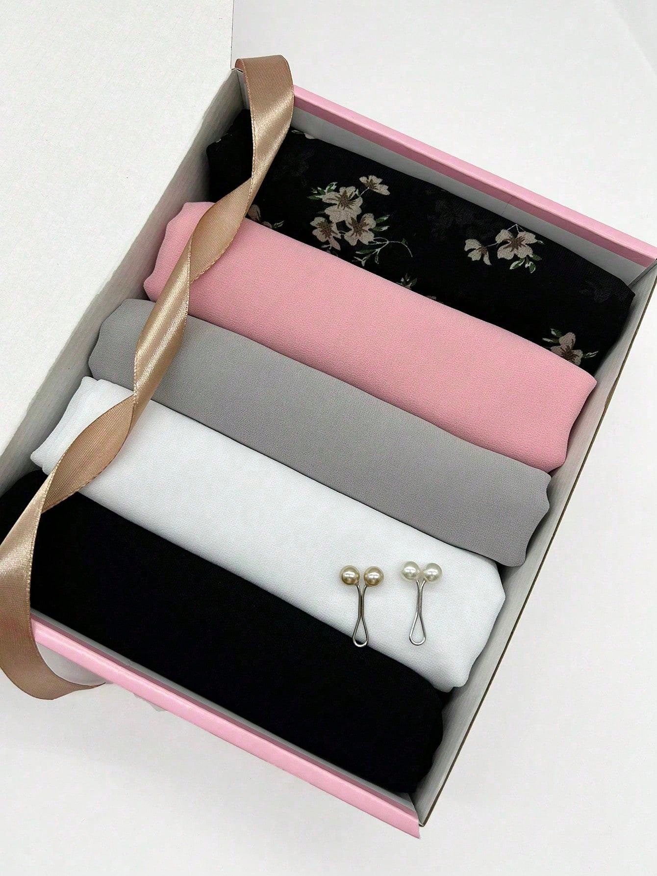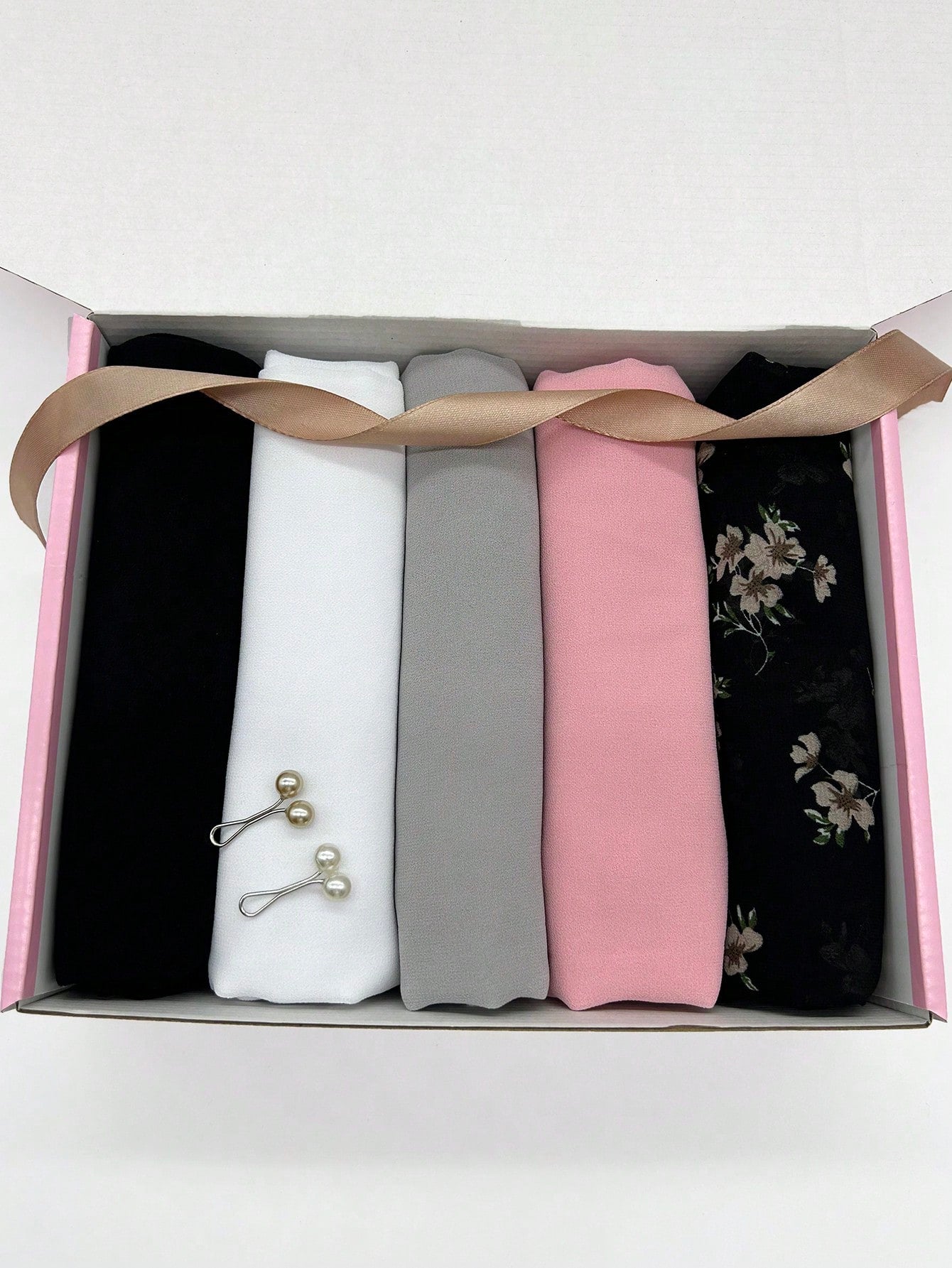 صندوق مجموعة حجاب شيفون للنساء المسلمات - 5 قطع من أوشحة الحجاب المطبوعة قطعتين من القماش الصلب غير اللكم، فرشاة إسفنجة، رف تصريف، رف تخزين الحوض