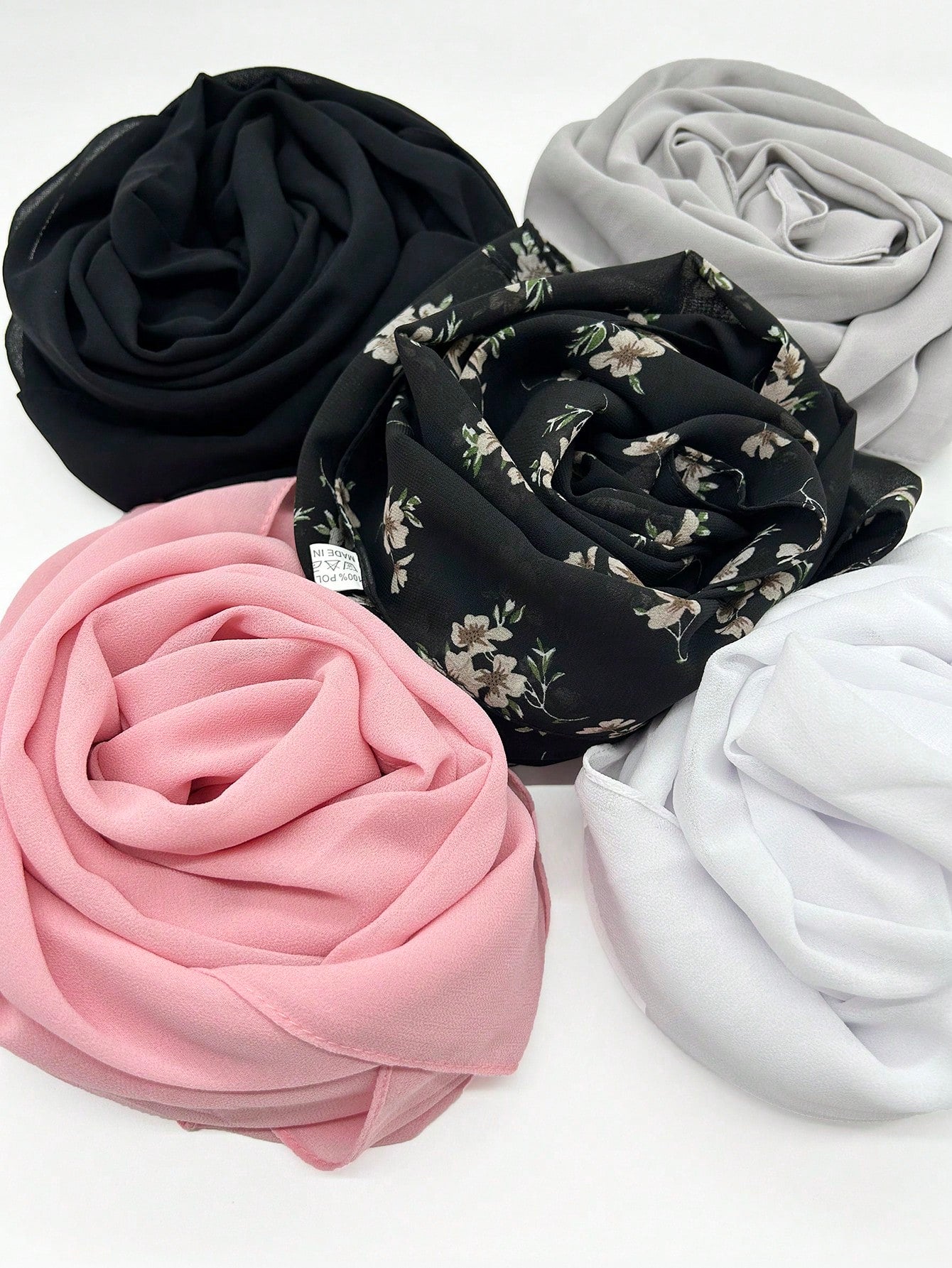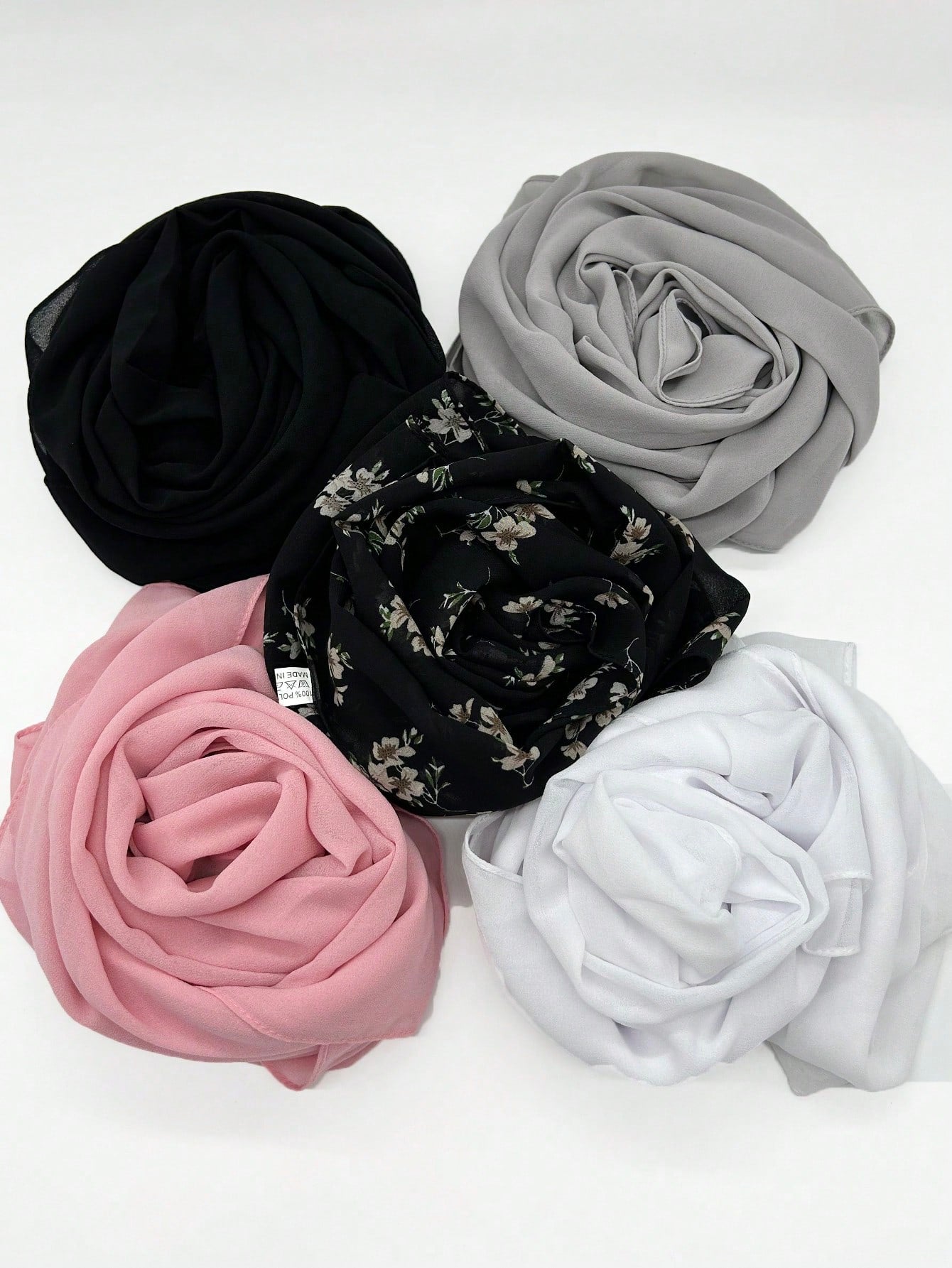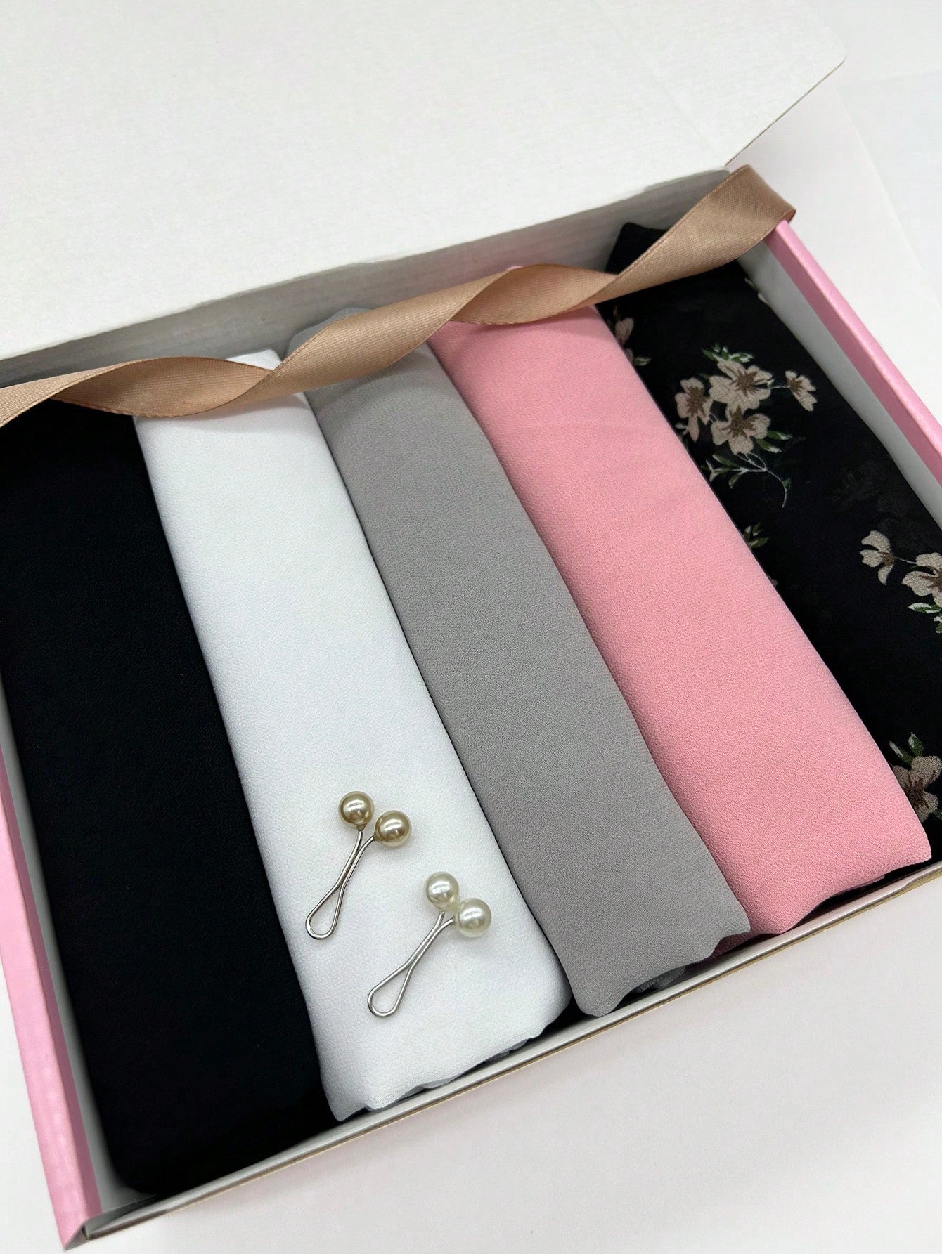 صندوق مجموعة حجاب شيفون للنساء المسلمات - 5 قطع من أوشحة الحجاب المطبوعة قطعتين من القماش الصلب غير اللكم، فرشاة إسفنجة، رف تصريف، رف تخزين الحوض
