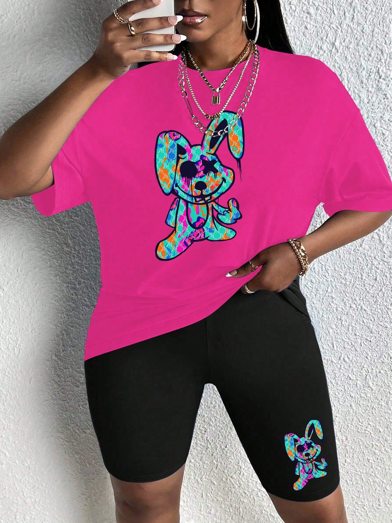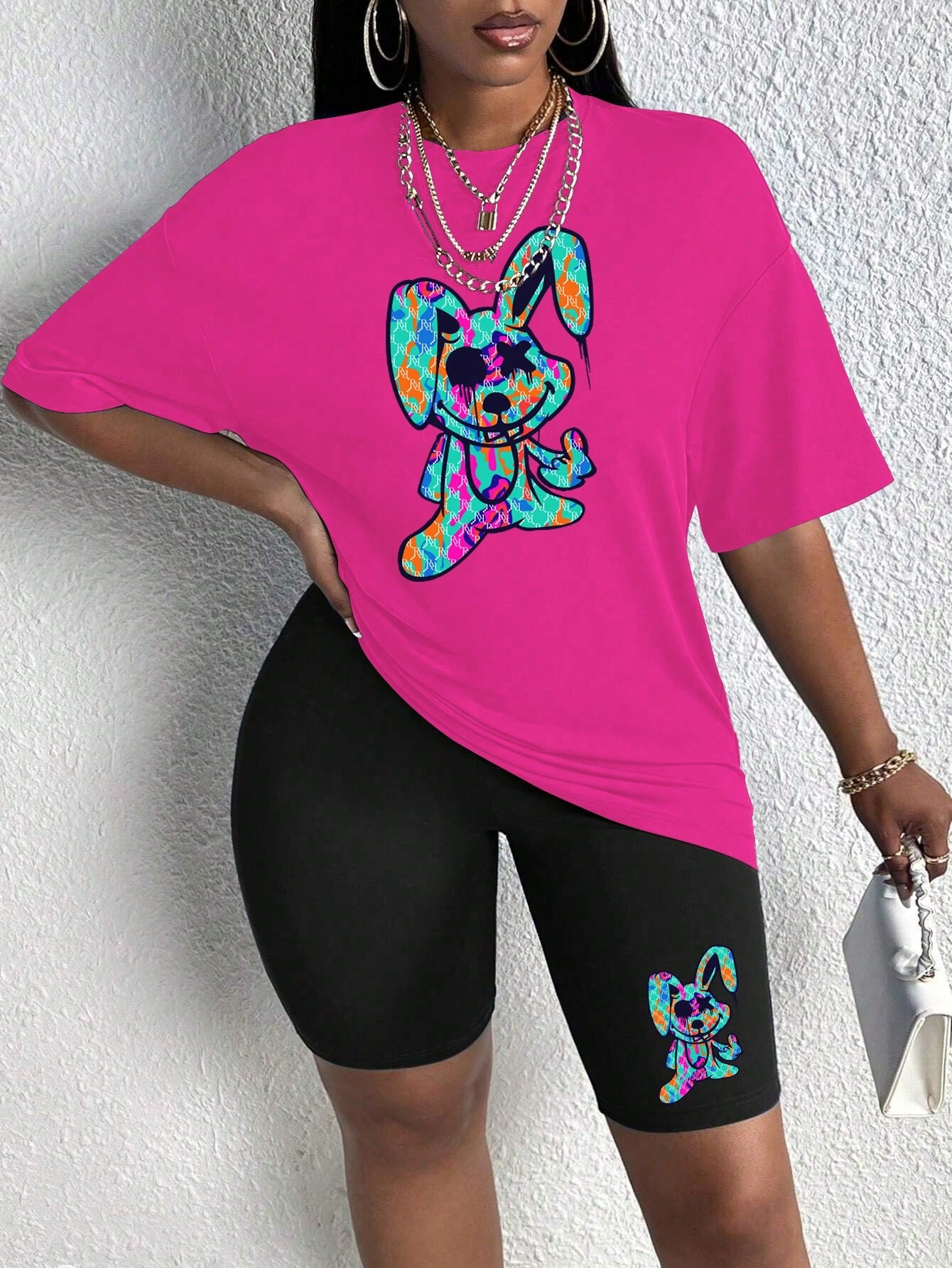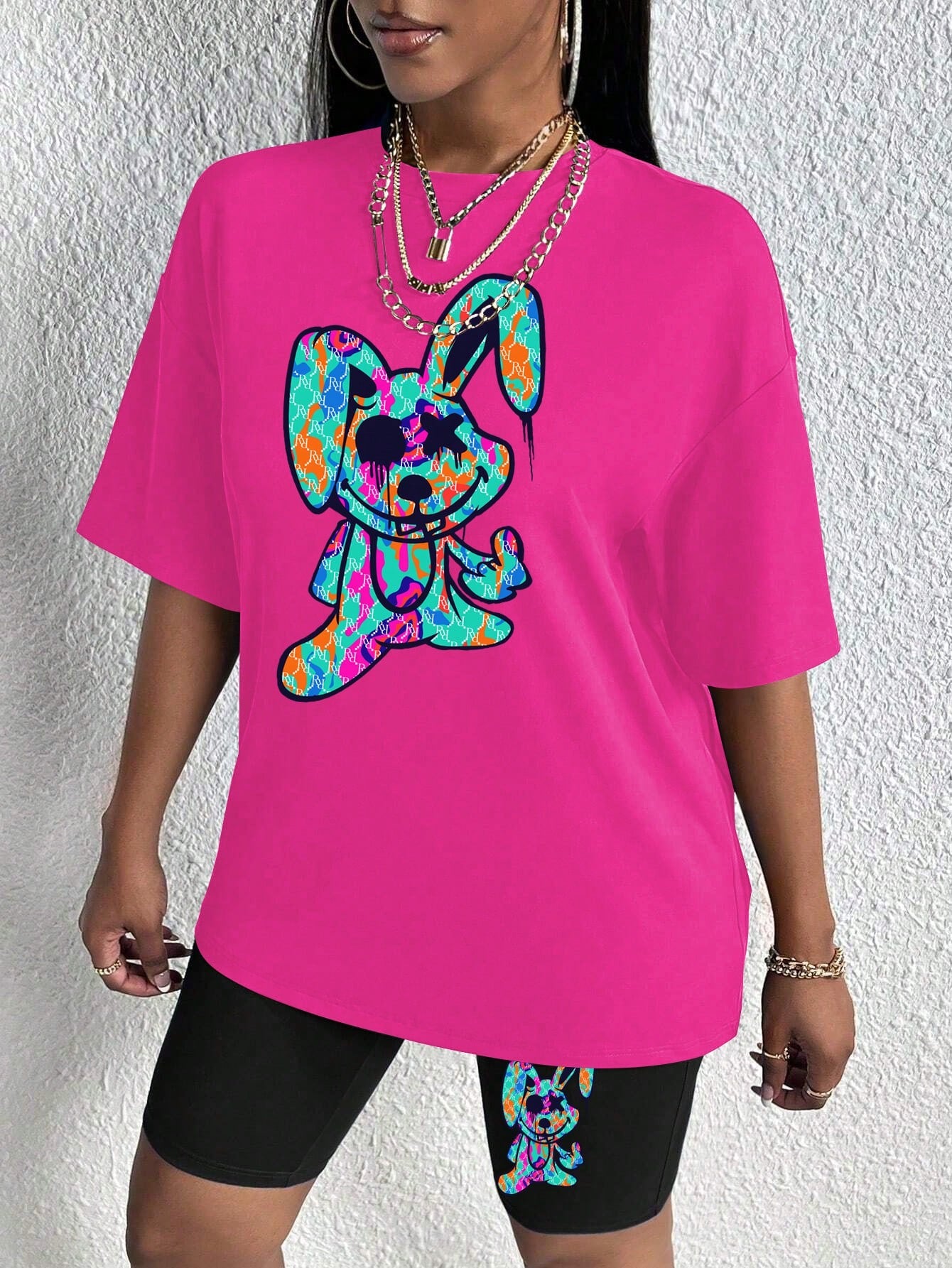 طقم تي شيرت نسائي مطبوع بأرنب الكرتون وسراويل قصيرة للدراجات