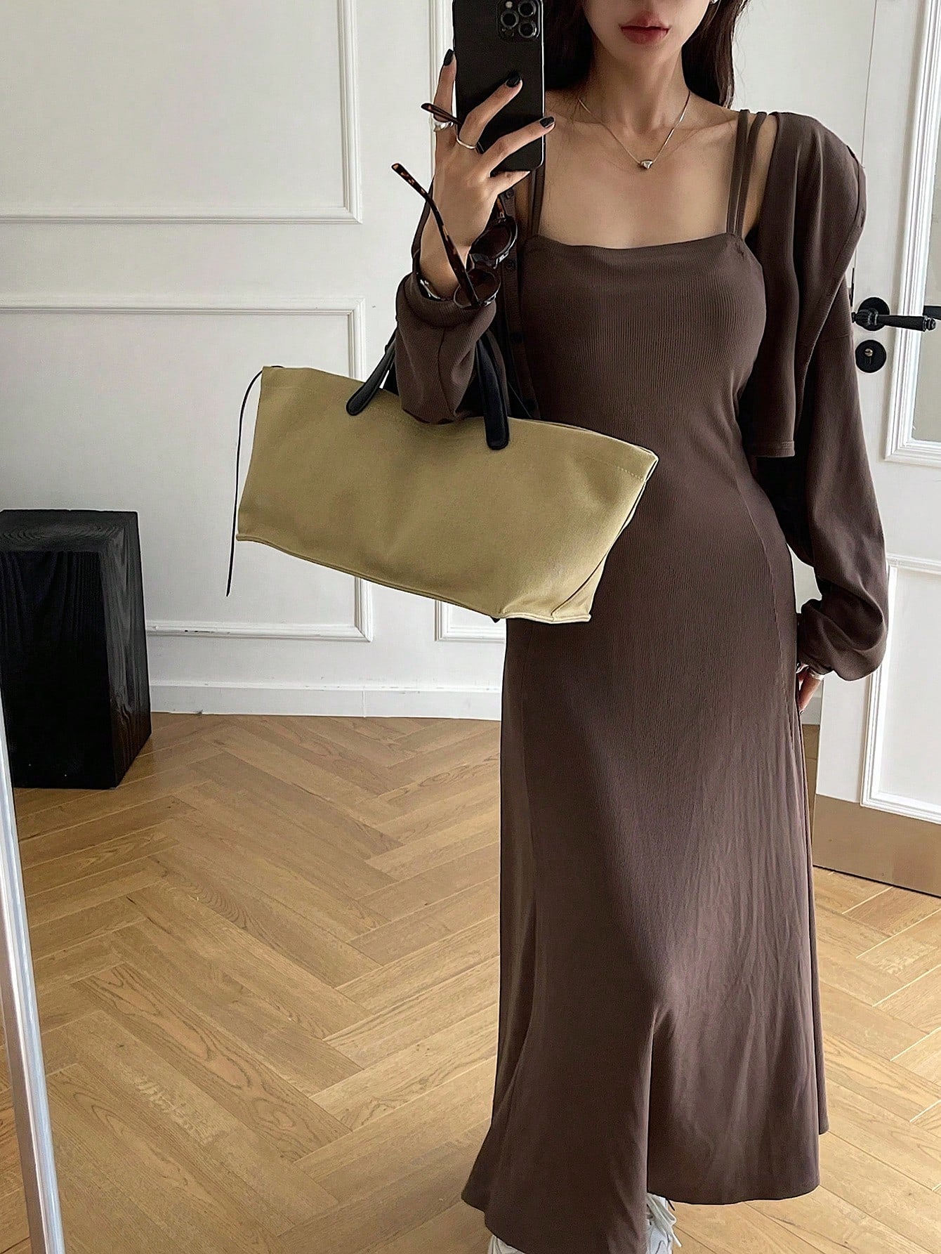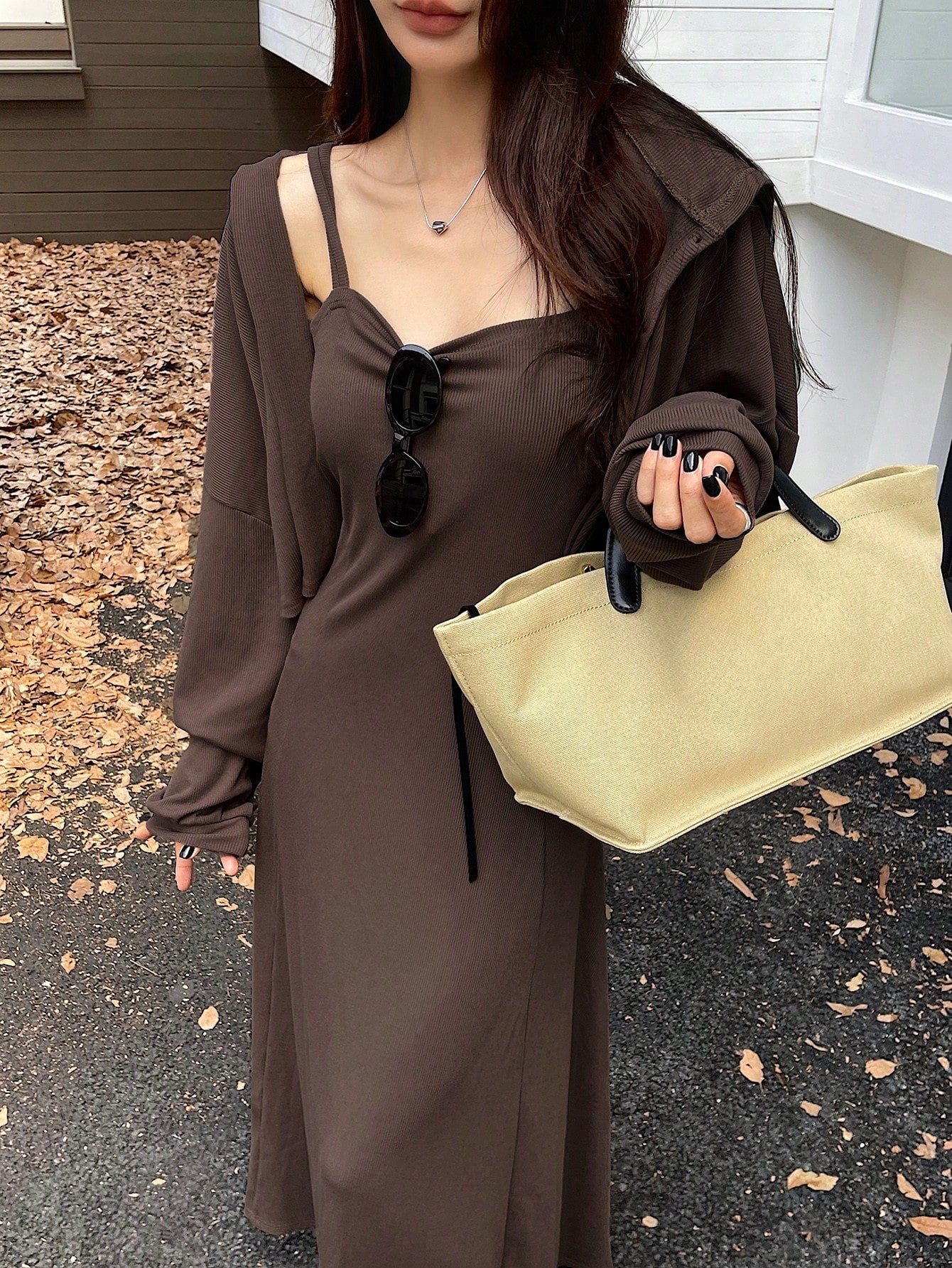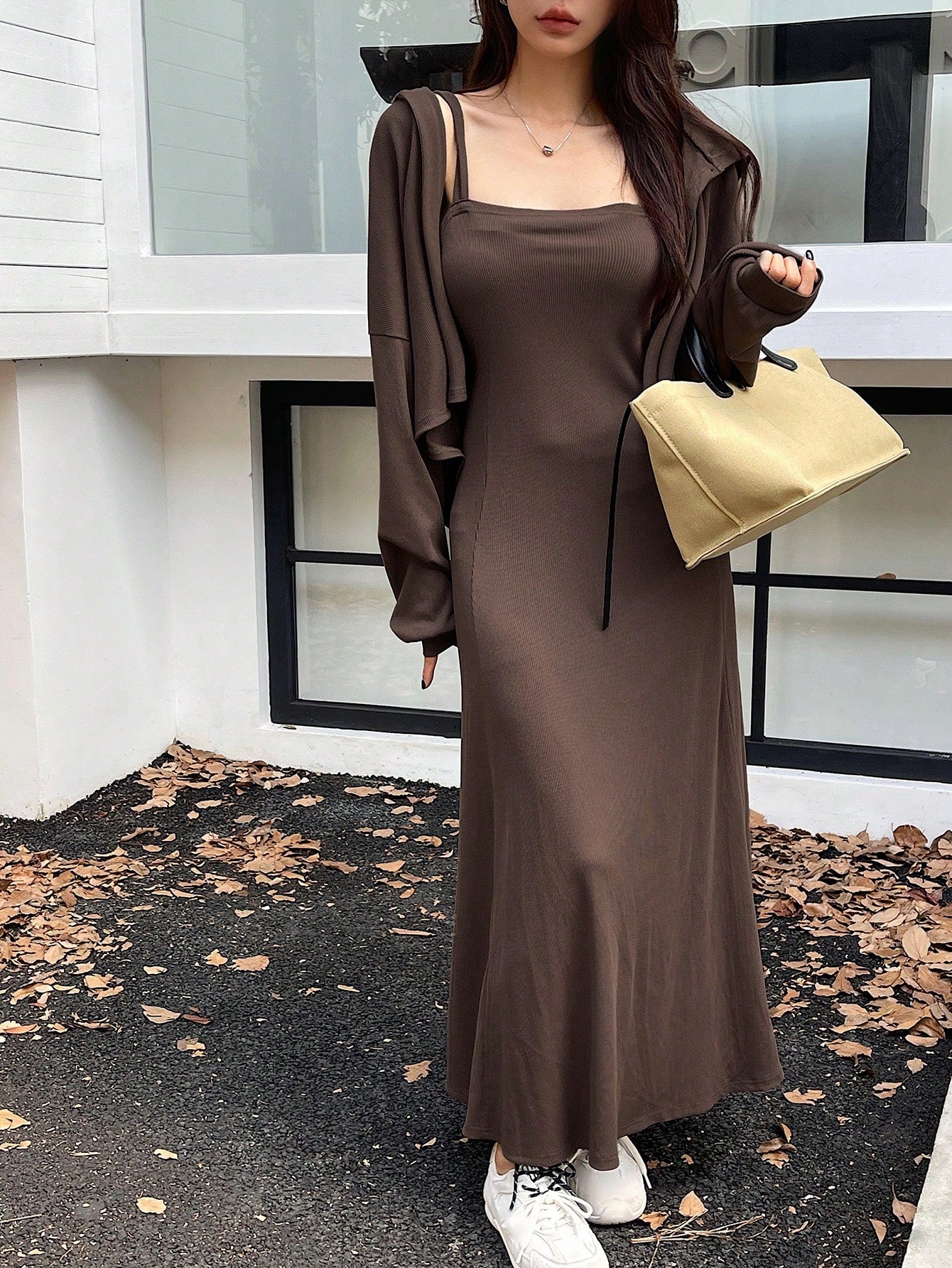 طقم فستان أحادي اللون بدون أكمام وجاكيت ذو أكمام طويلة بقلنسوة 2قطعة