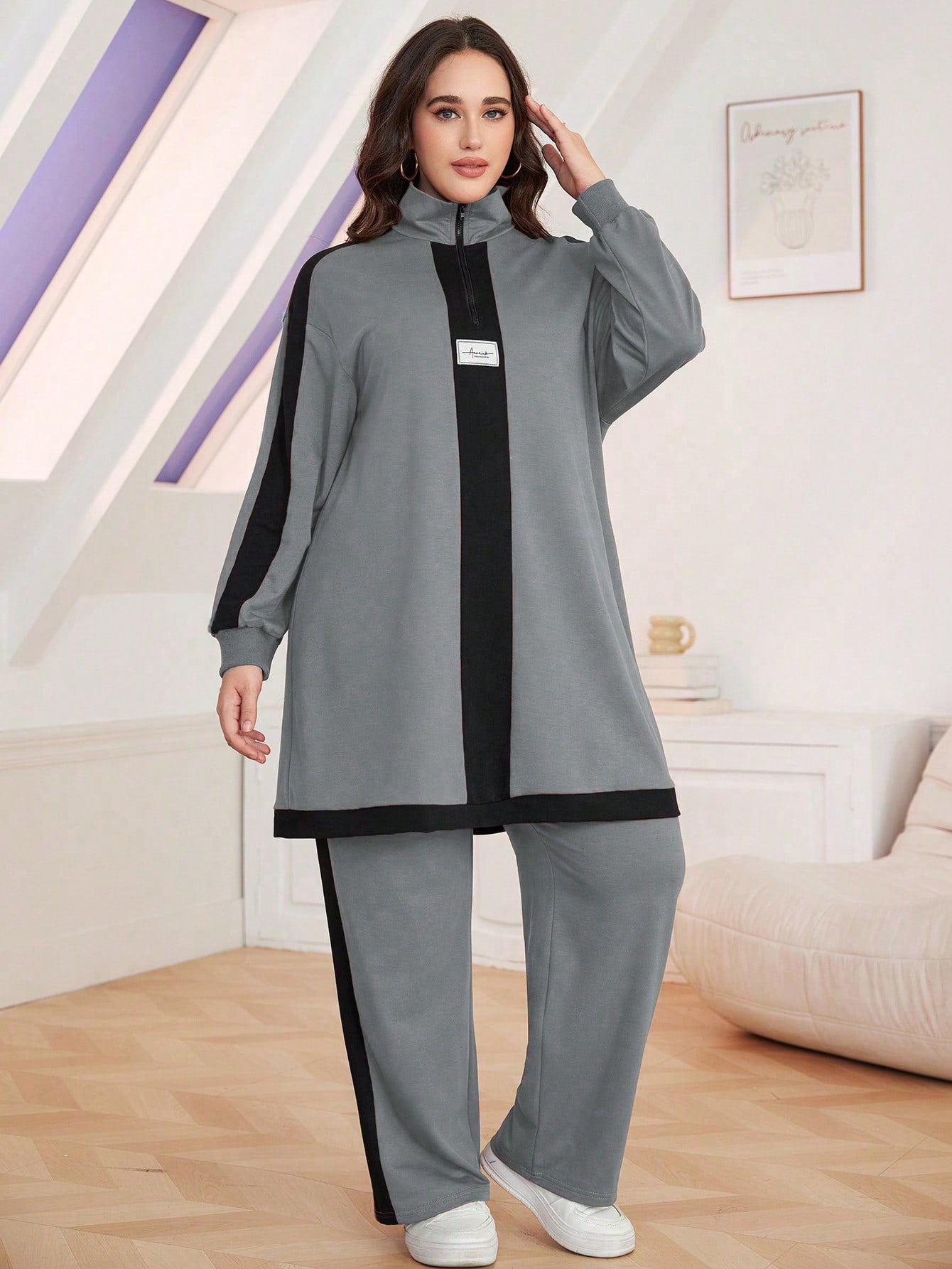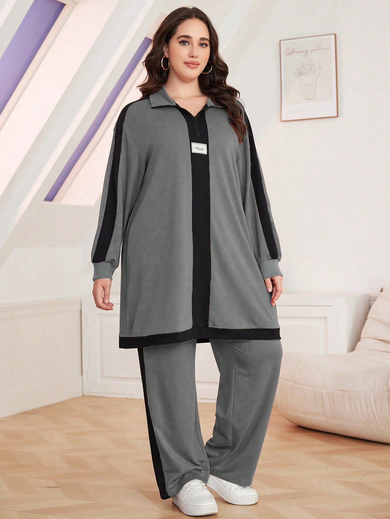 طقم قطعتين كاجوال من ملابس علوية بأكمام طويلة وبنطلون طويل، ملائمة للمقاسات الكبيرة مع تصميم لوحات ملونة في الخريف