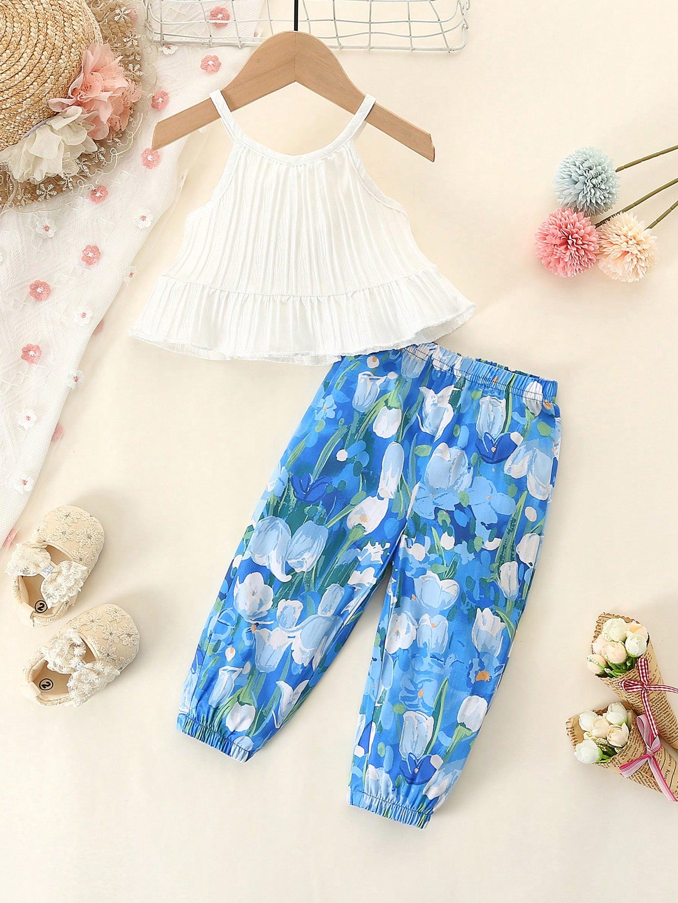 طقم قميص قصير للفتيات الصغيرات بنمط العطلة وسروال مزين بالزهور
