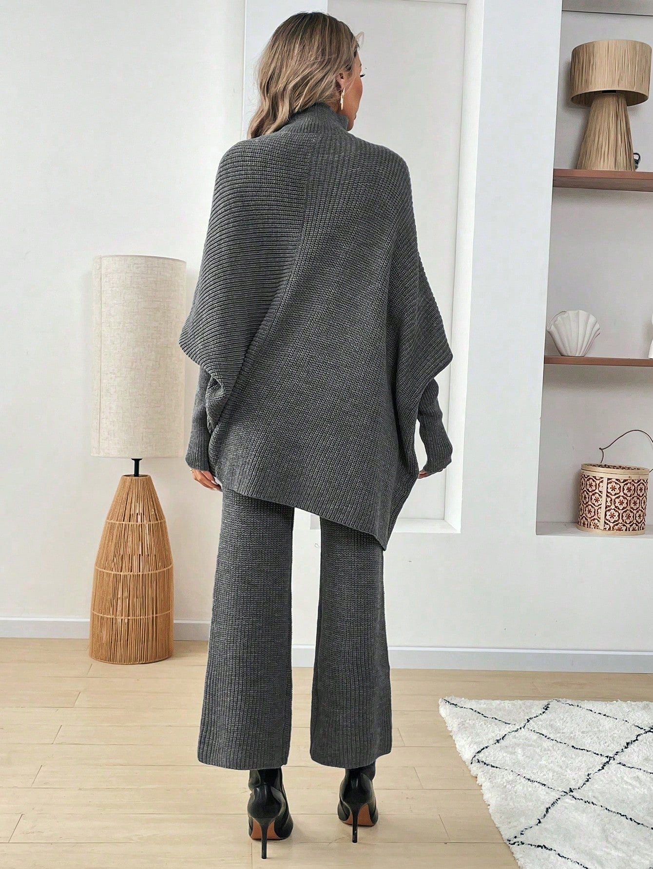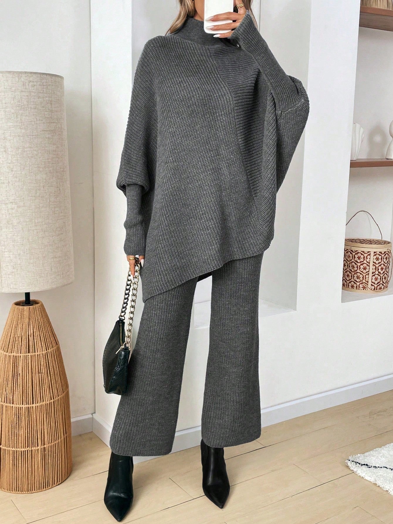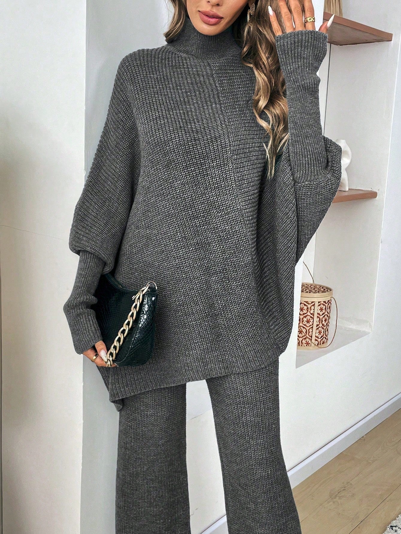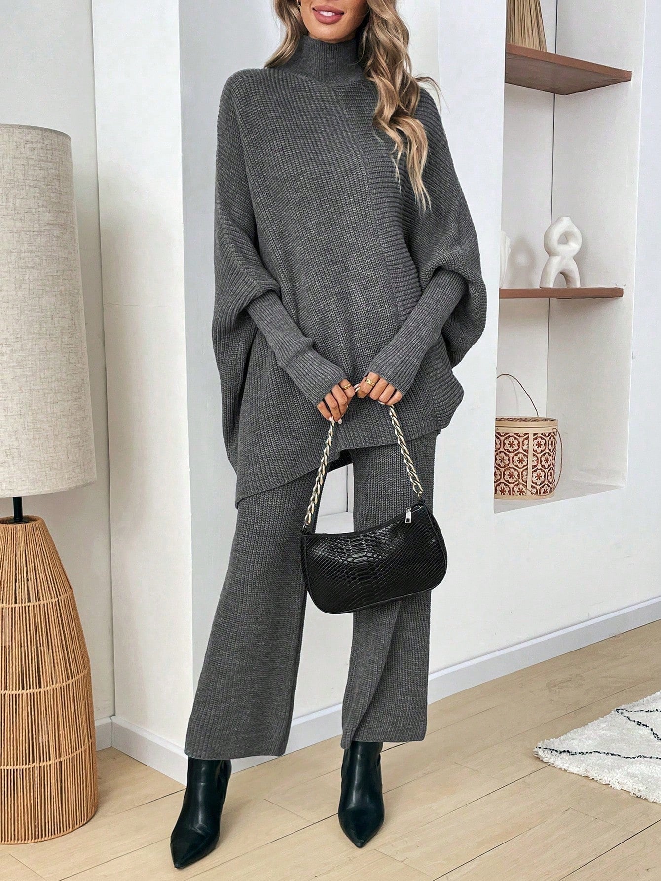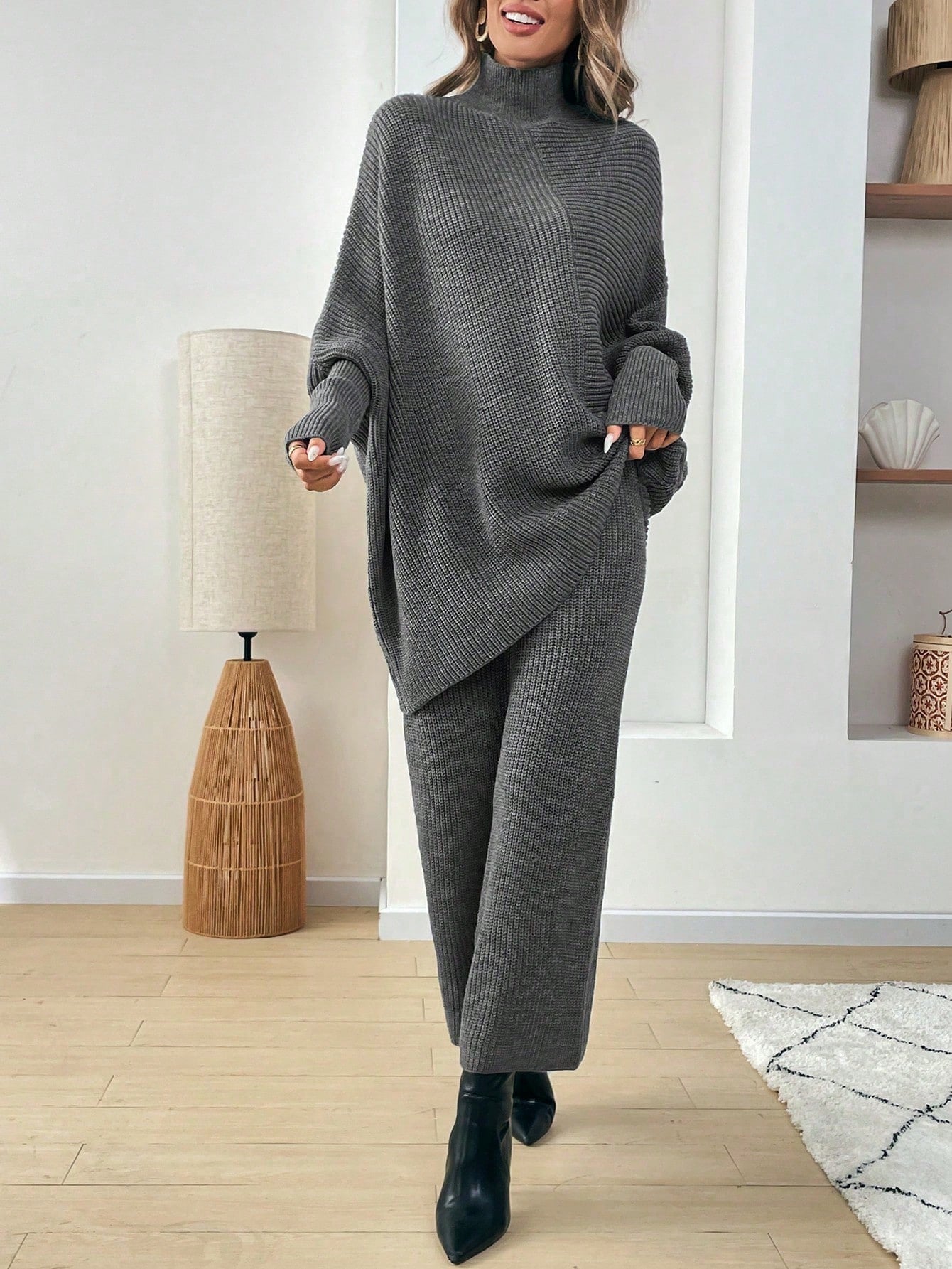 طقم كنزة صوفية واسعة بياقة رقبة صغيرة وبنطال قطعتين للنساء