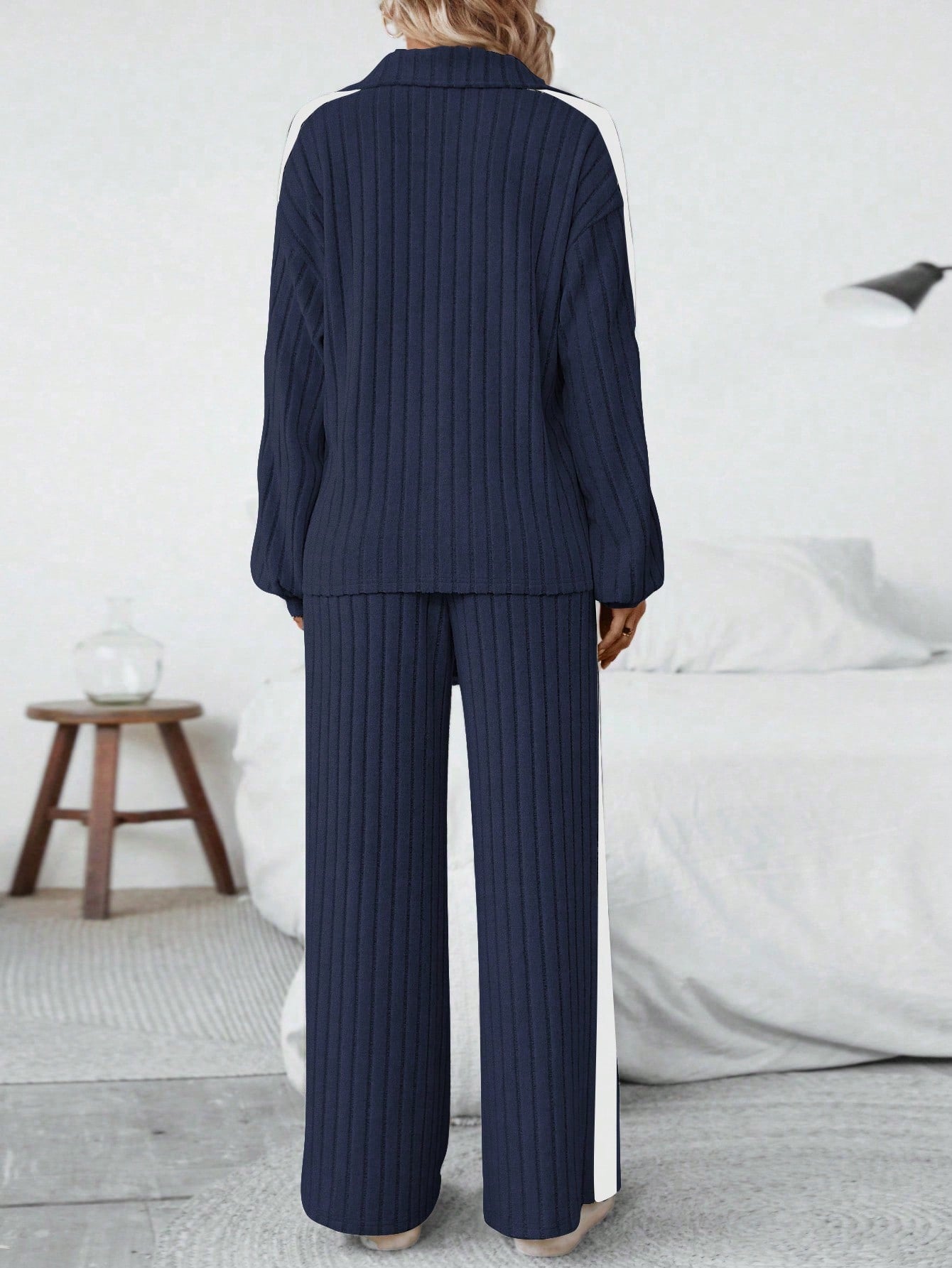 طقم كنزة وسروال منسوج مضلع بألوان متباينة