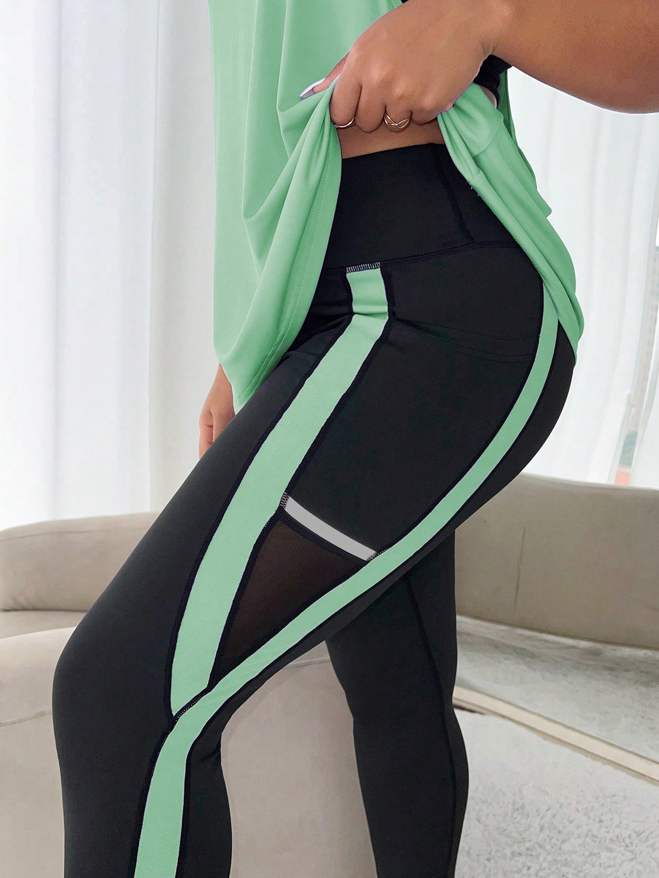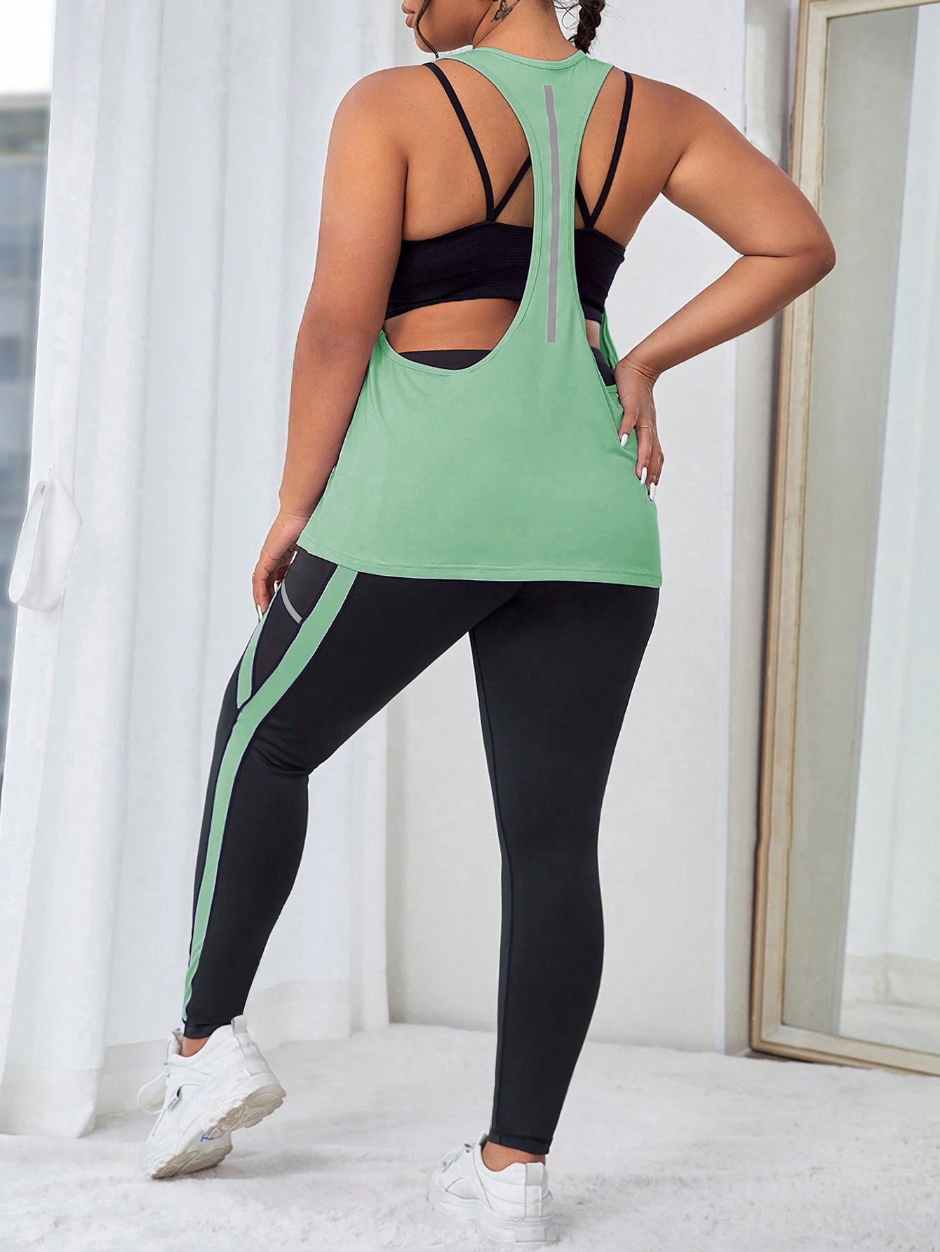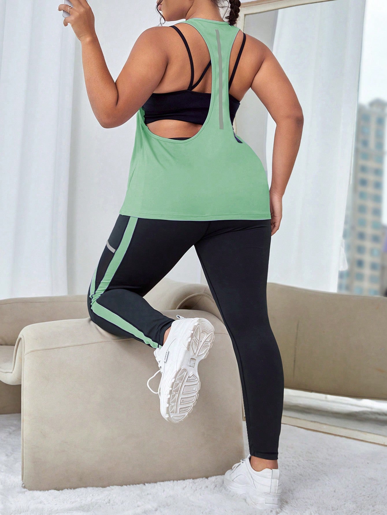 طقم لباس رياضي بشريط جانبي متباين مع جيب الهاتف الخليوي مقاس كبير