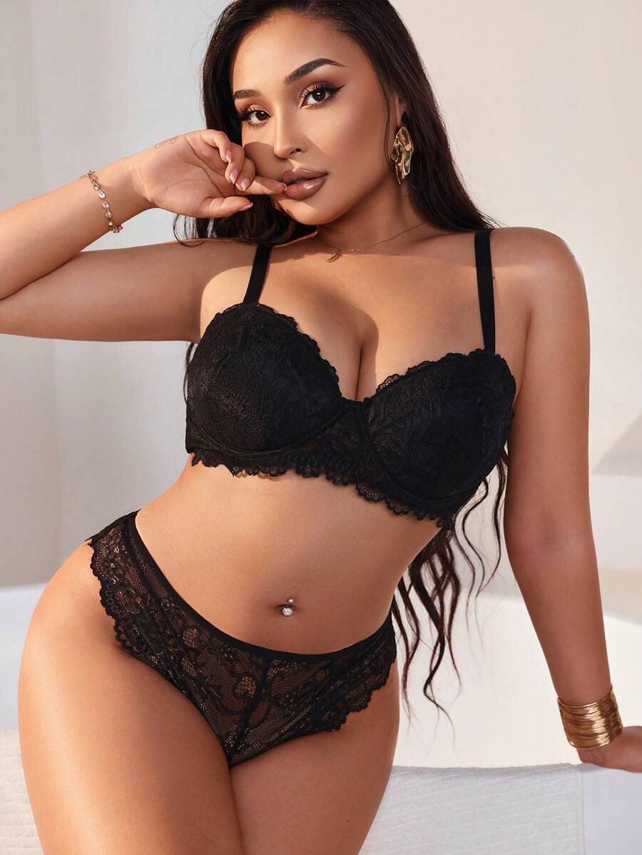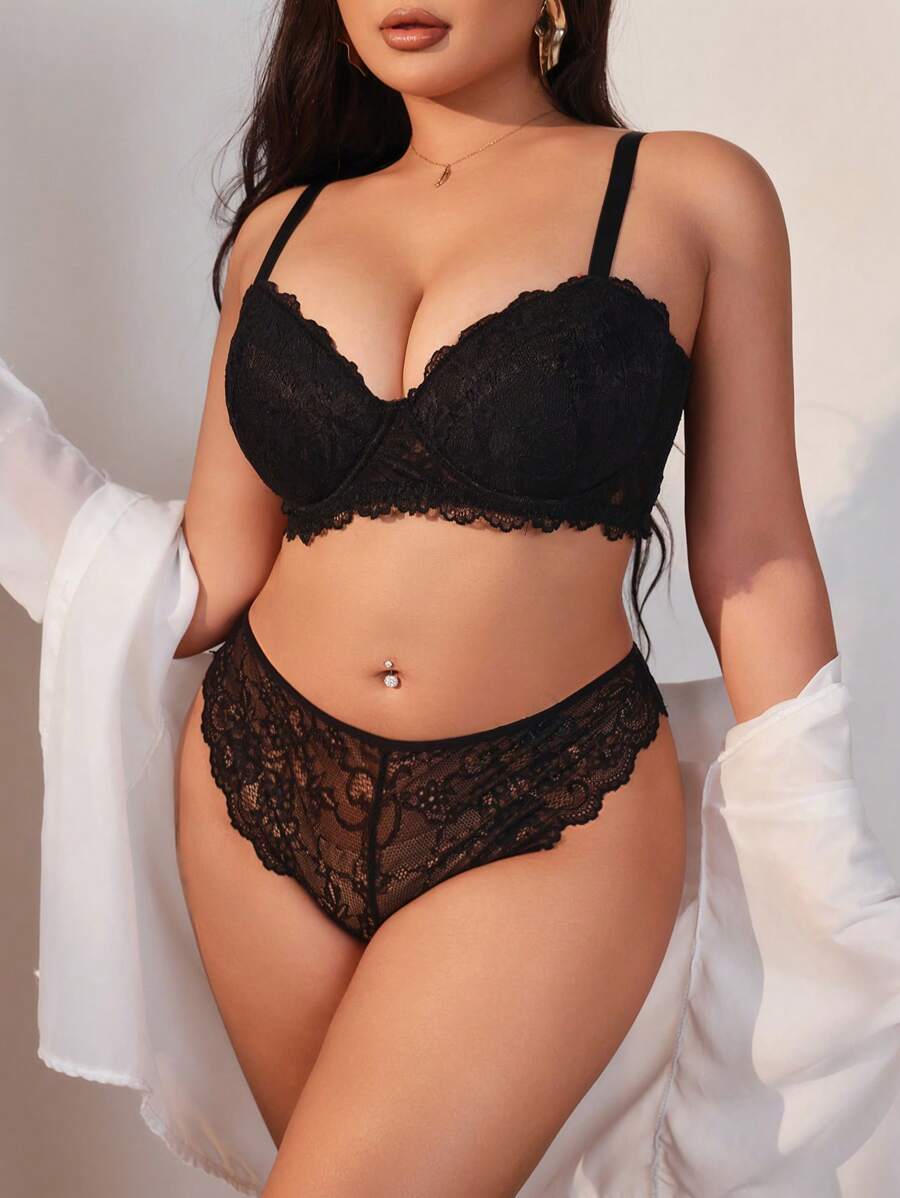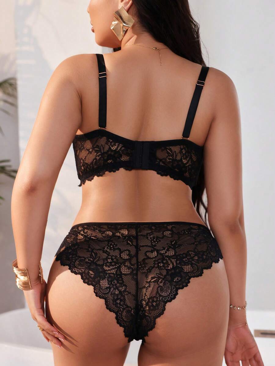 طقم ملابس داخلية دانتيل بحمالة وسروال بتصميم لون واحد مع سلك من الأحجام الكبيرة