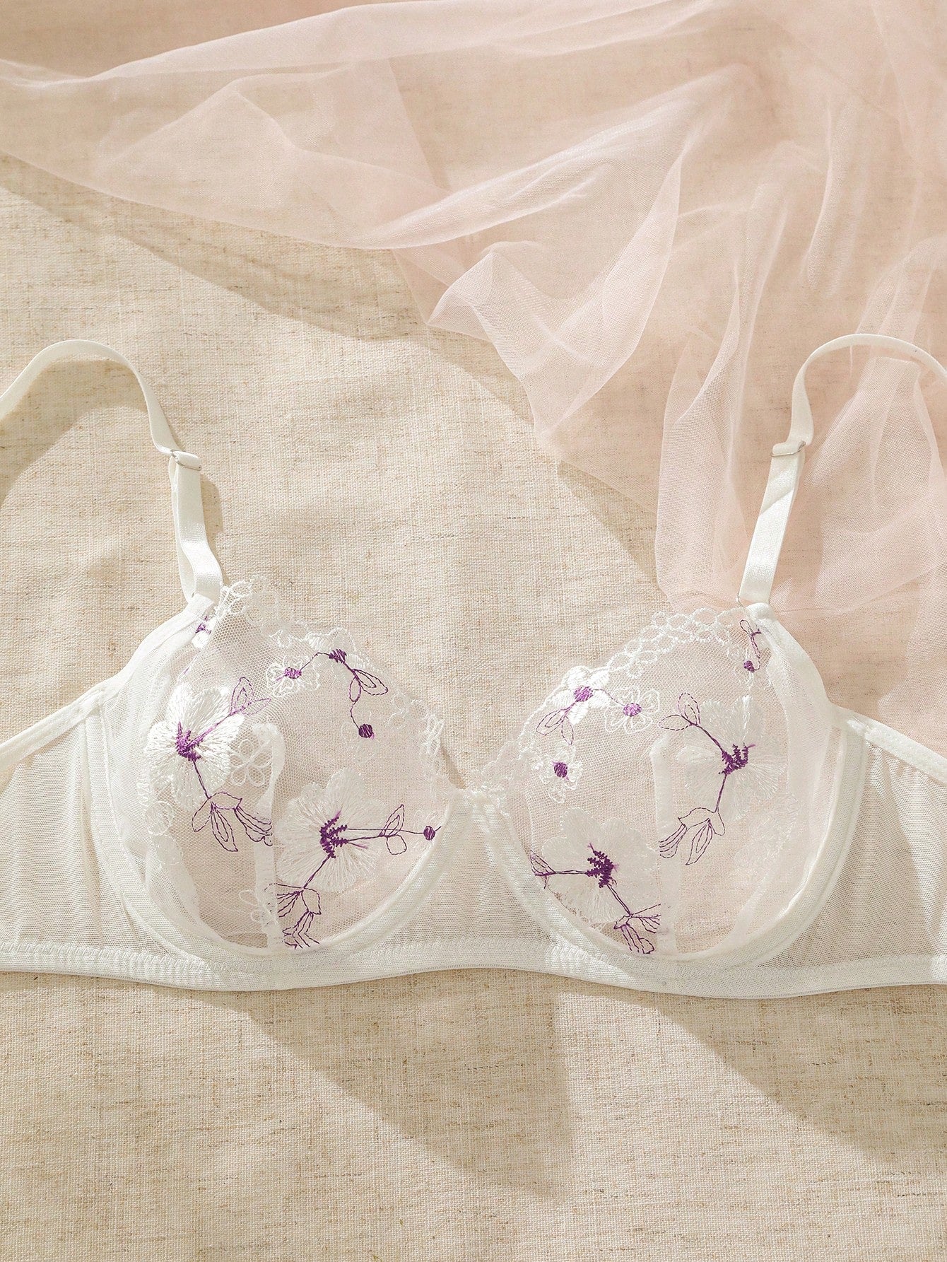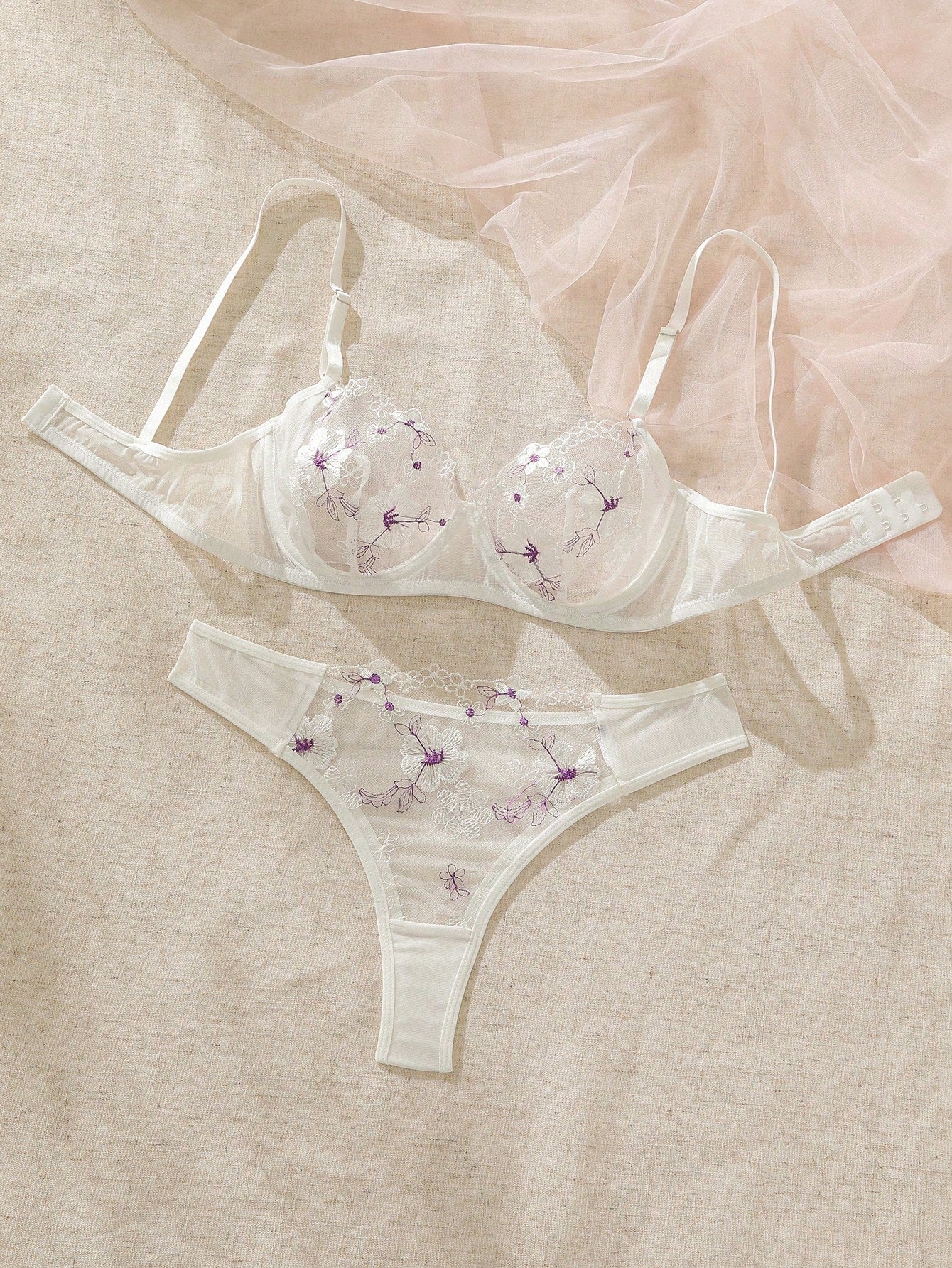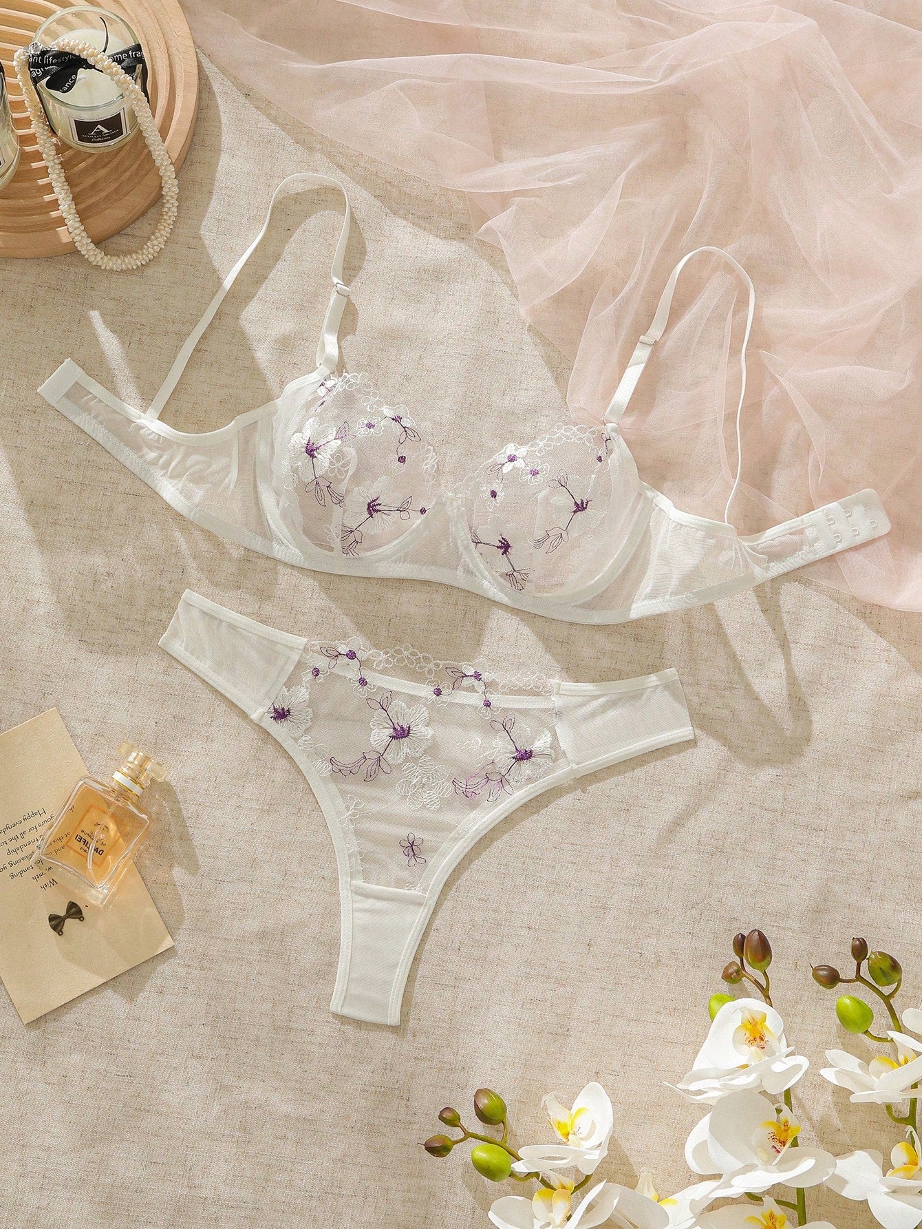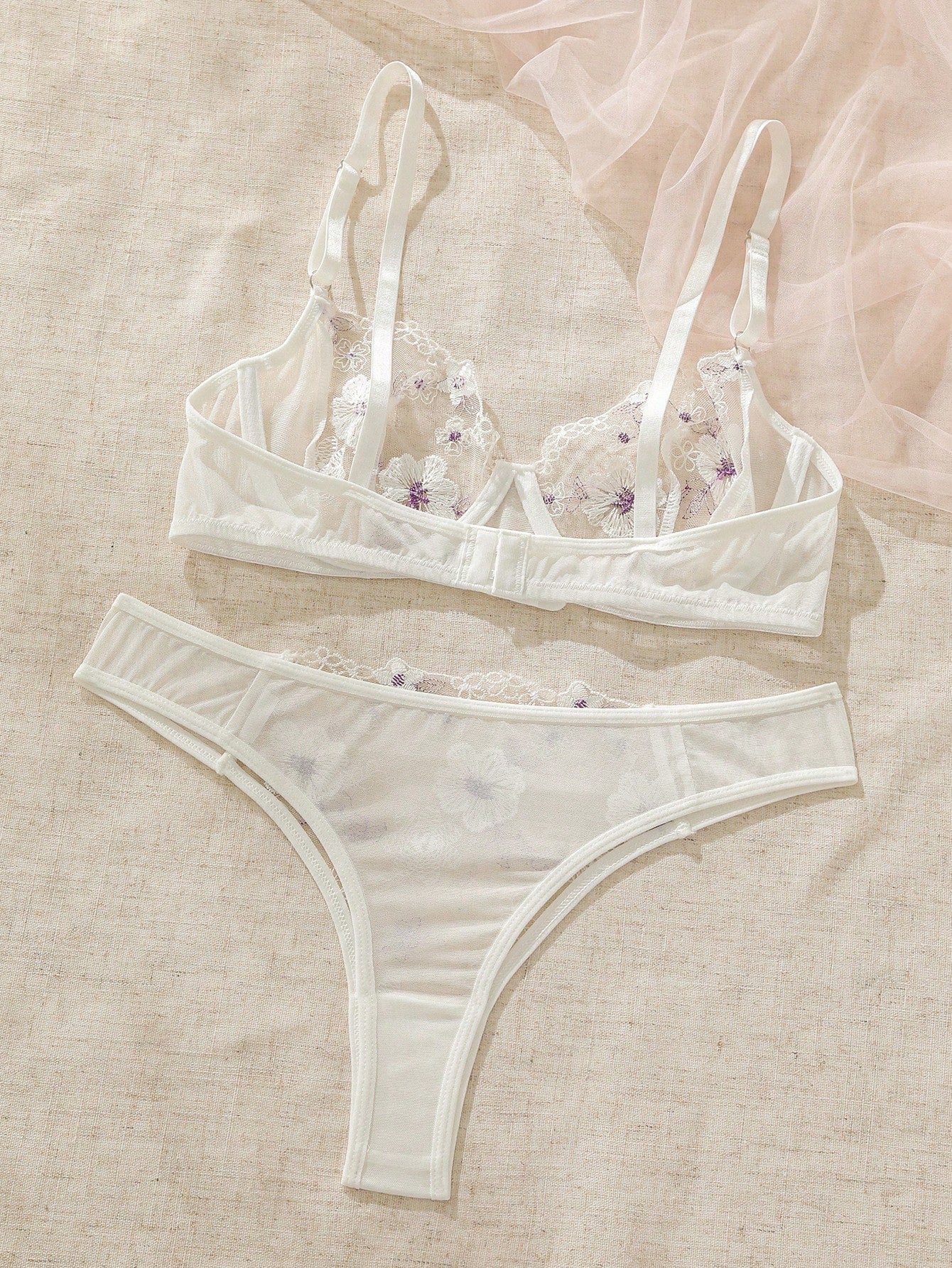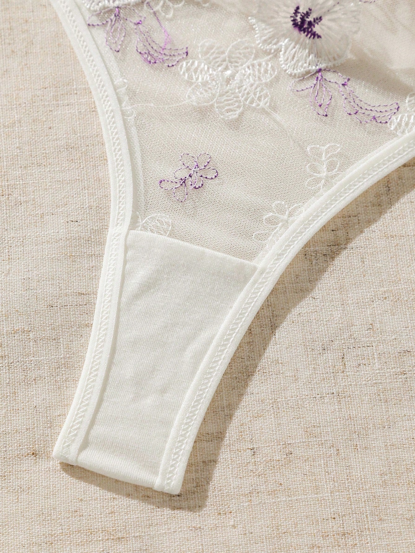 طقم ملابس داخلية مطرز بأزهار شبكة حلقة معدني