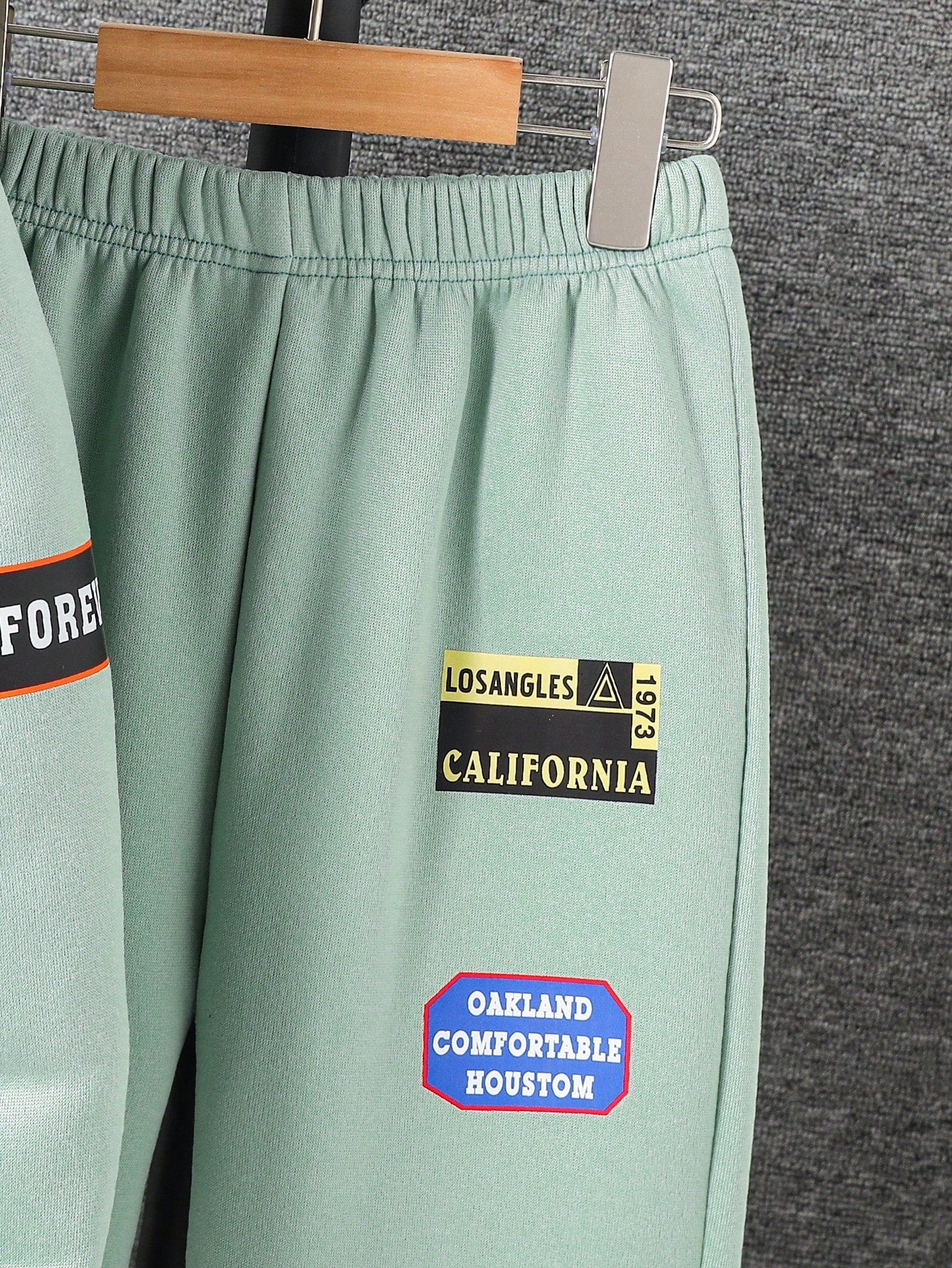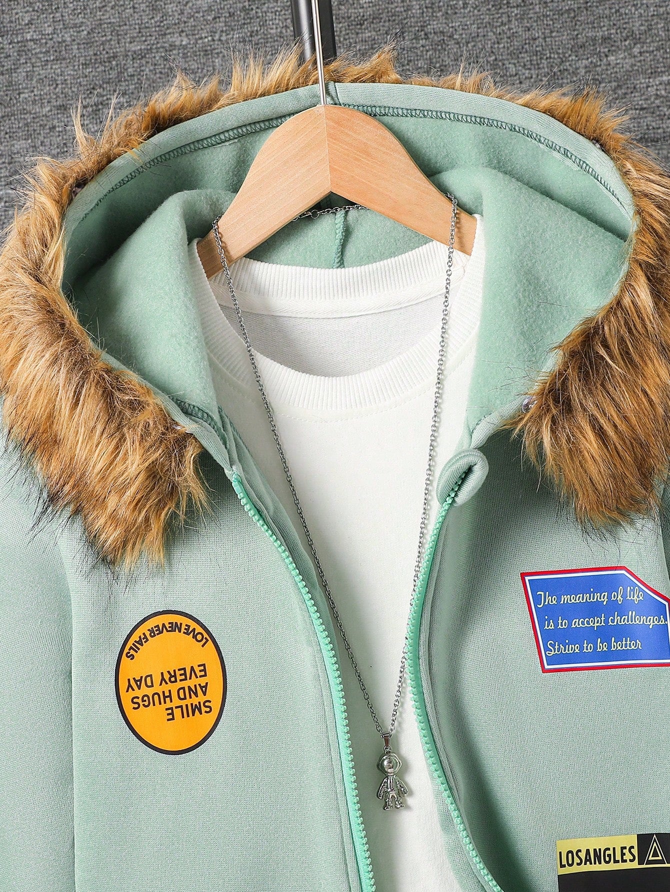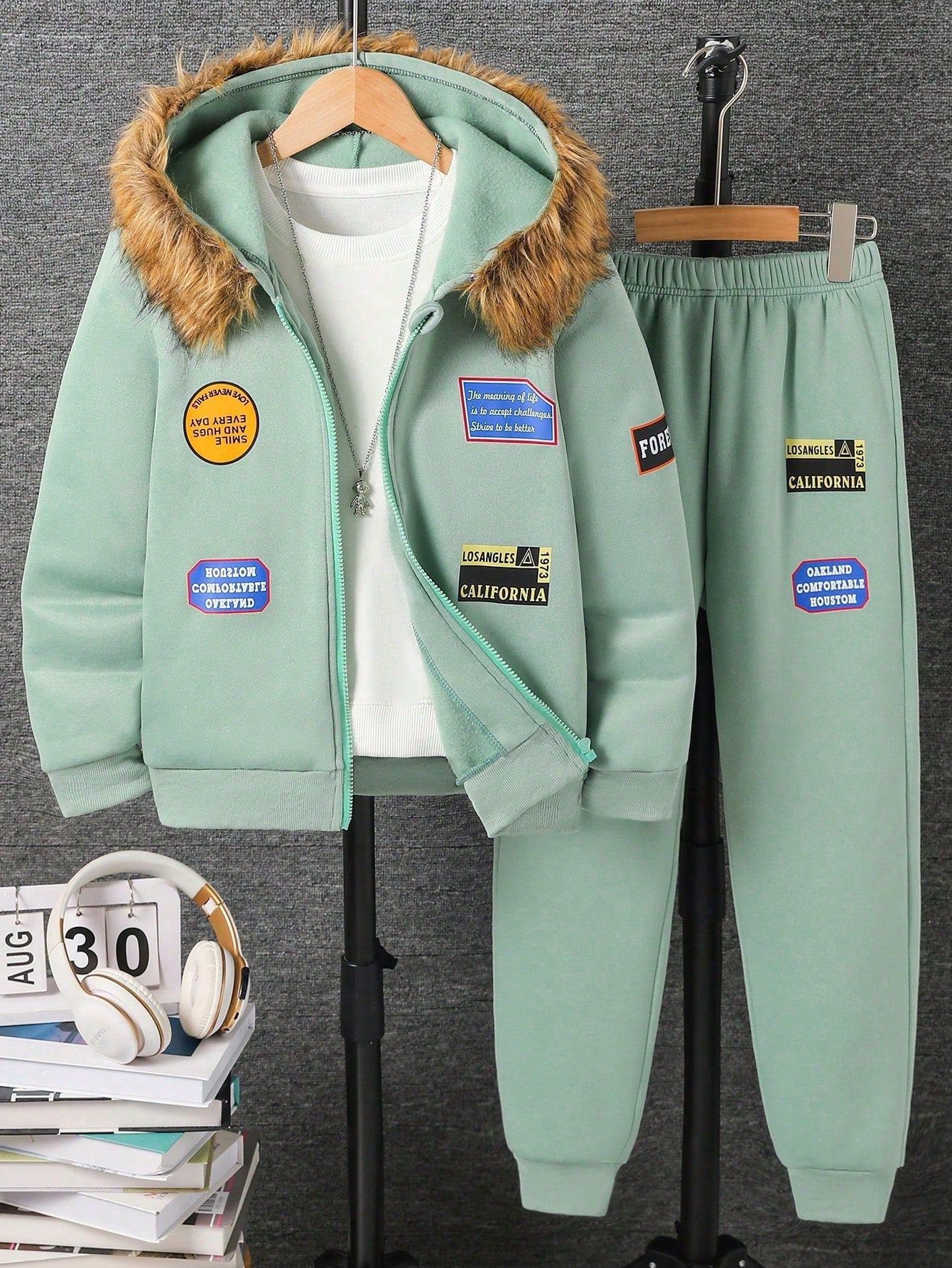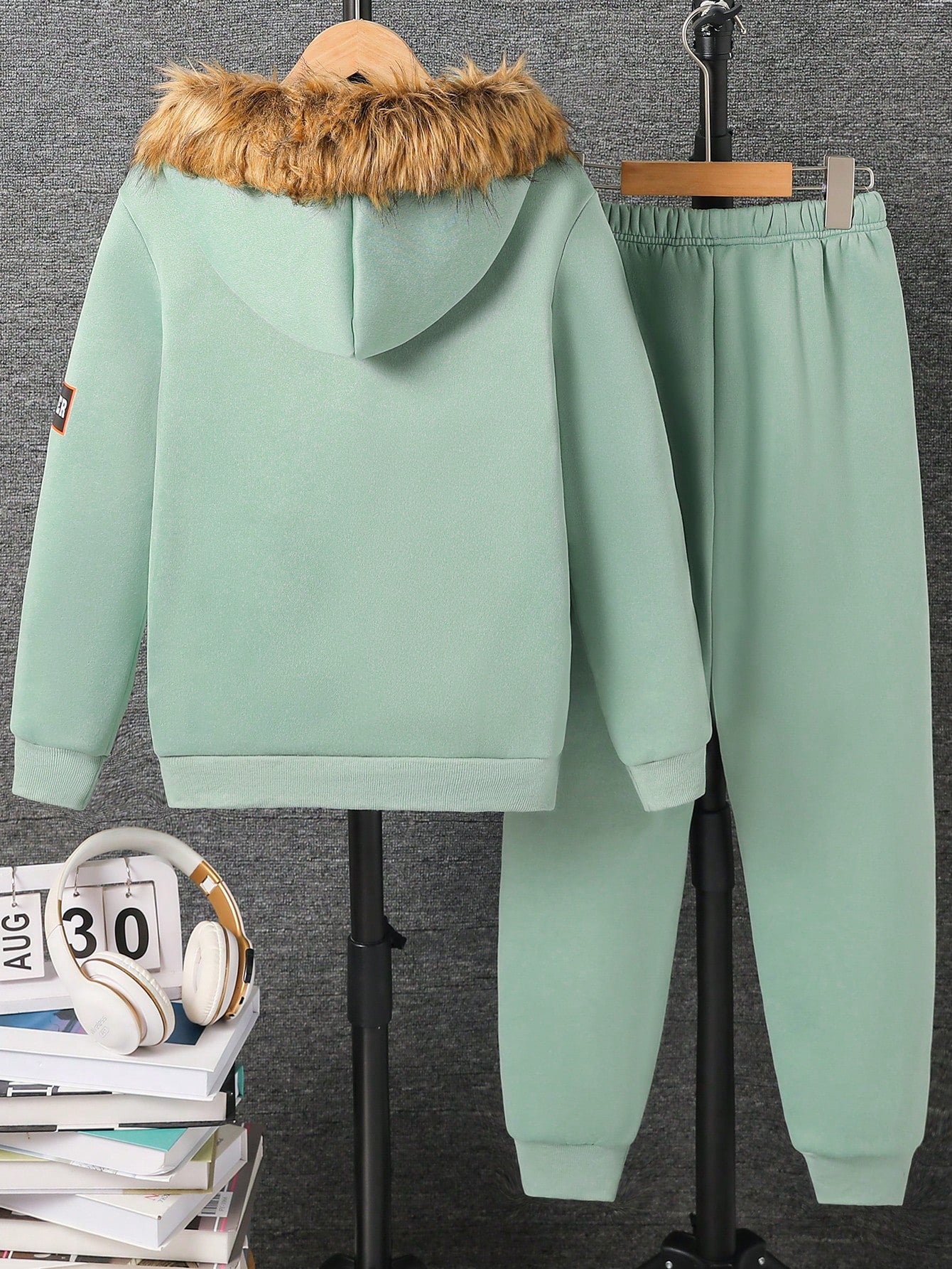 طقم ملابس من قطعتين هوديي بياقة فرائية وبنطلون رياضي للأولاد المراهقين
