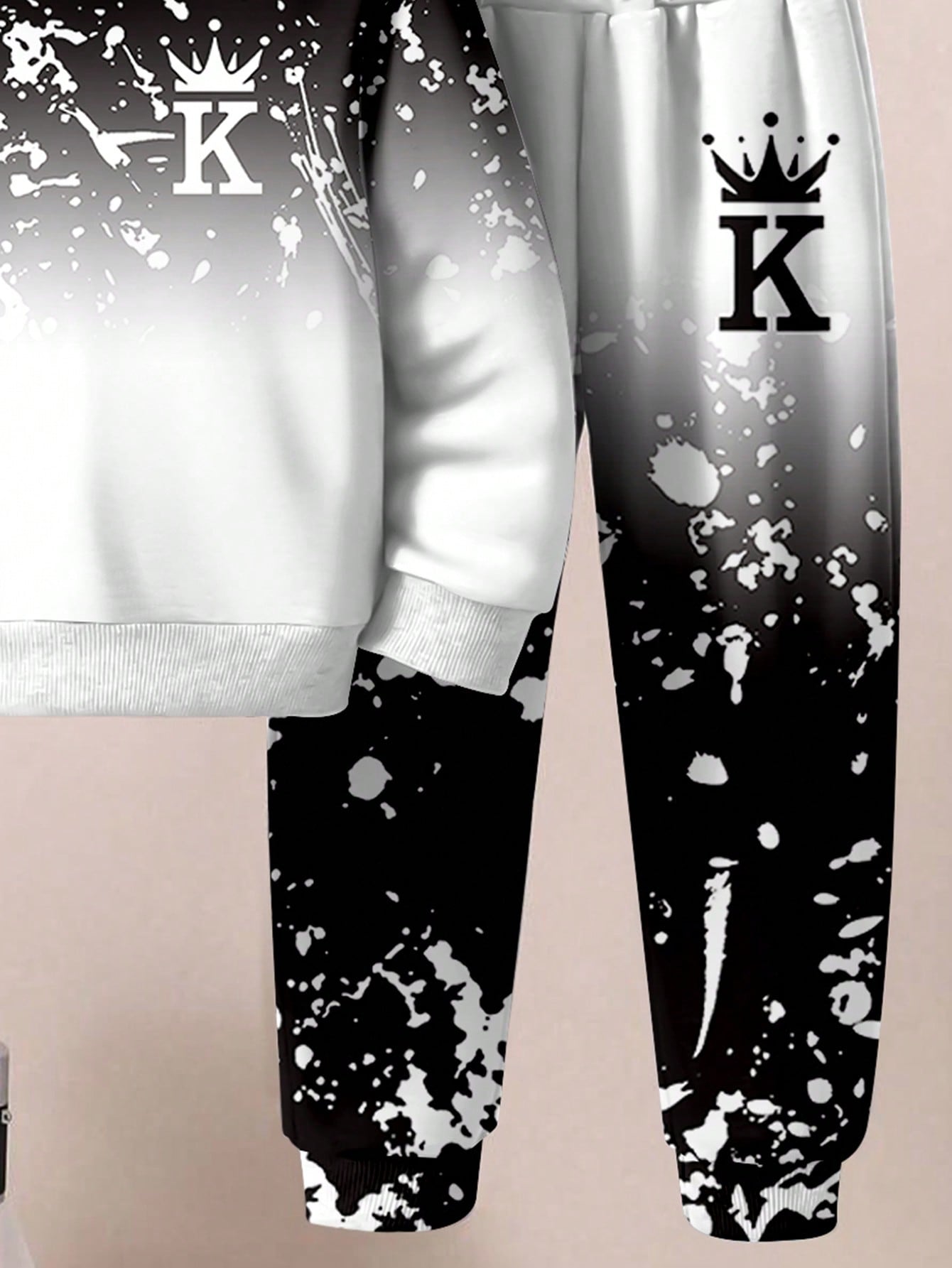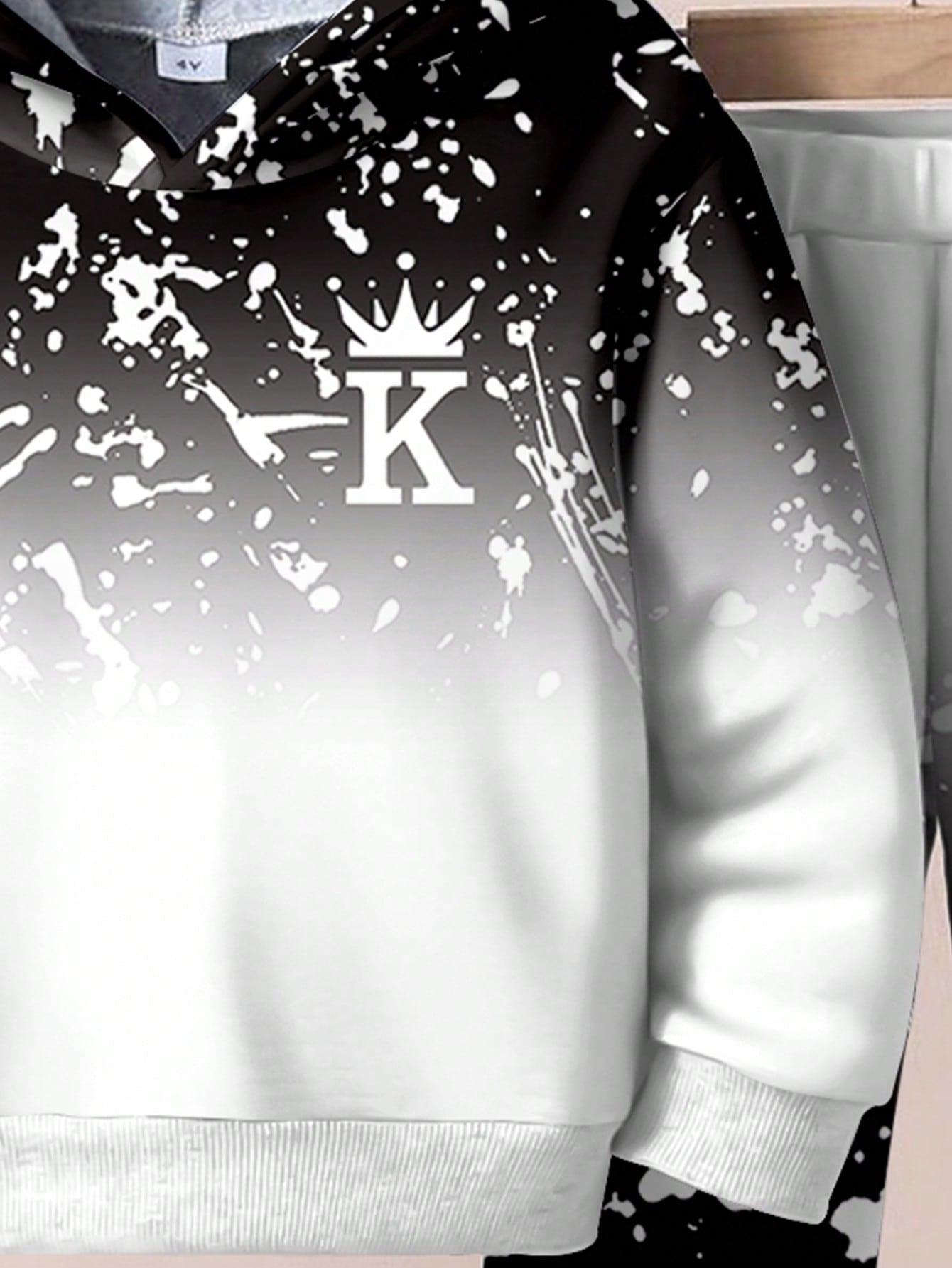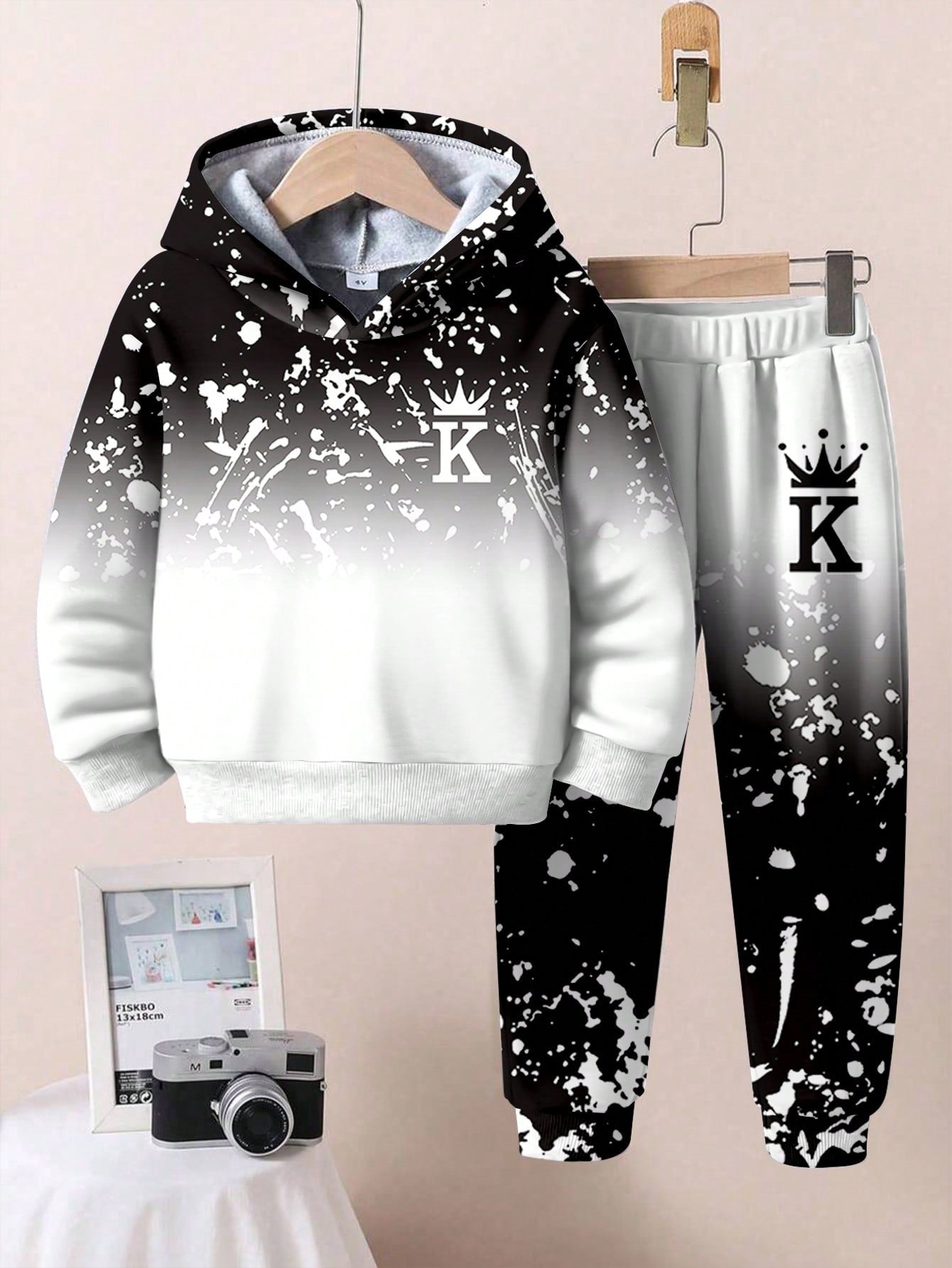 طقم هوديي وسروال من قطعتين لون فضفاض مطبوع عليه تاج وحرف للأولاد الصغار
