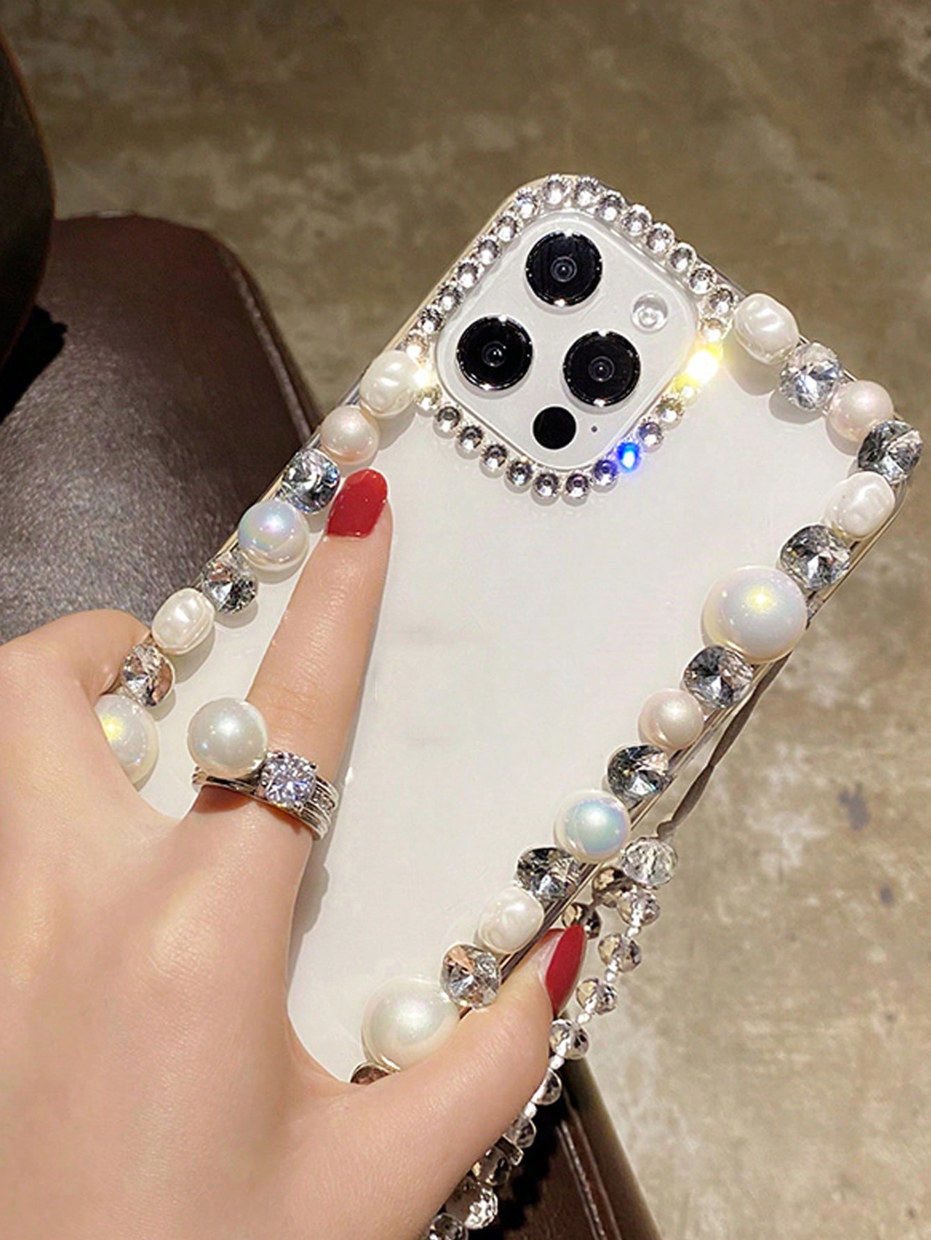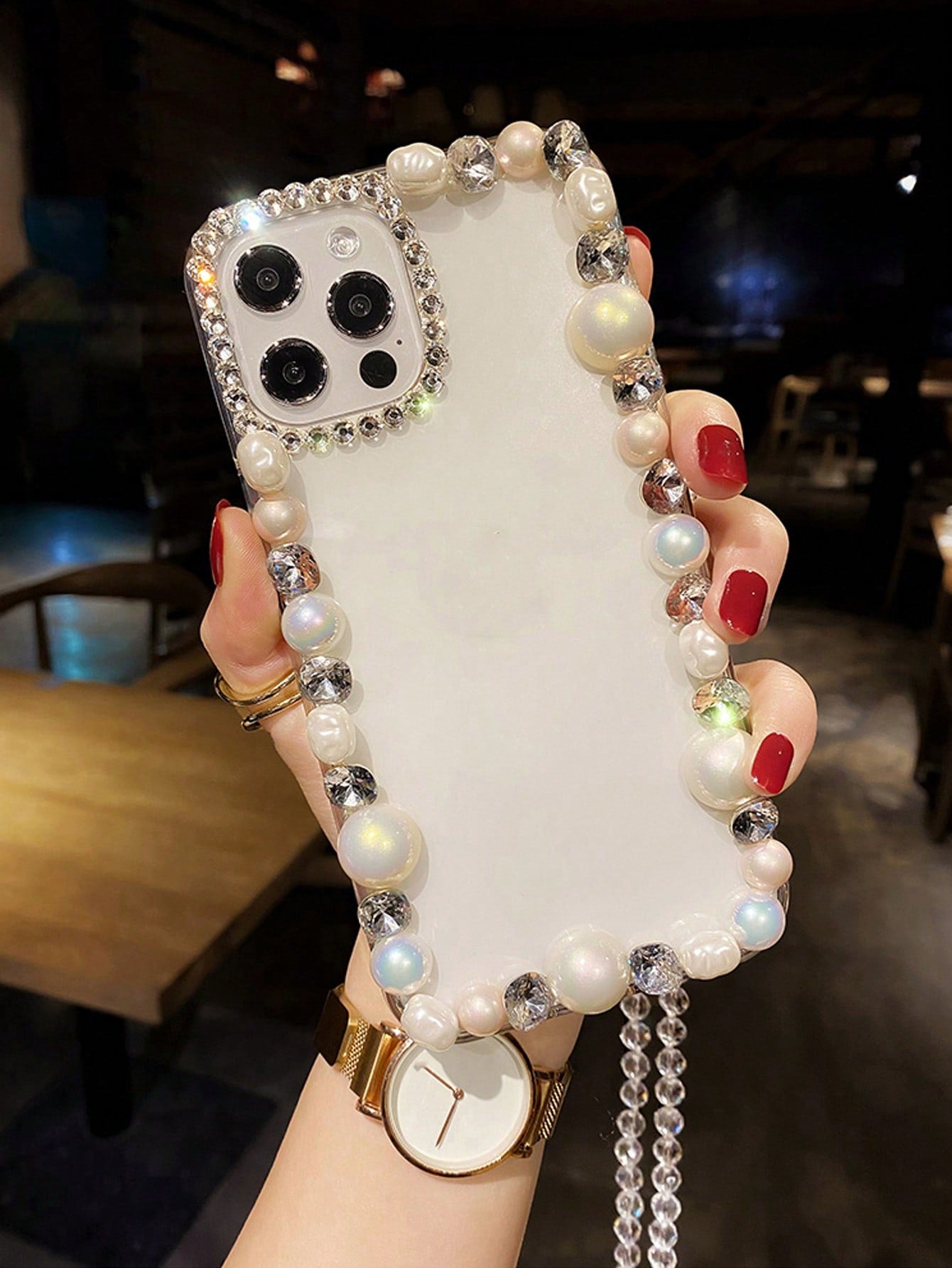 غطاء هاتف مزين بلؤلؤ صناعي مع حبل متوافق مع آيفون 11، آيفون 13، آيفون 14 برو ماكس.