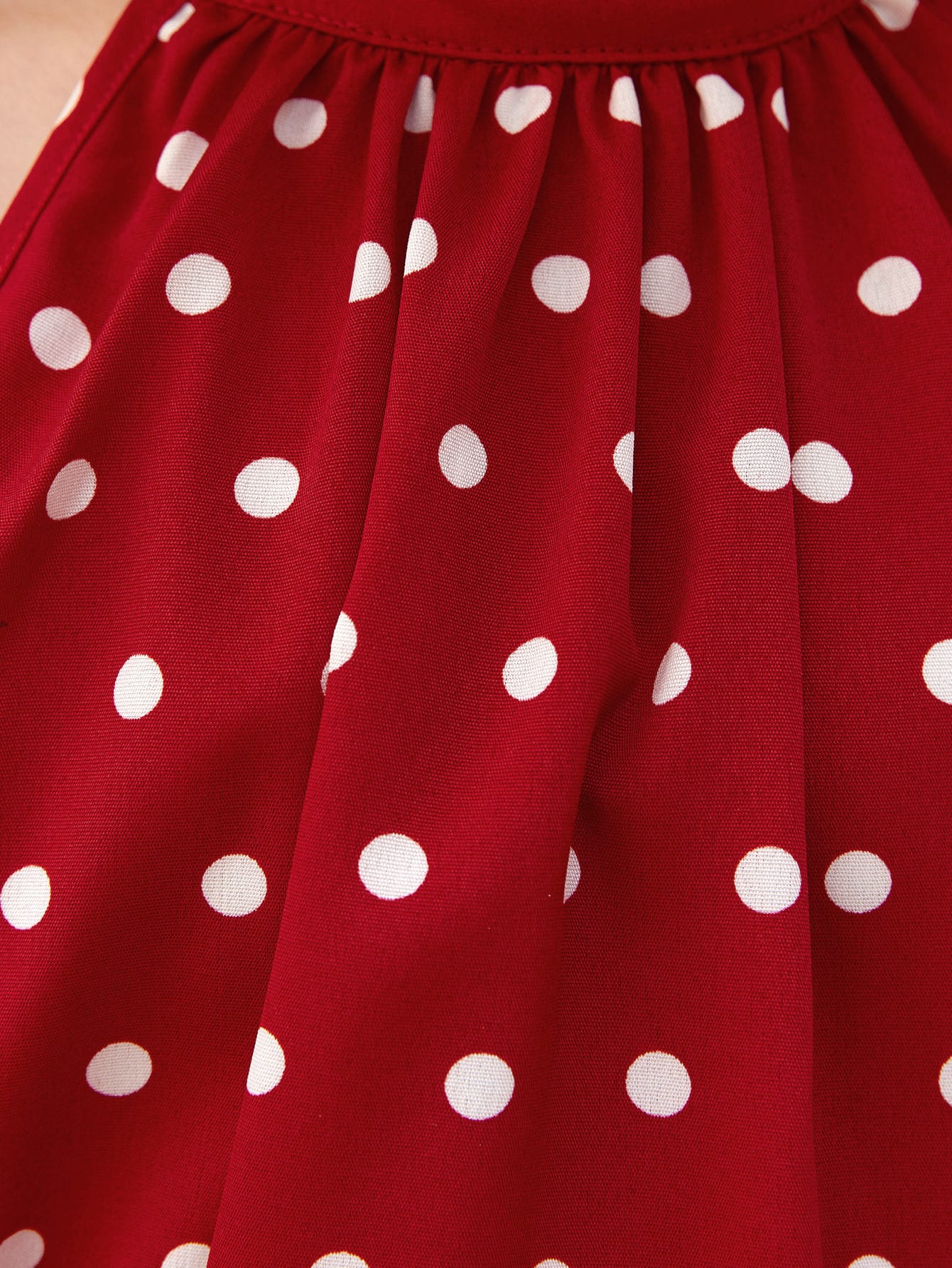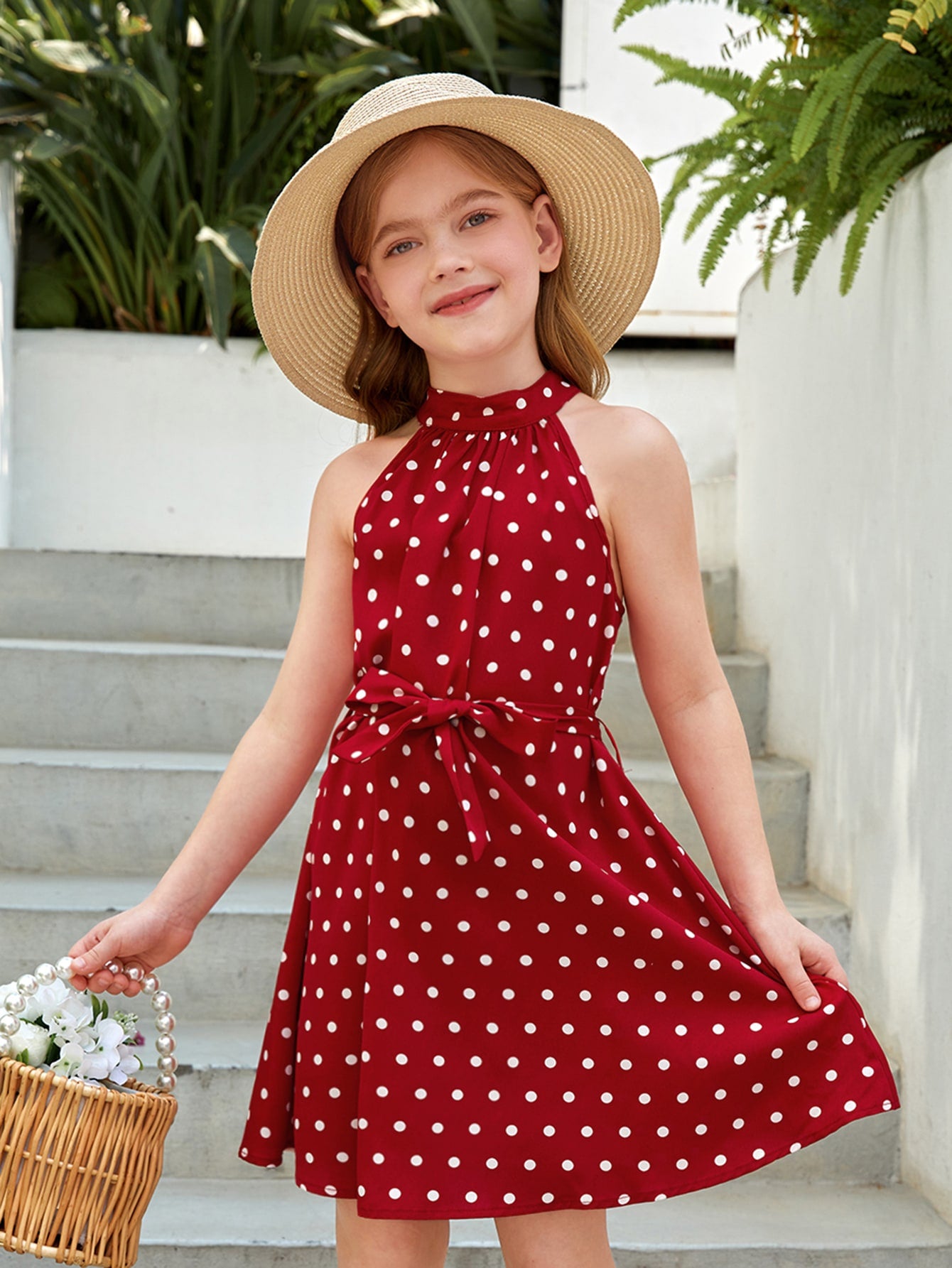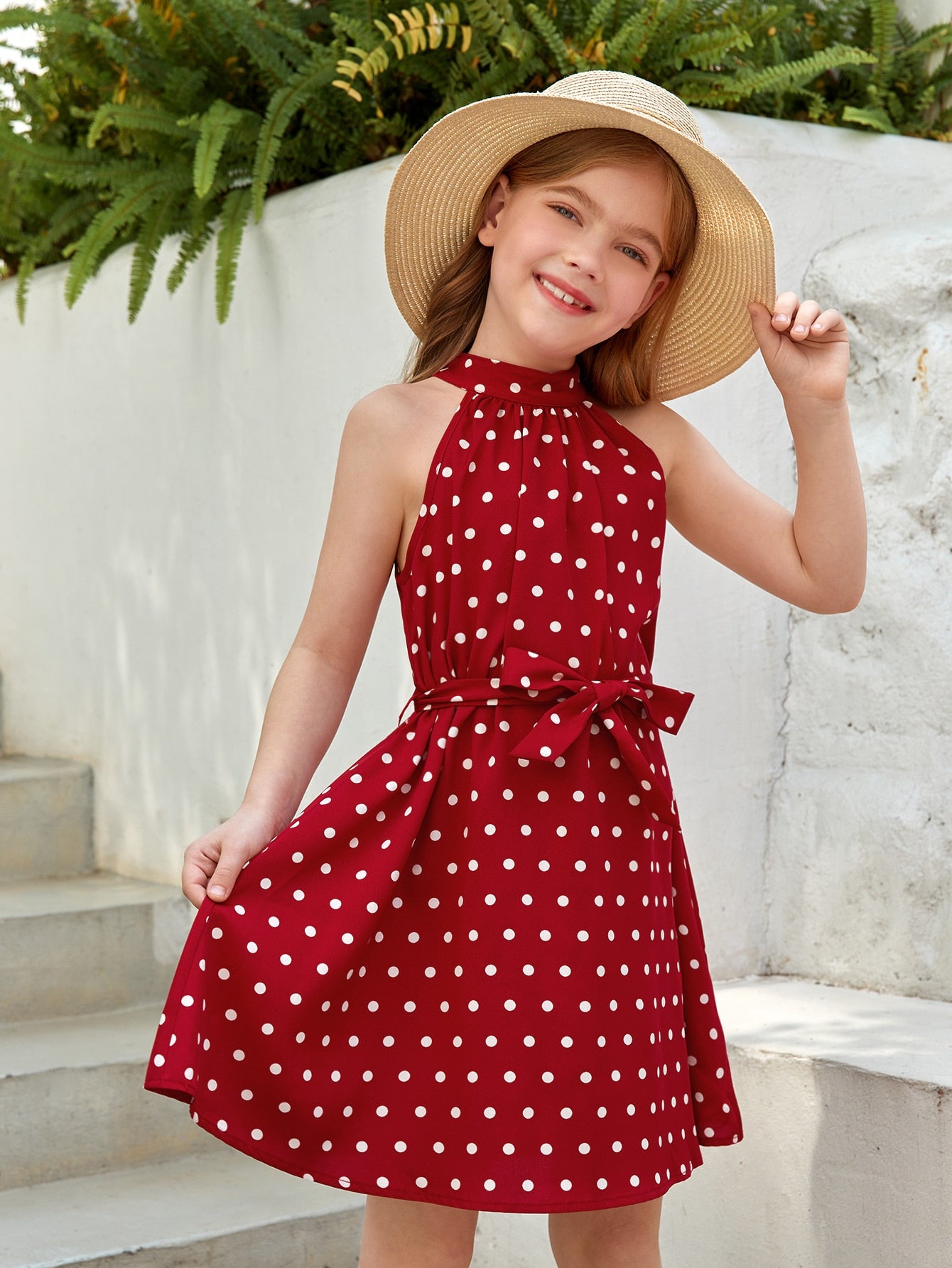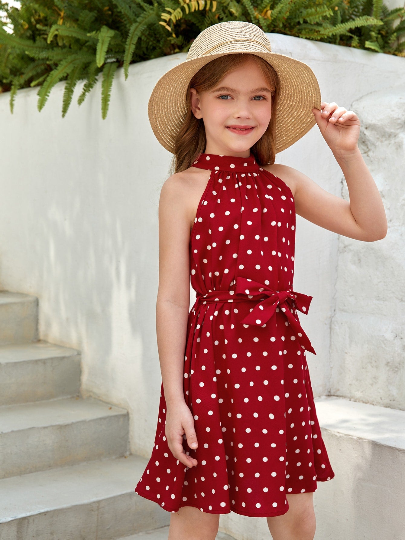 فتاة الناشئة اللباس الكلاسيكي بنقشة النقاط، بقصة الرقبة على شكل حمالة مع حزام للمناسبات العادية
