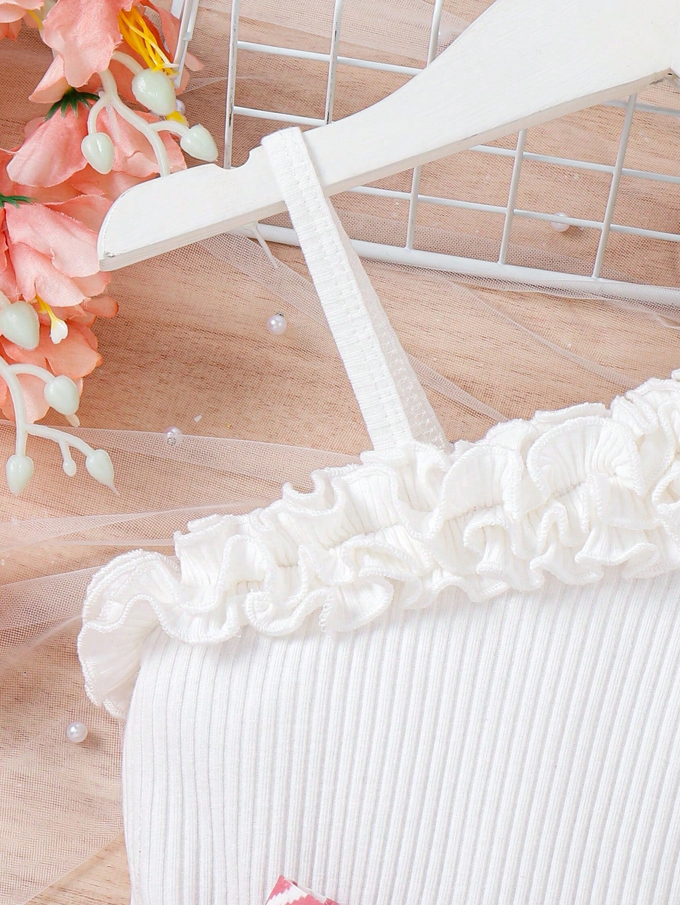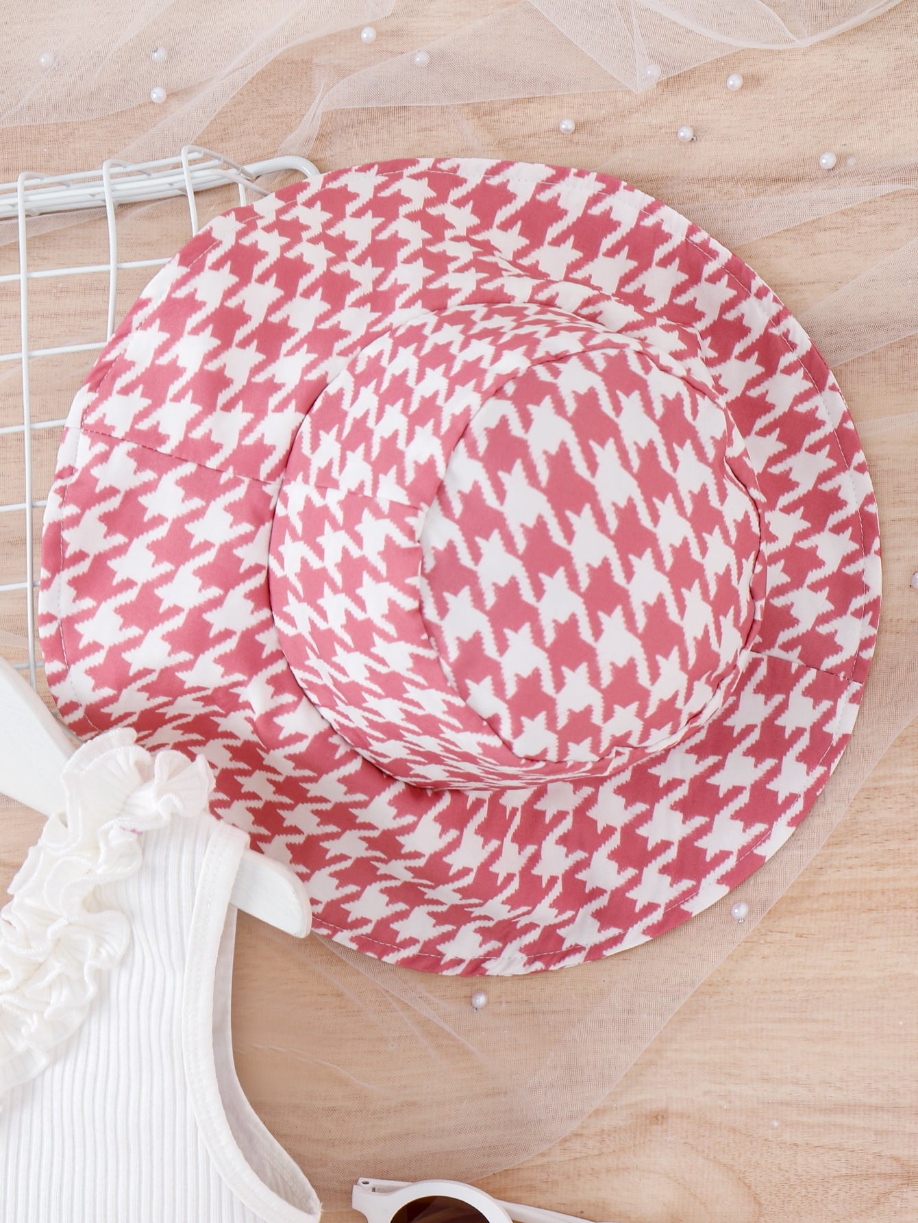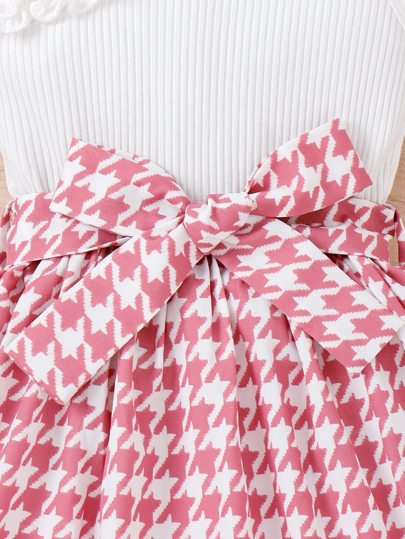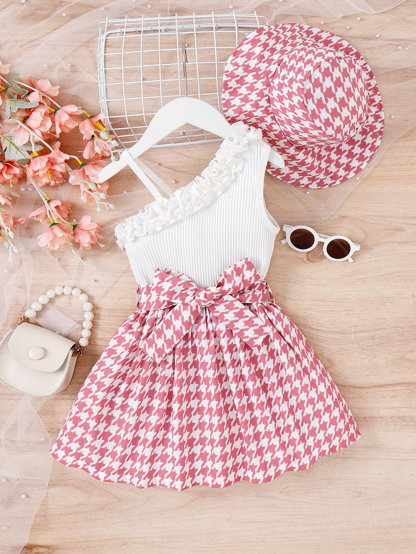 فتاة صغيرة بفستان مخطط هاوندستوث ، ربطة عنق غير متماثلة مع حاشية مزمومة وحزام و قبعة