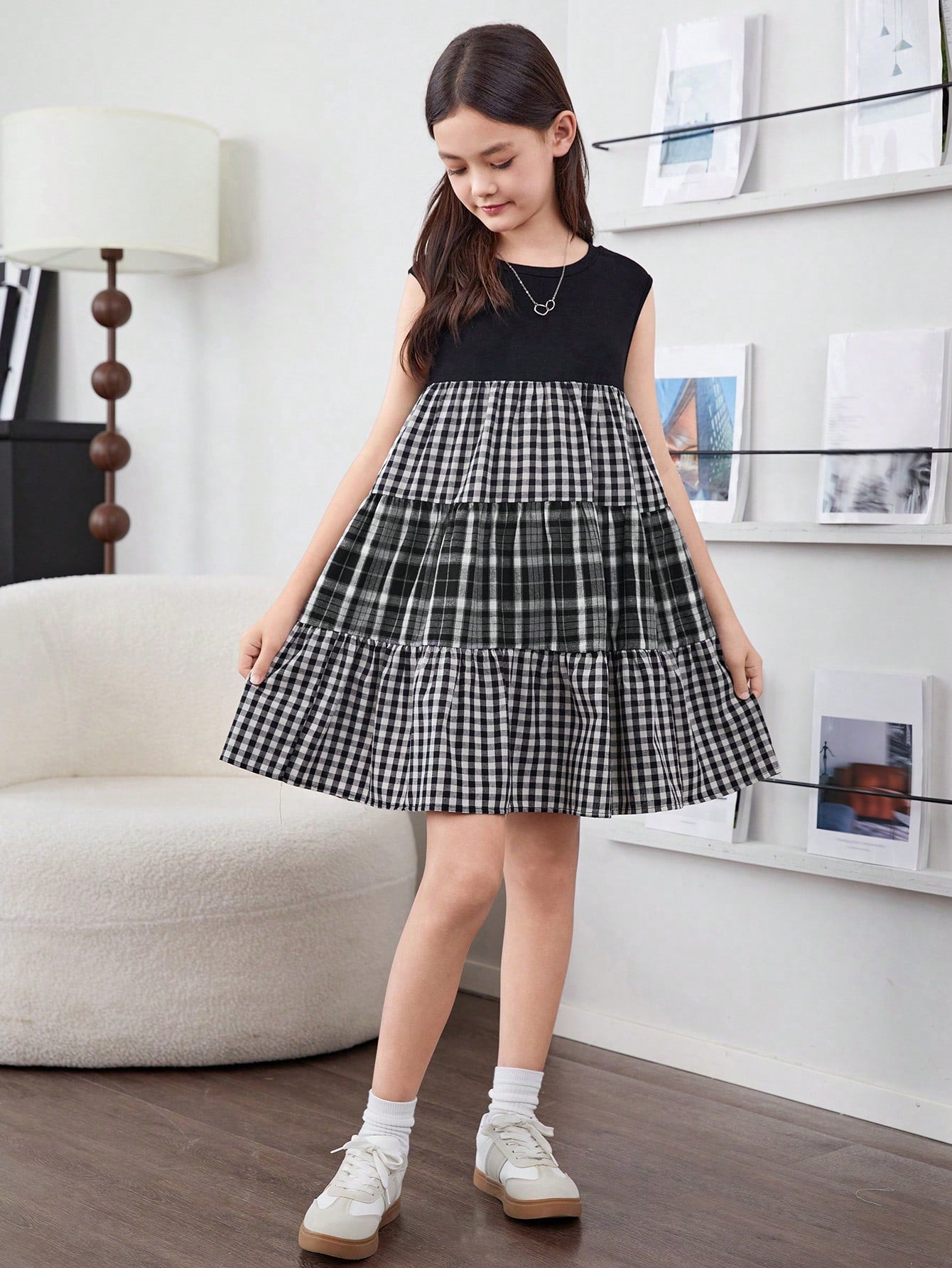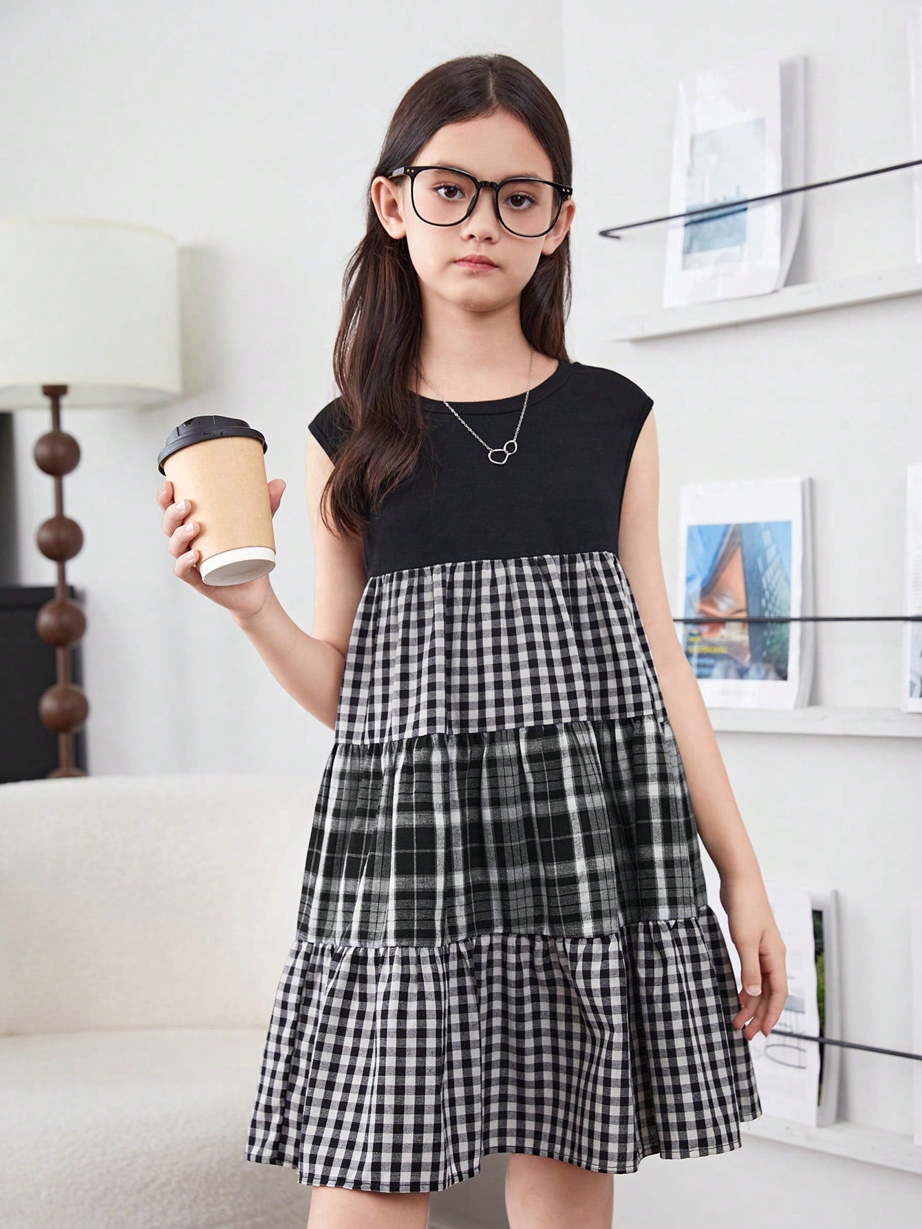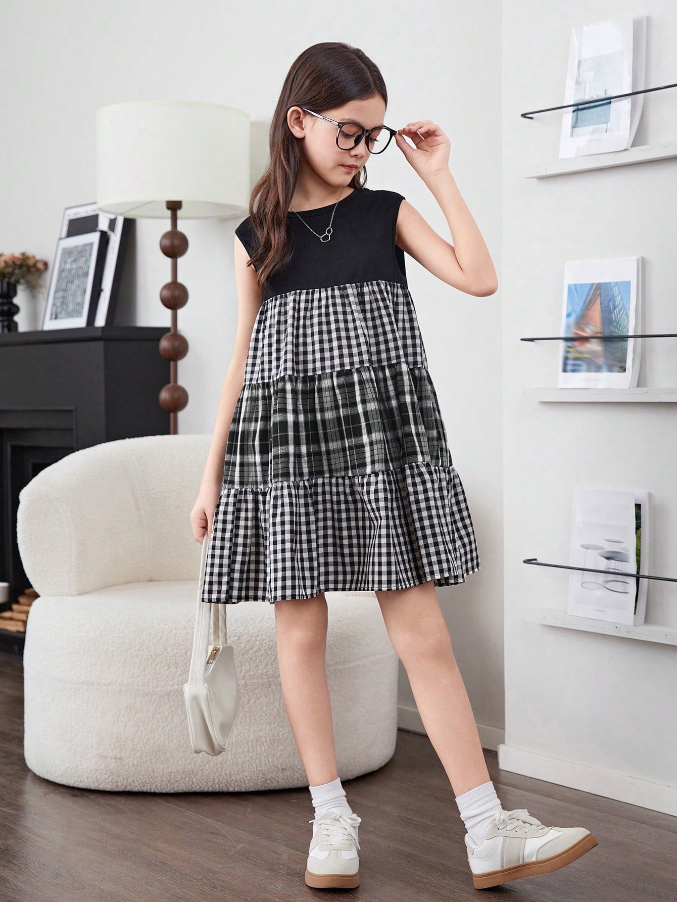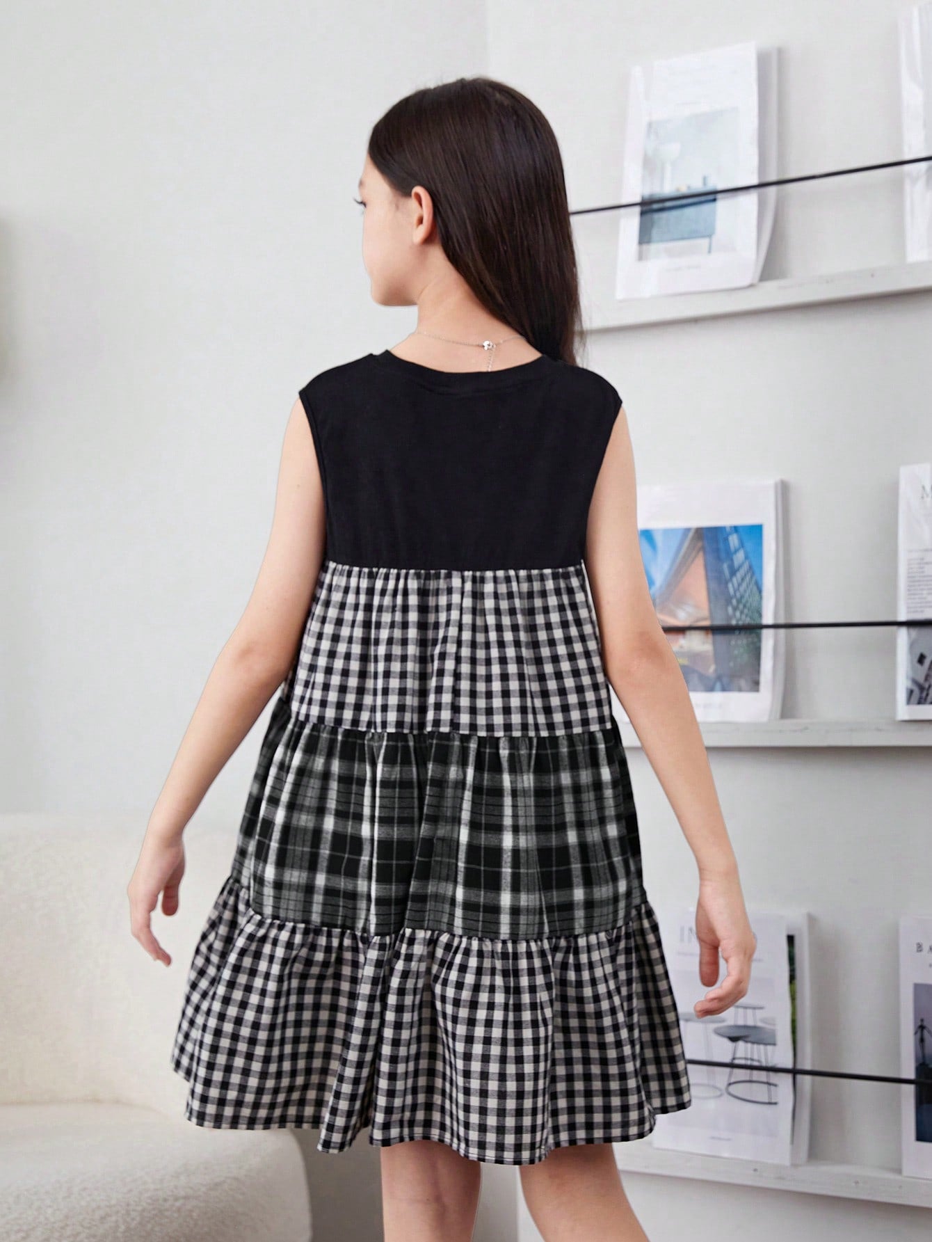 فتاة مراهقة بنمط ياباني، فستان كُمِّاش يغطّي الكتف بالمربّعات متباين الألوان مقصوص بالحياكة لفصل الربيع والصيف