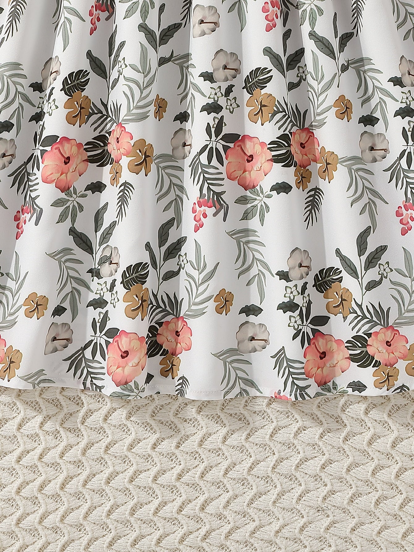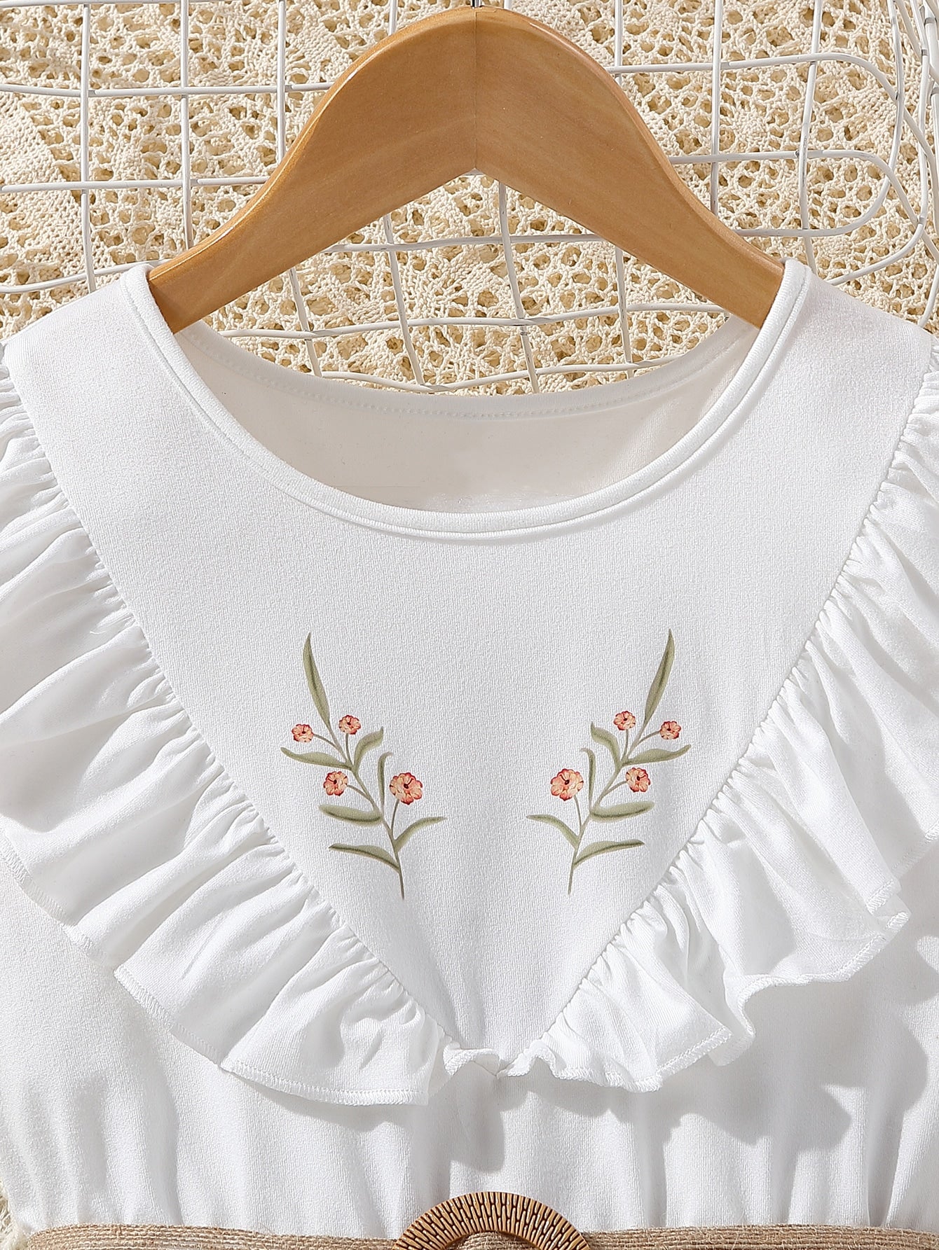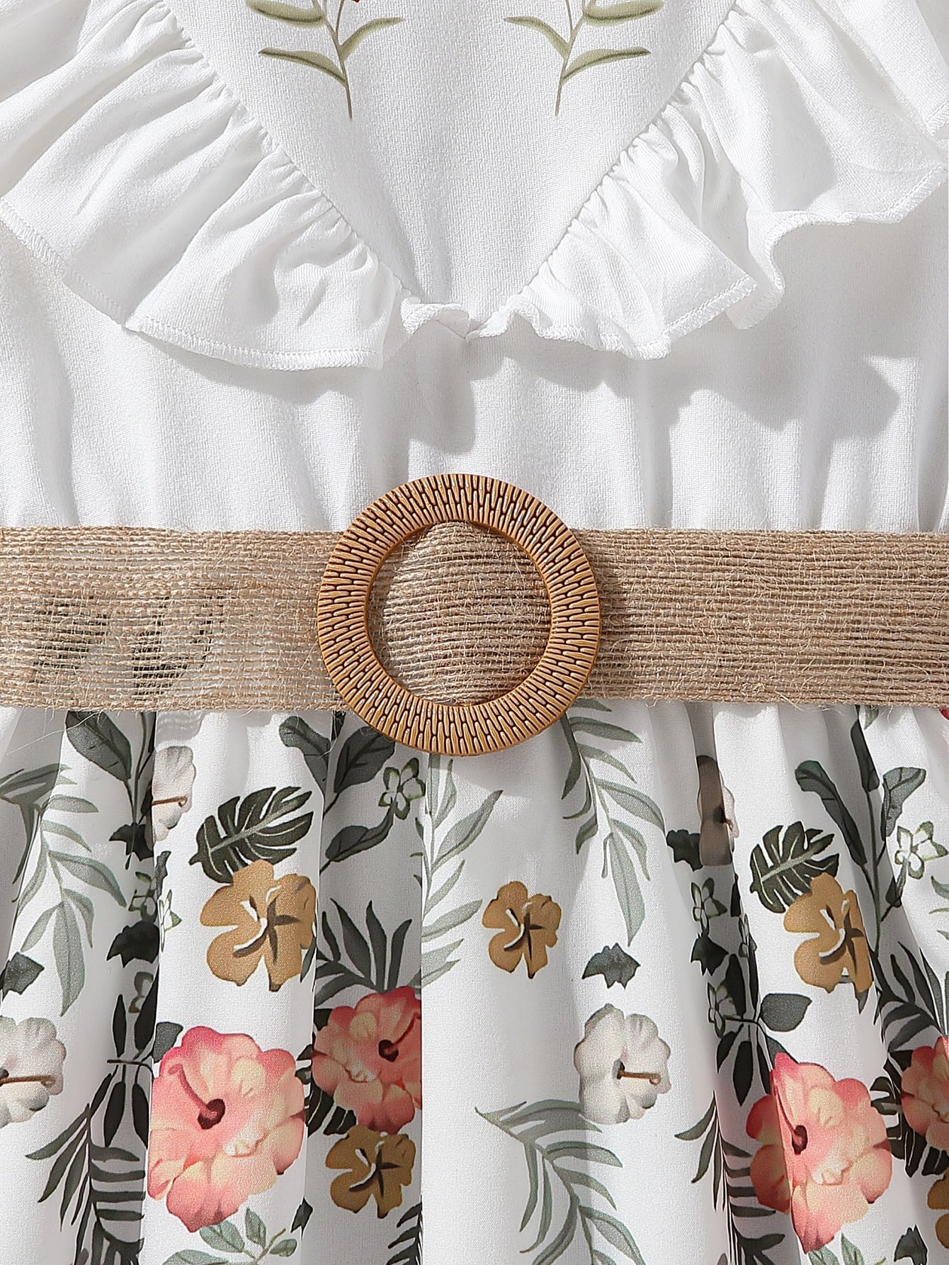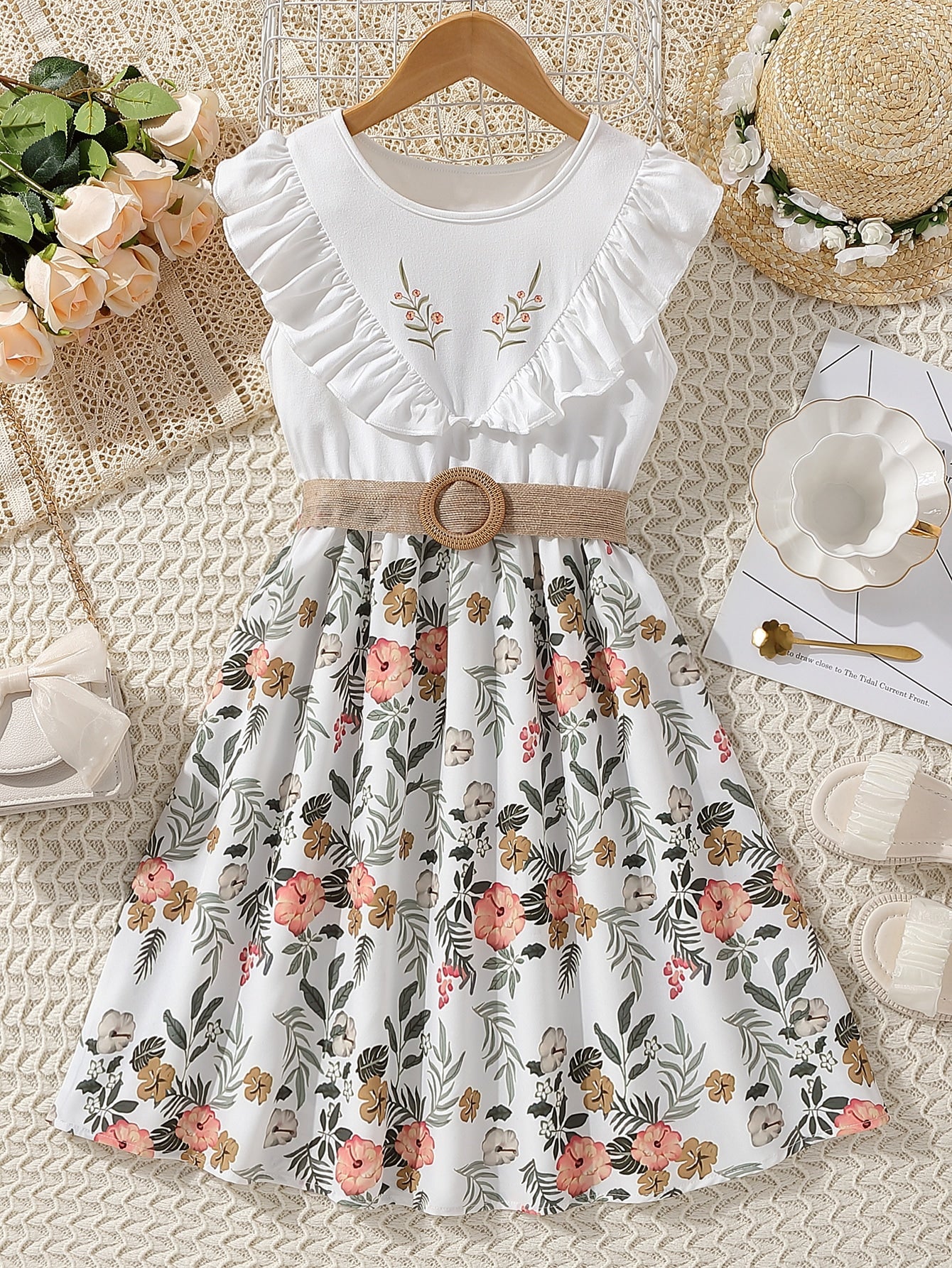 فتاة مراهقة فاتنة بفستان بلا أكمام مطبوع بطبعات الزهور وبحافة مجعدة، يأتي مع حزام الخصر