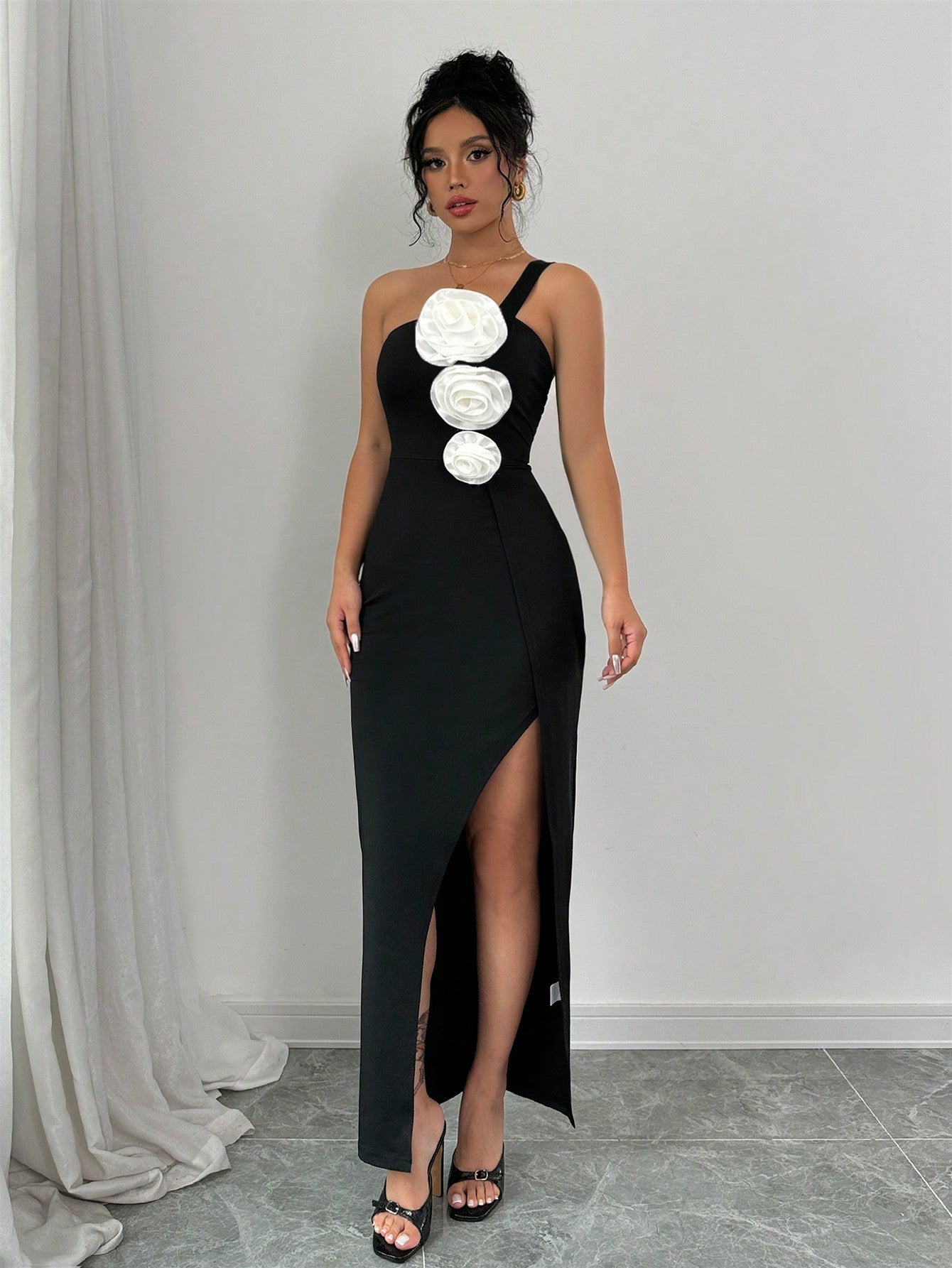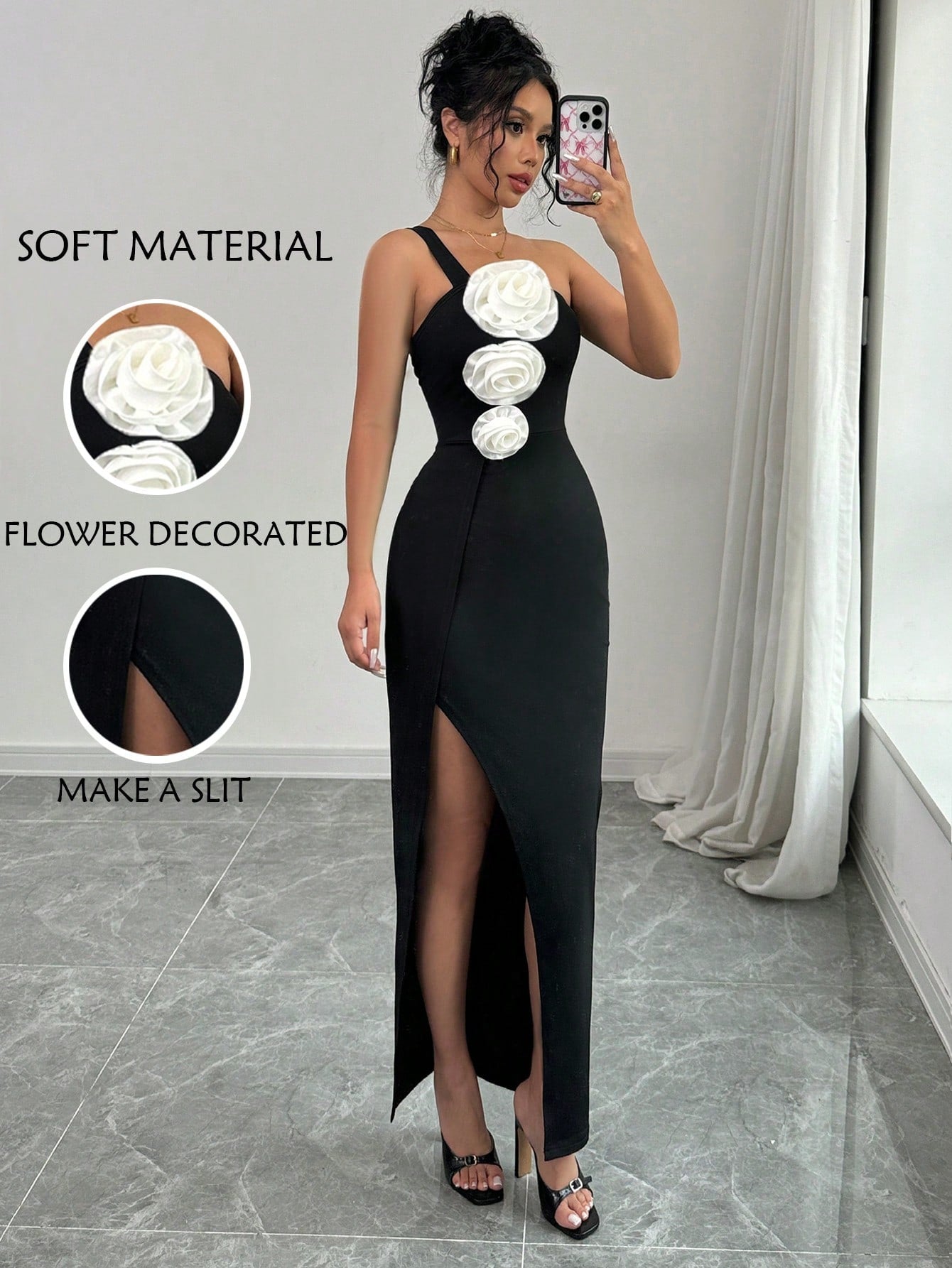 فستان أكمام بلا أكمام مطبوع بالزهور برقبة غير متماثلة وشق طويل على الفخذ للنساء