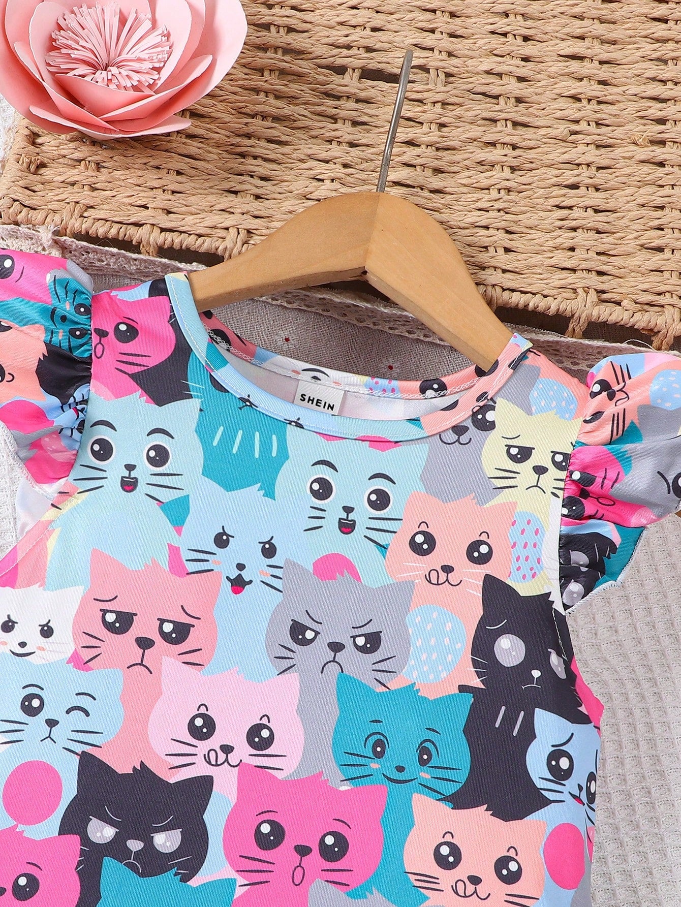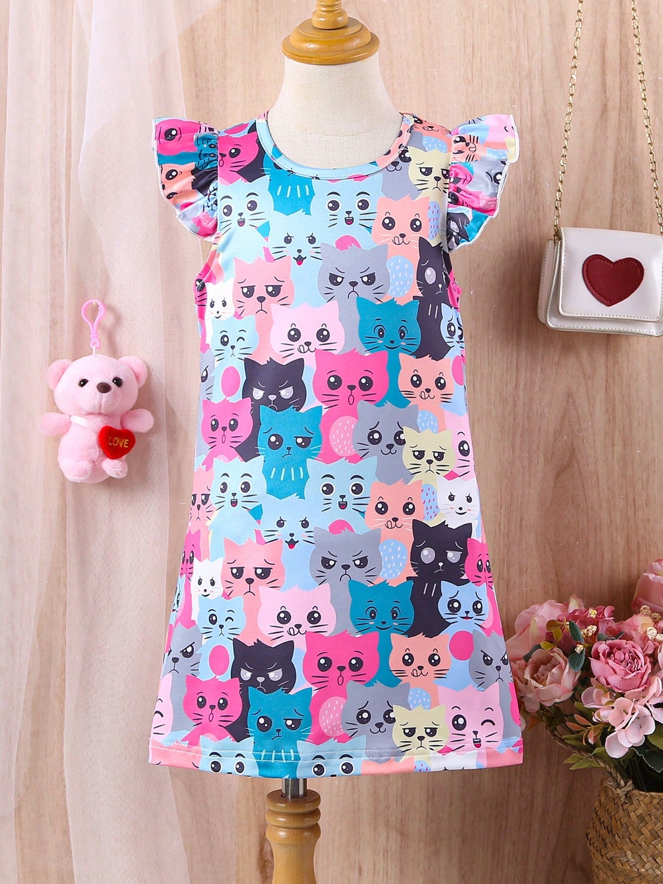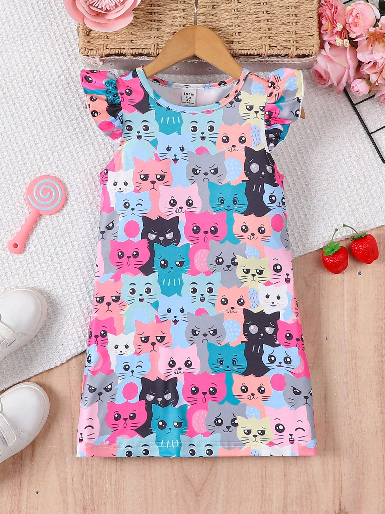 فستان أكمام طائرة طبعة قطوة كرتونية لفتاة صغيرة
