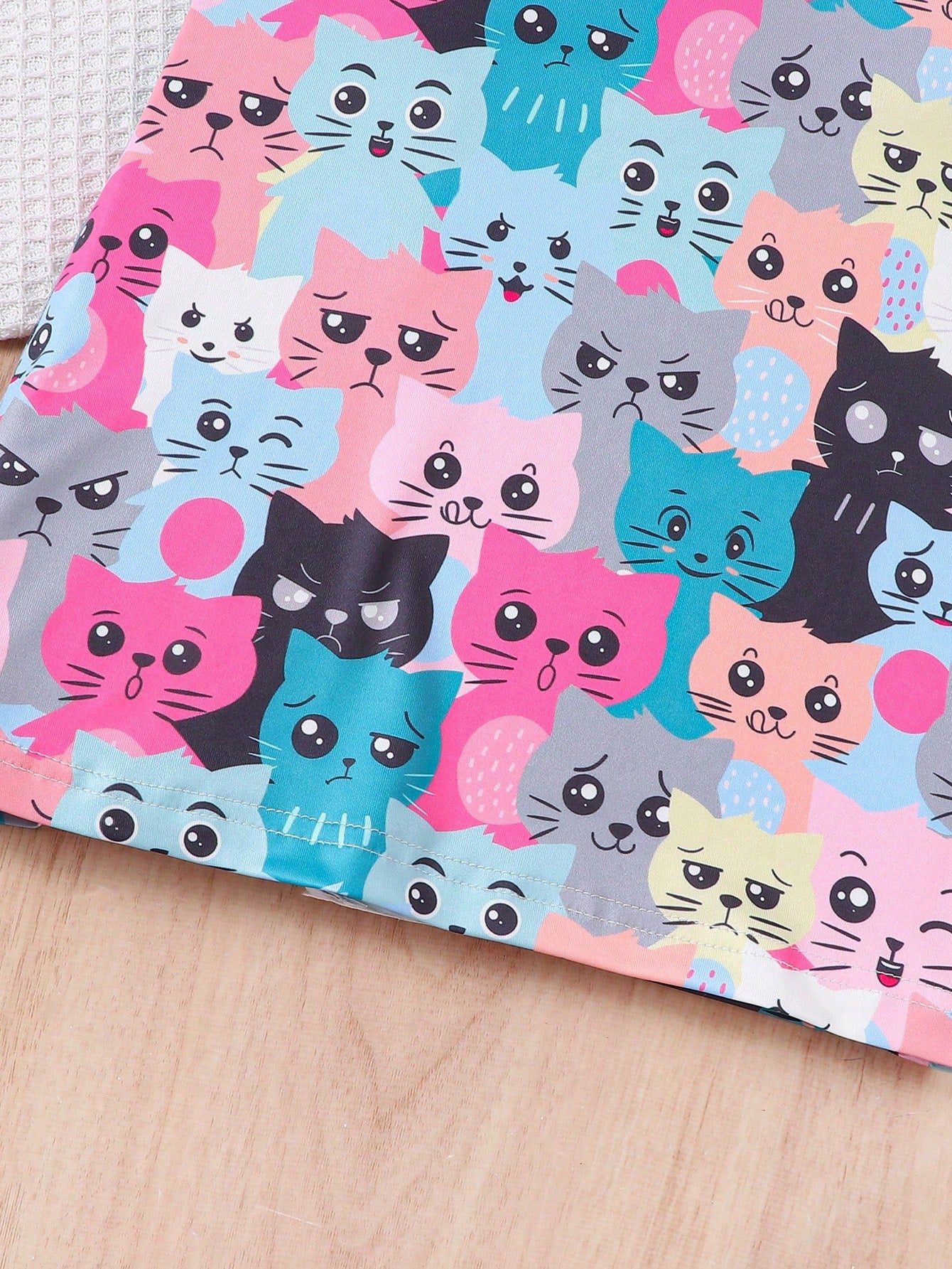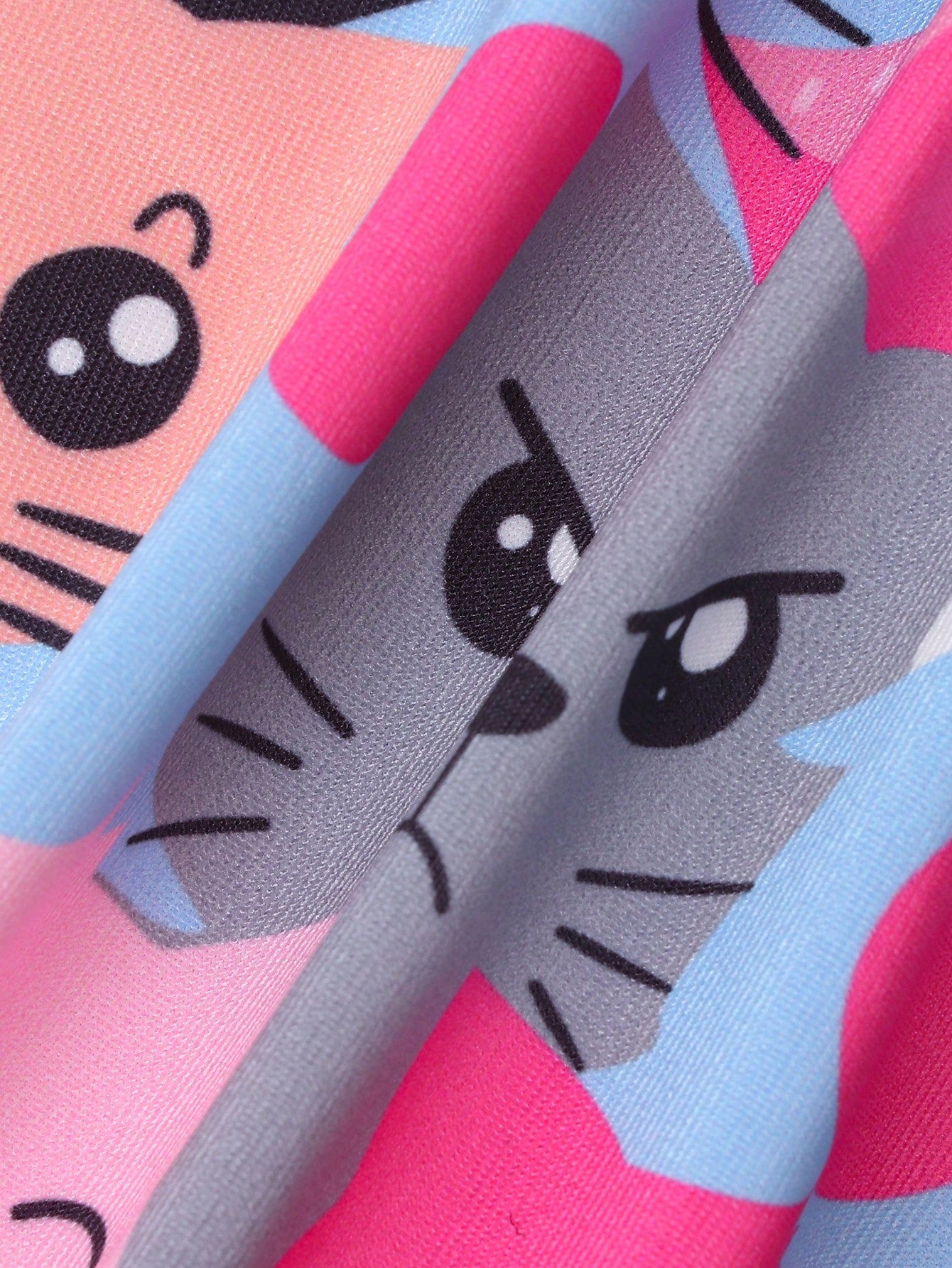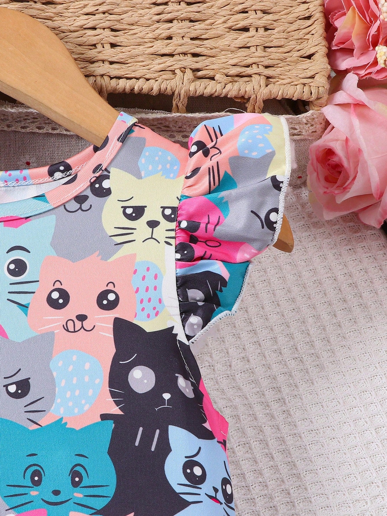 فستان أكمام طائرة طبعة قطوة كرتونية لفتاة صغيرة
