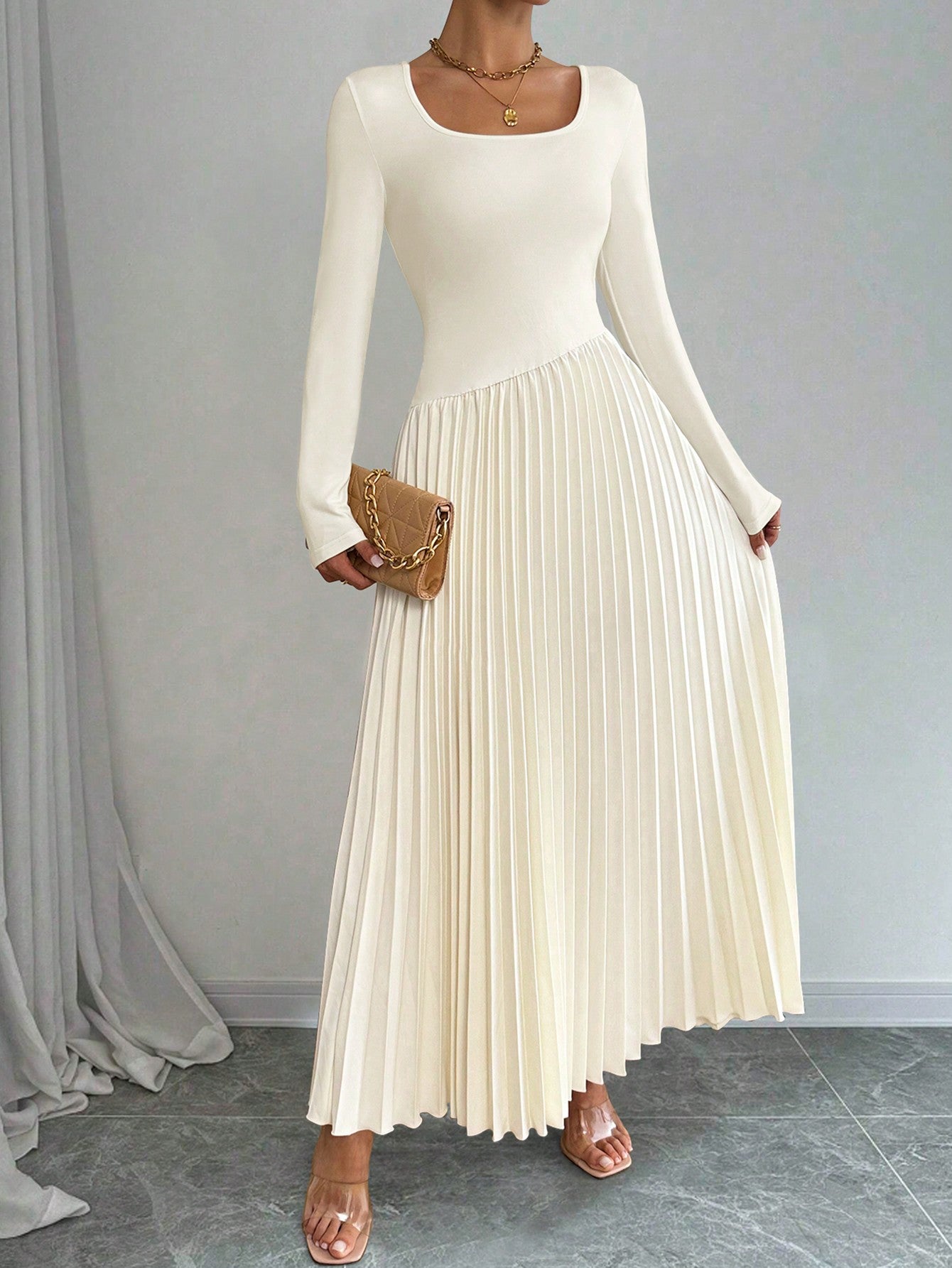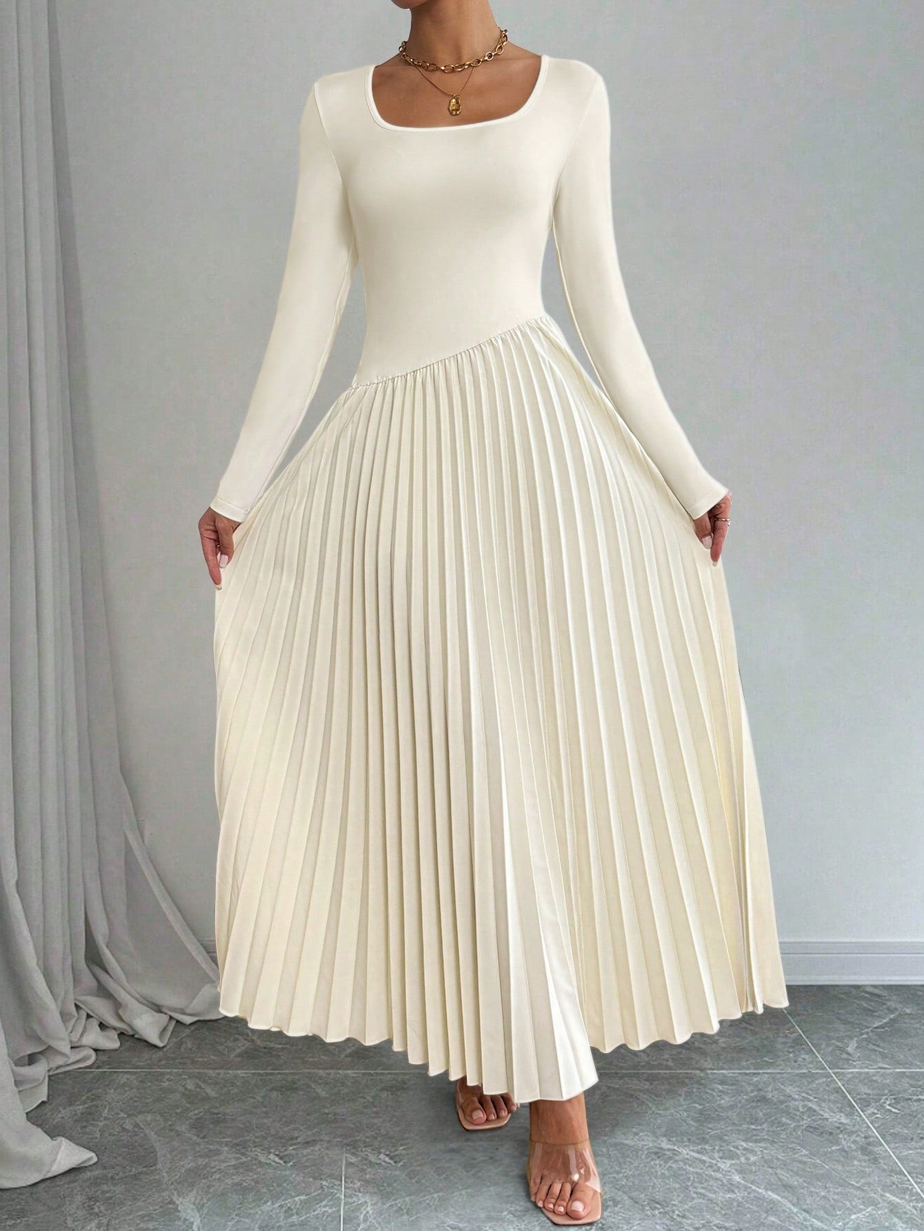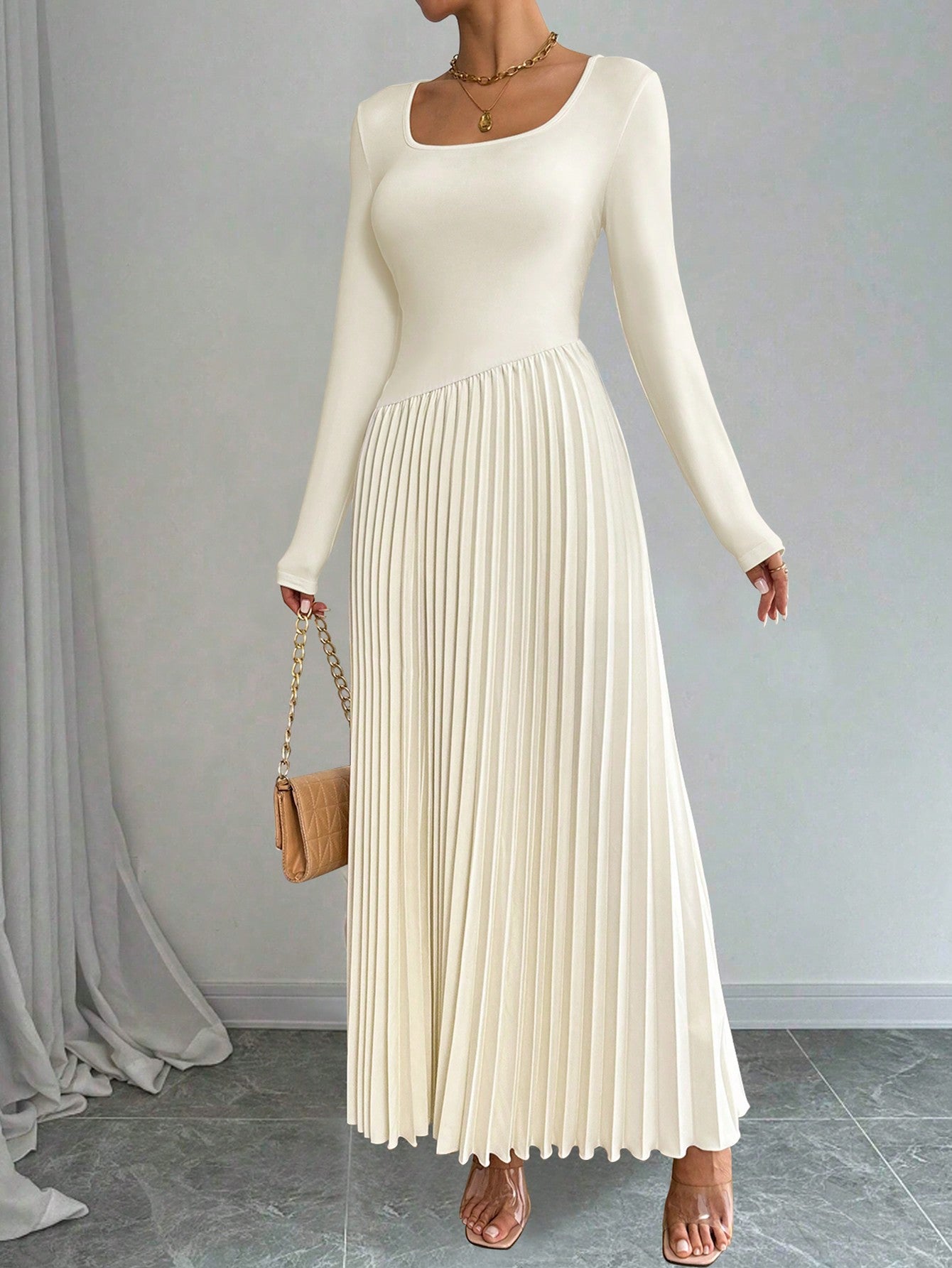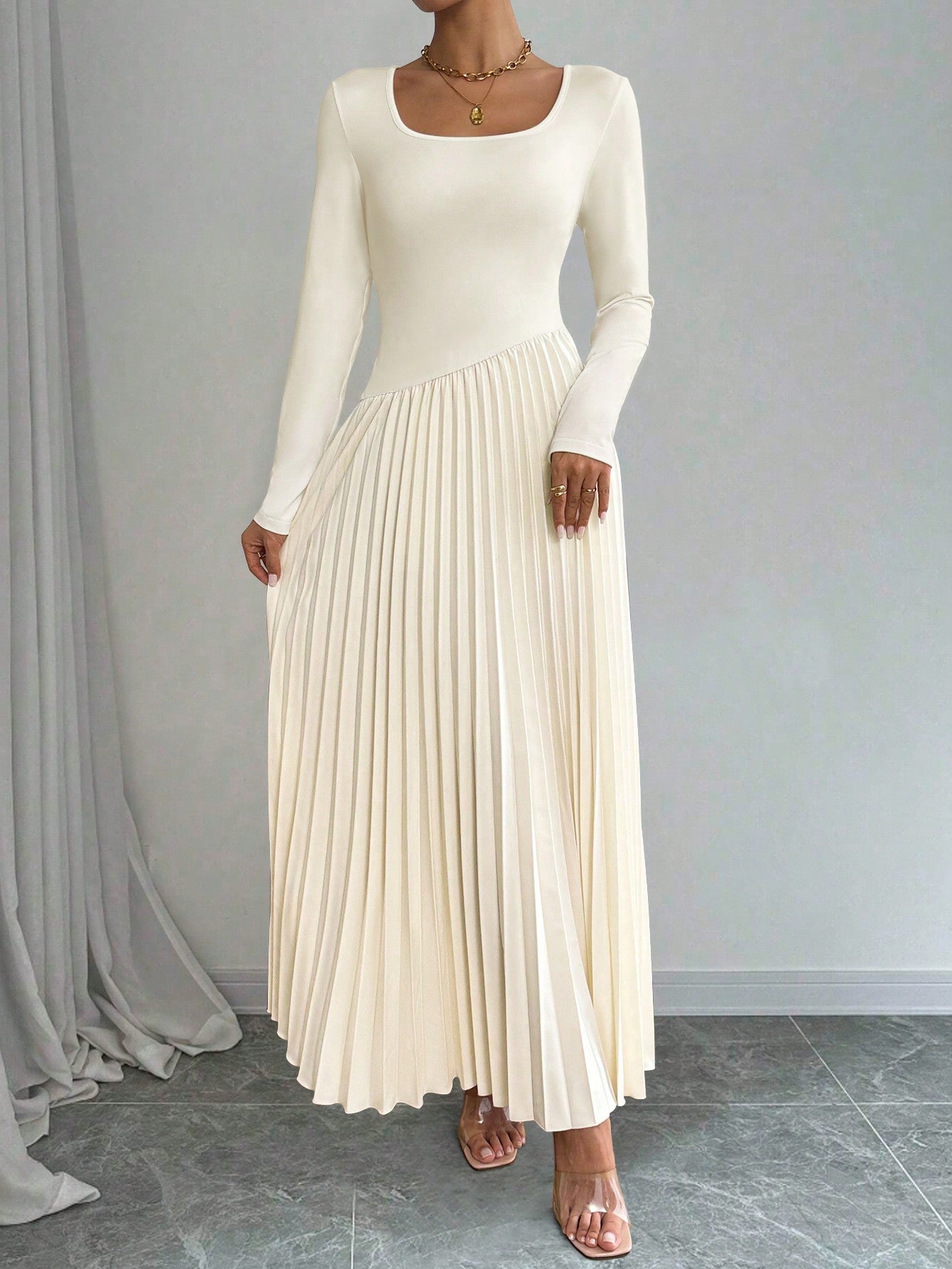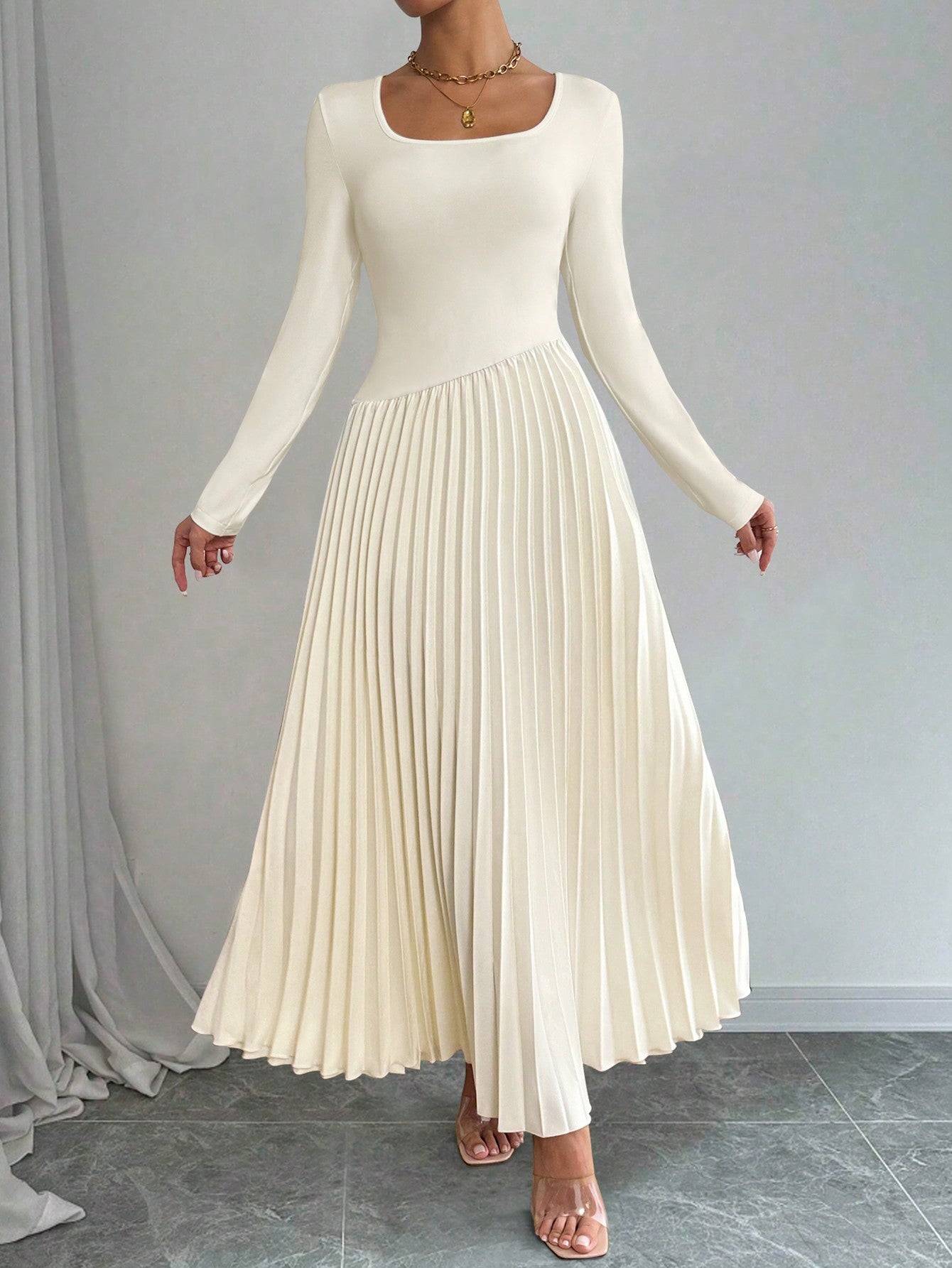 فستان أنيق ذو تصميم مطوي طويل الأكمام بياقة مربعة للنساء