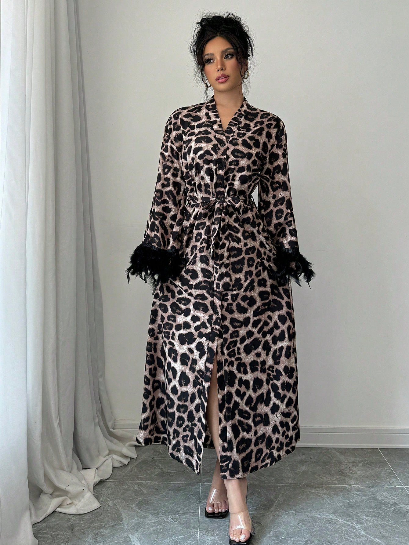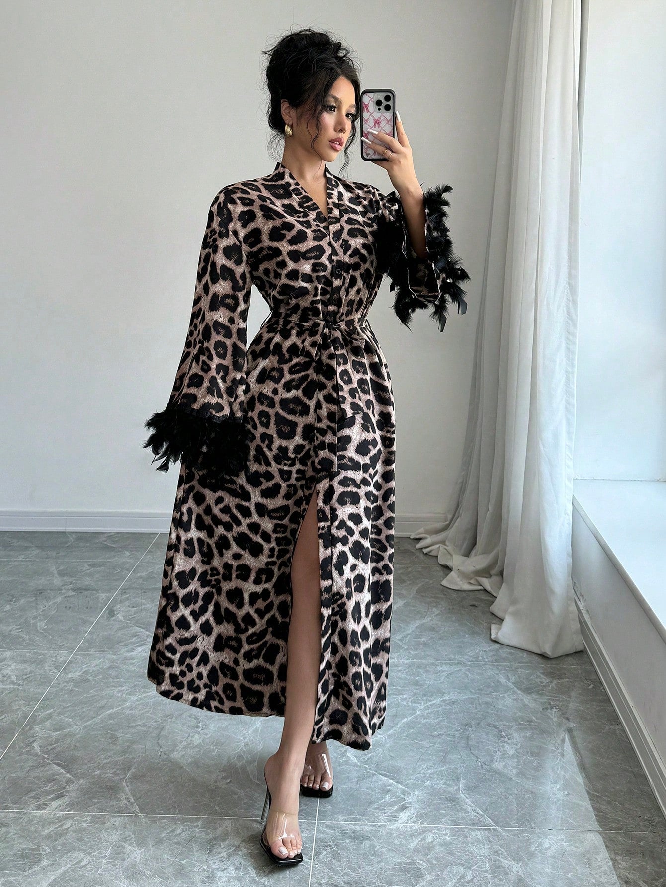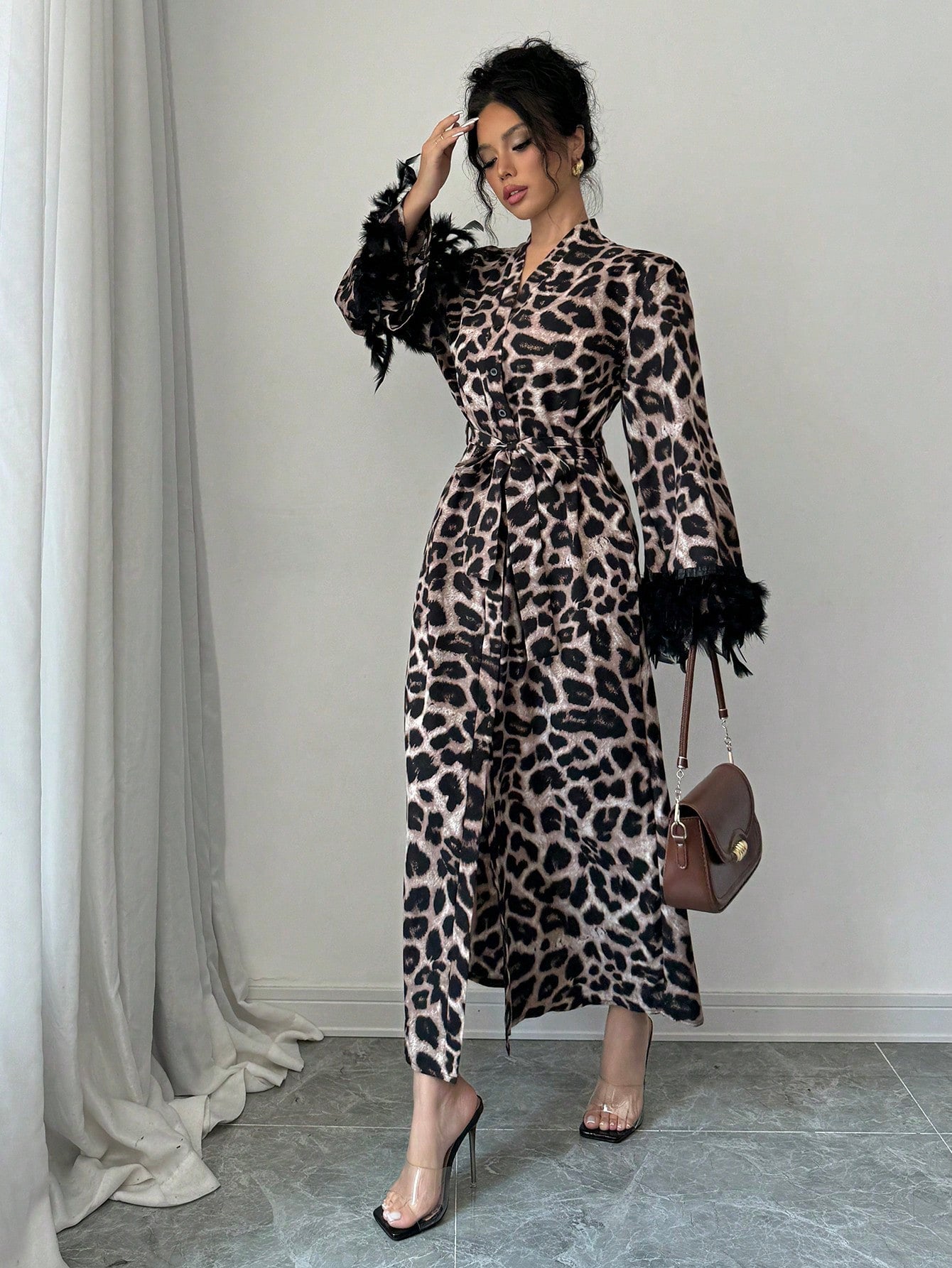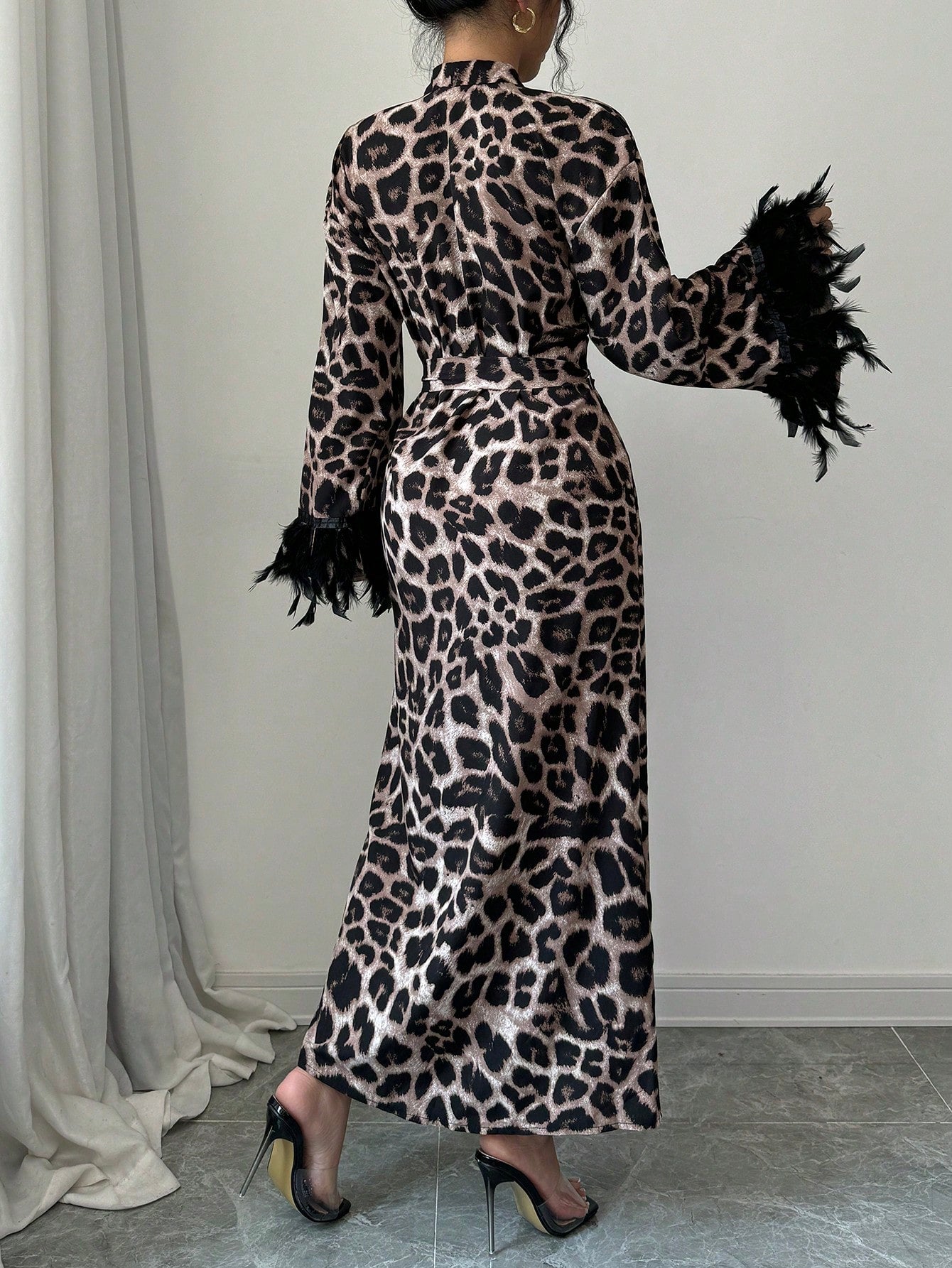 فستان أنيق طويل بتريمينج من ريش وطباعة نمر للنساء، ربيع وخريف