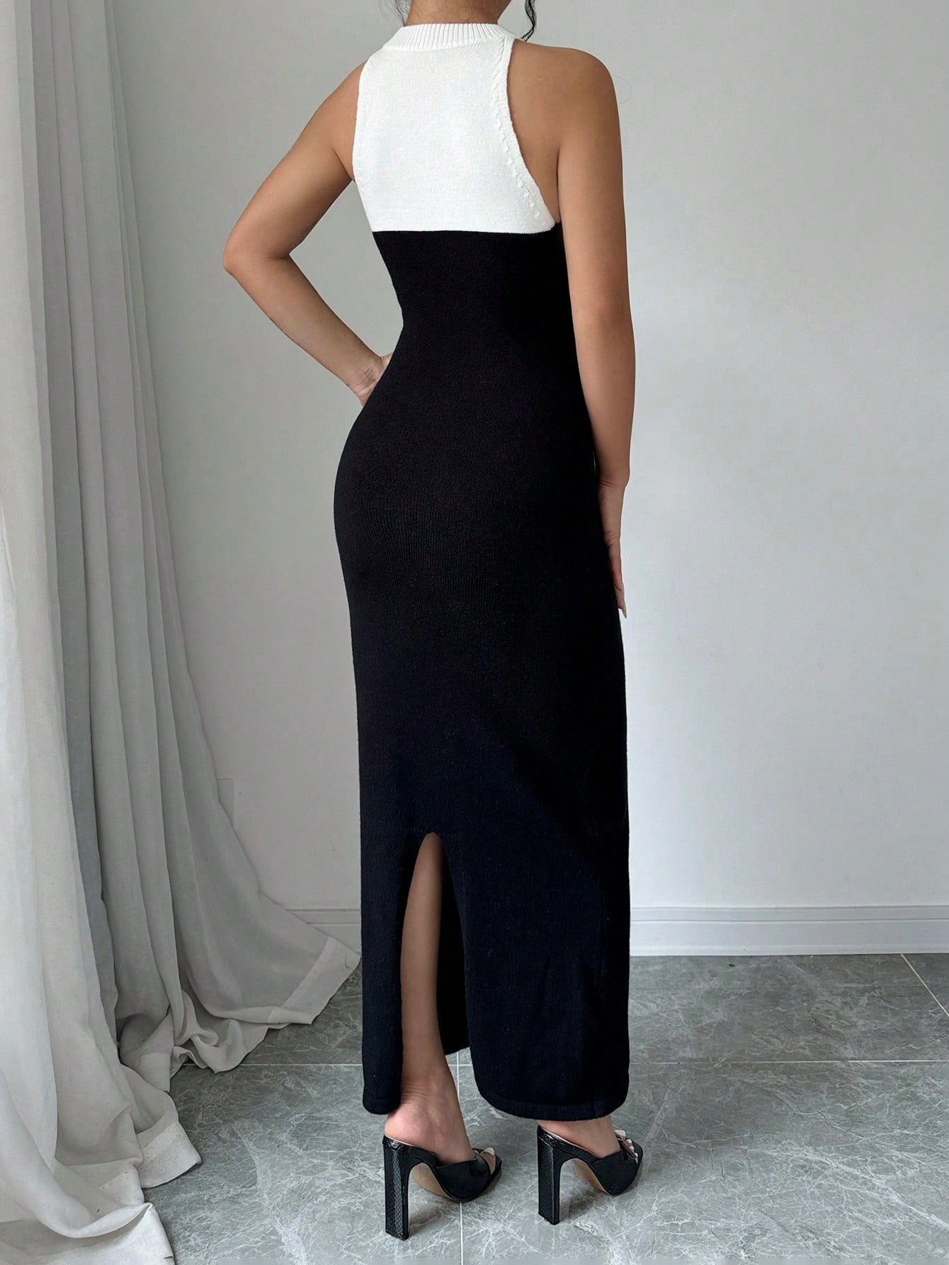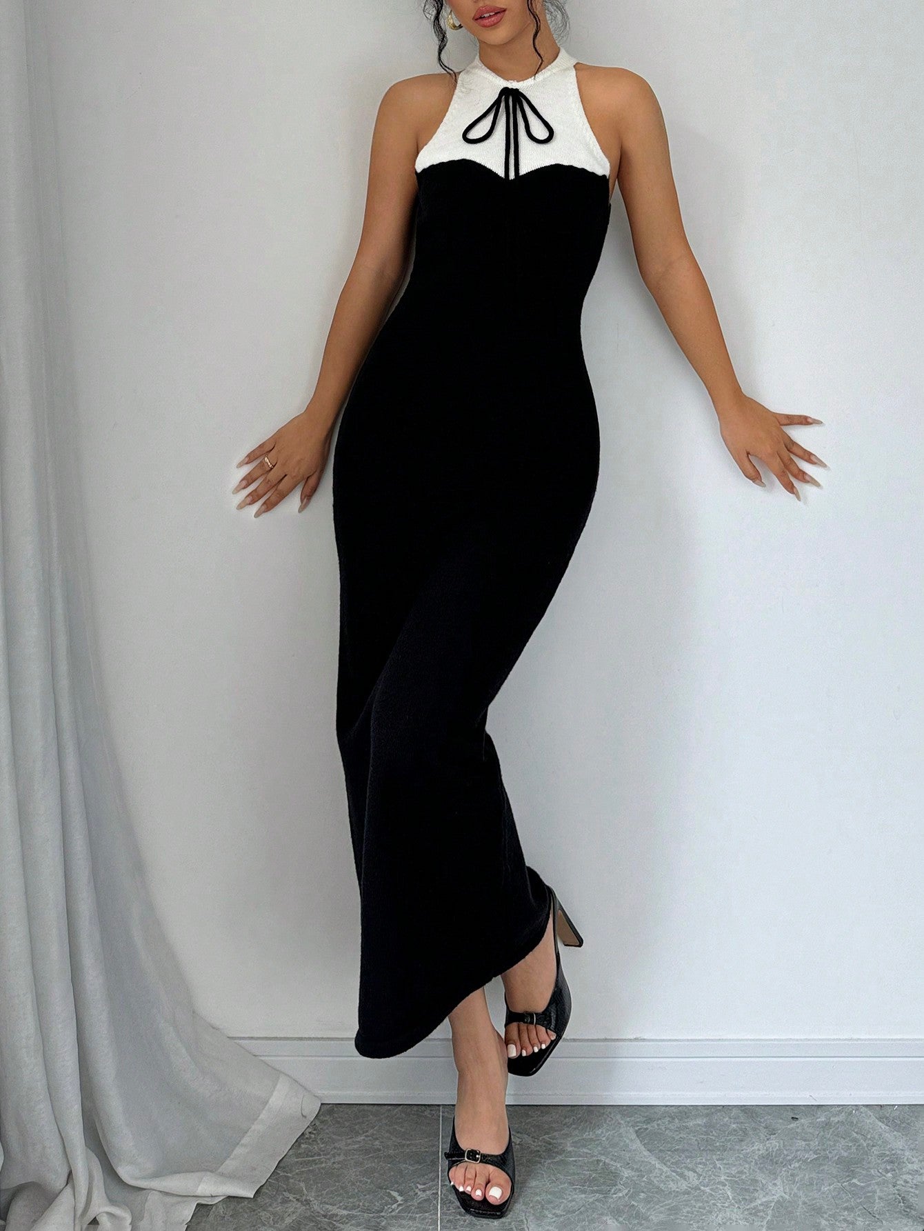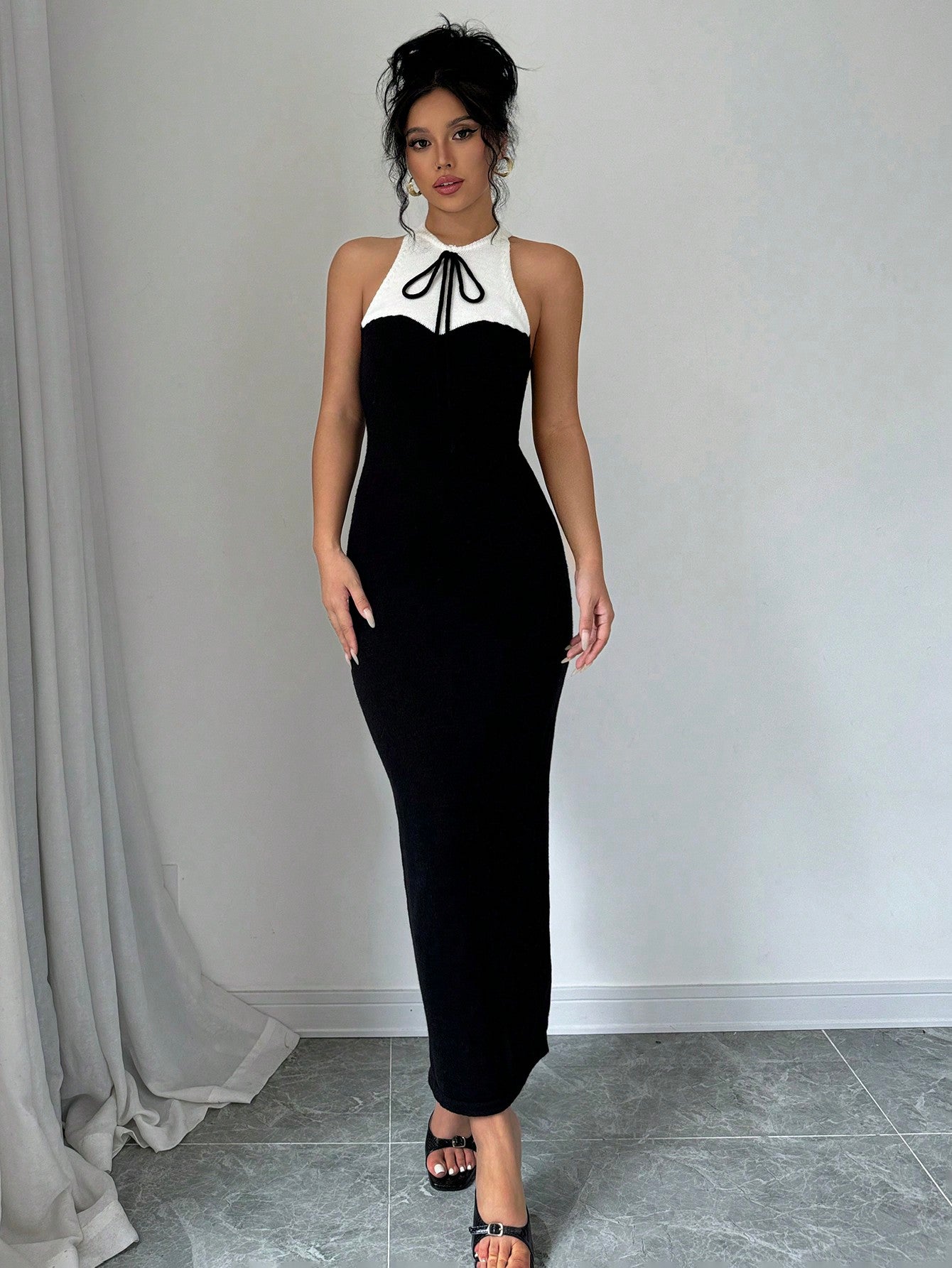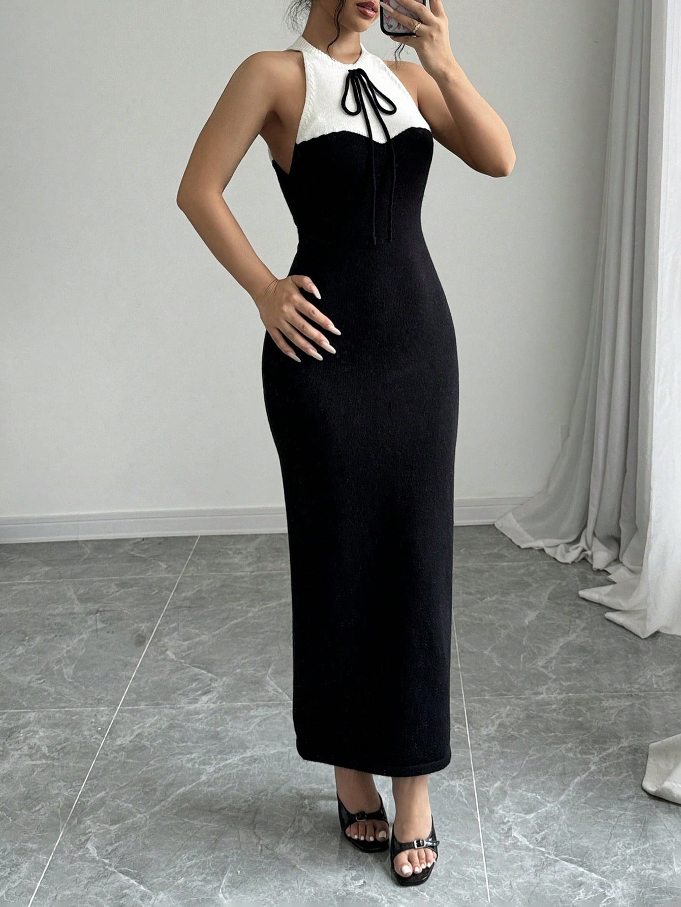 فستان السويتر المحبوك أنيق مناسب تنفيذ مربعات الألوان أبيض وأسود مع ربطة الخصر للنساء