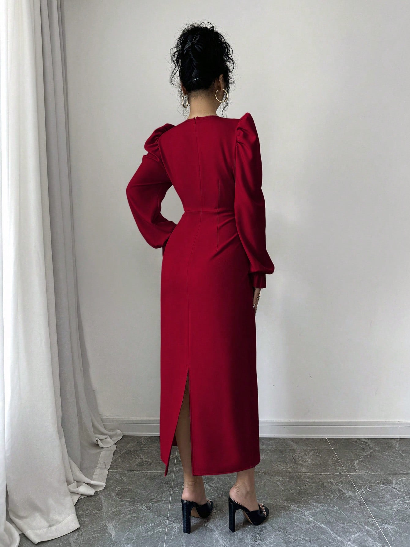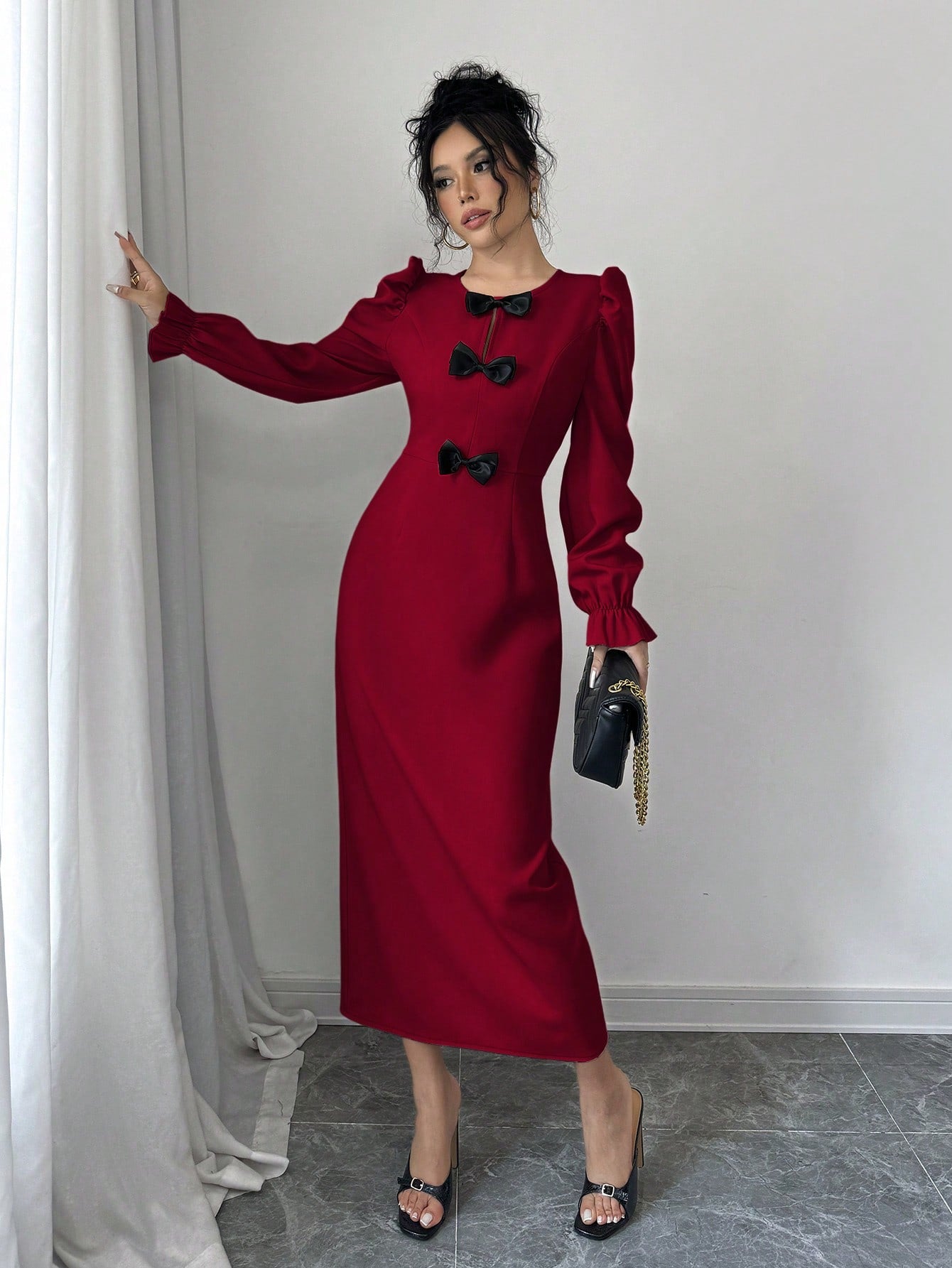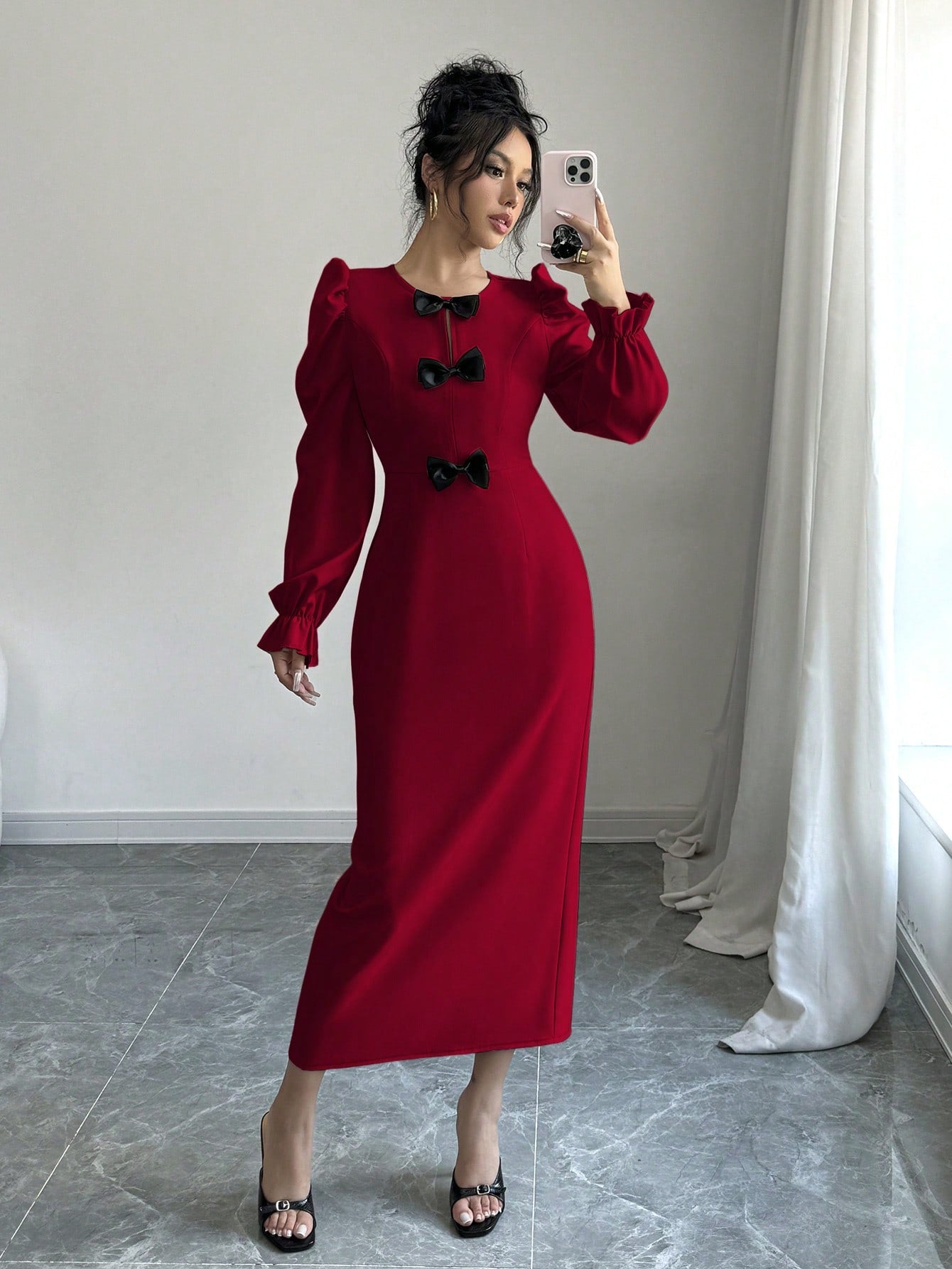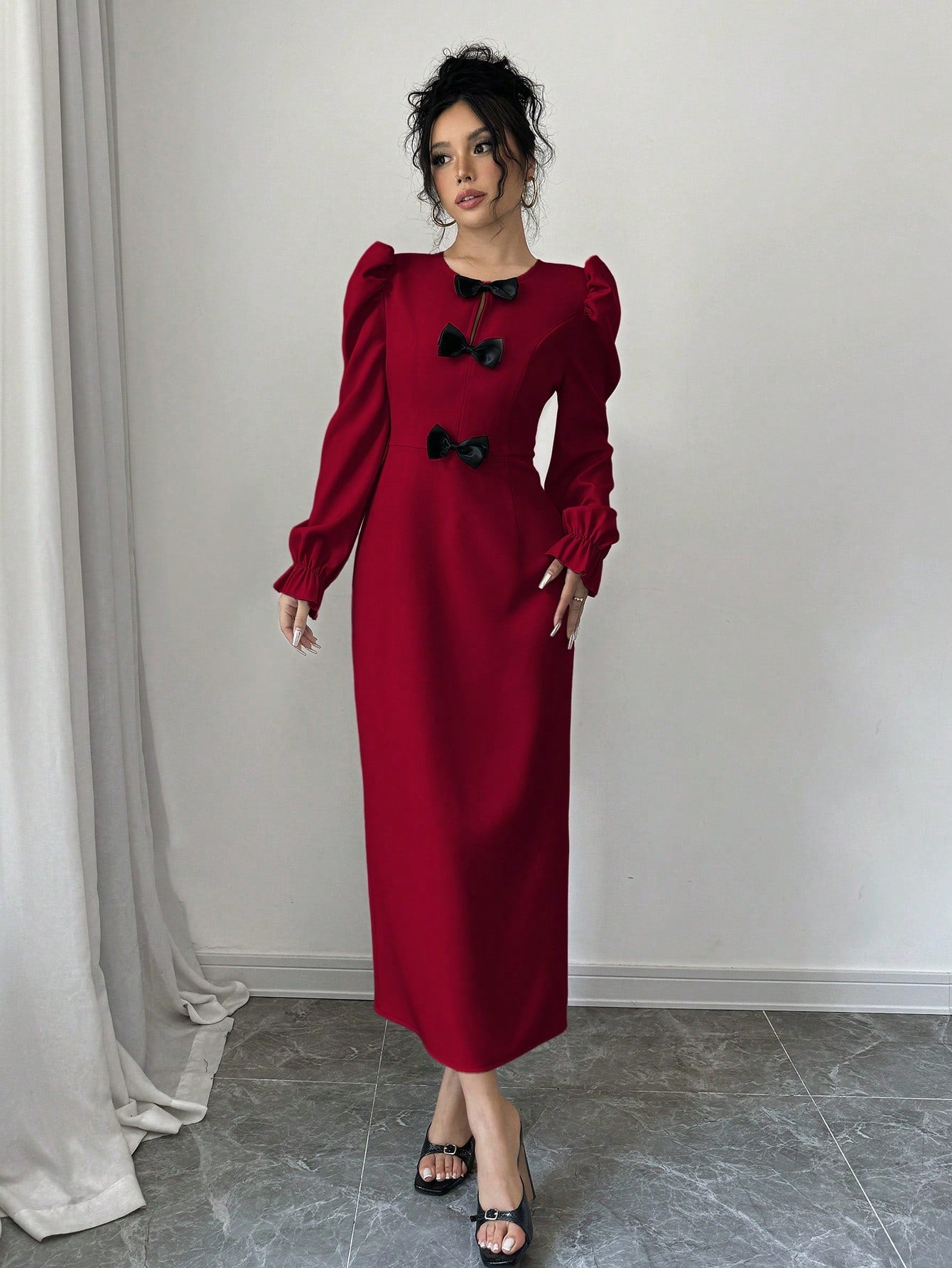 فستان المرأة الأنيق بأكمام منتفخة وتصميم العقدة