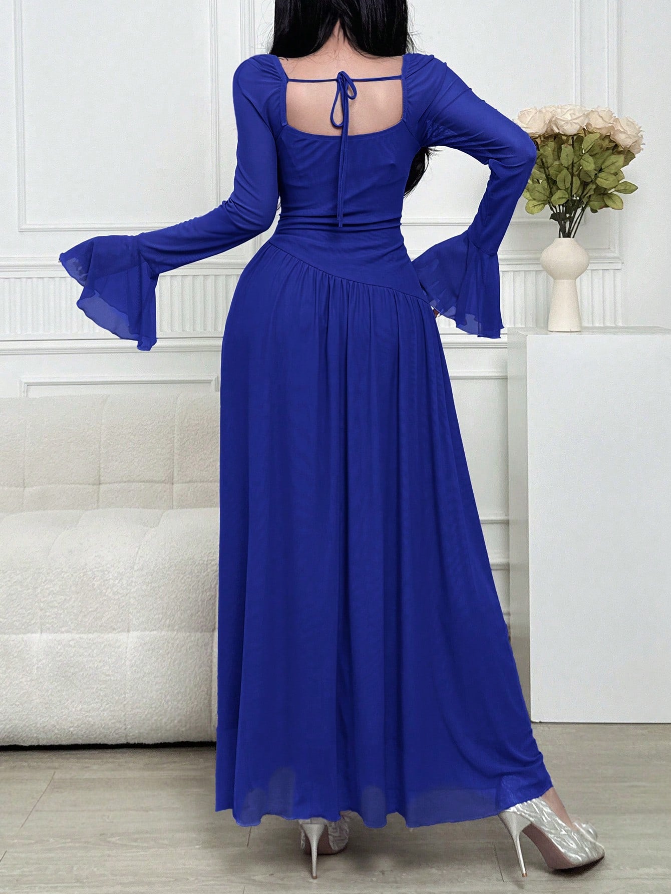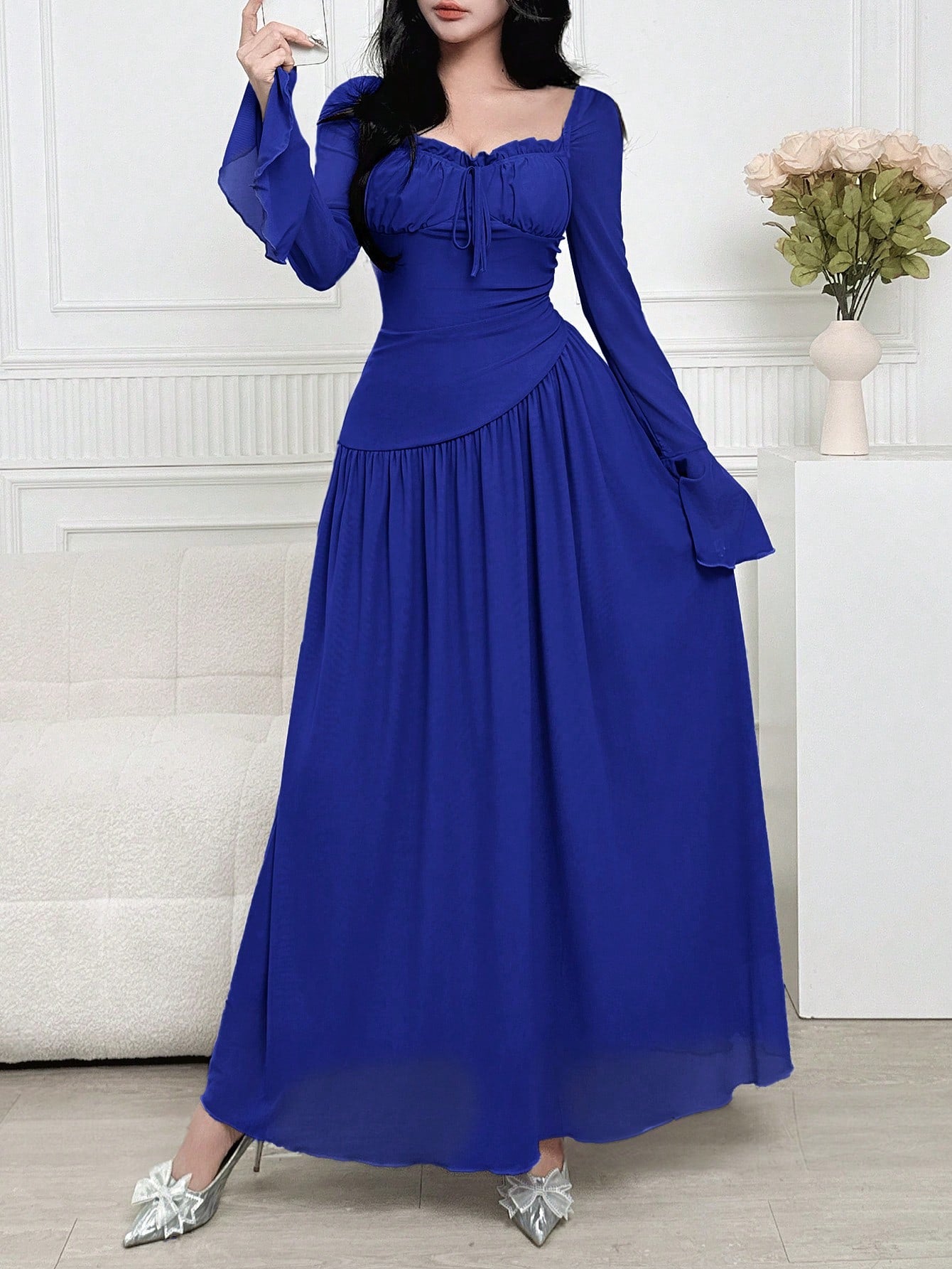 فستان بأكمام متدلية وياقة على شكل قلب لون بوردو أنيق للنساء
