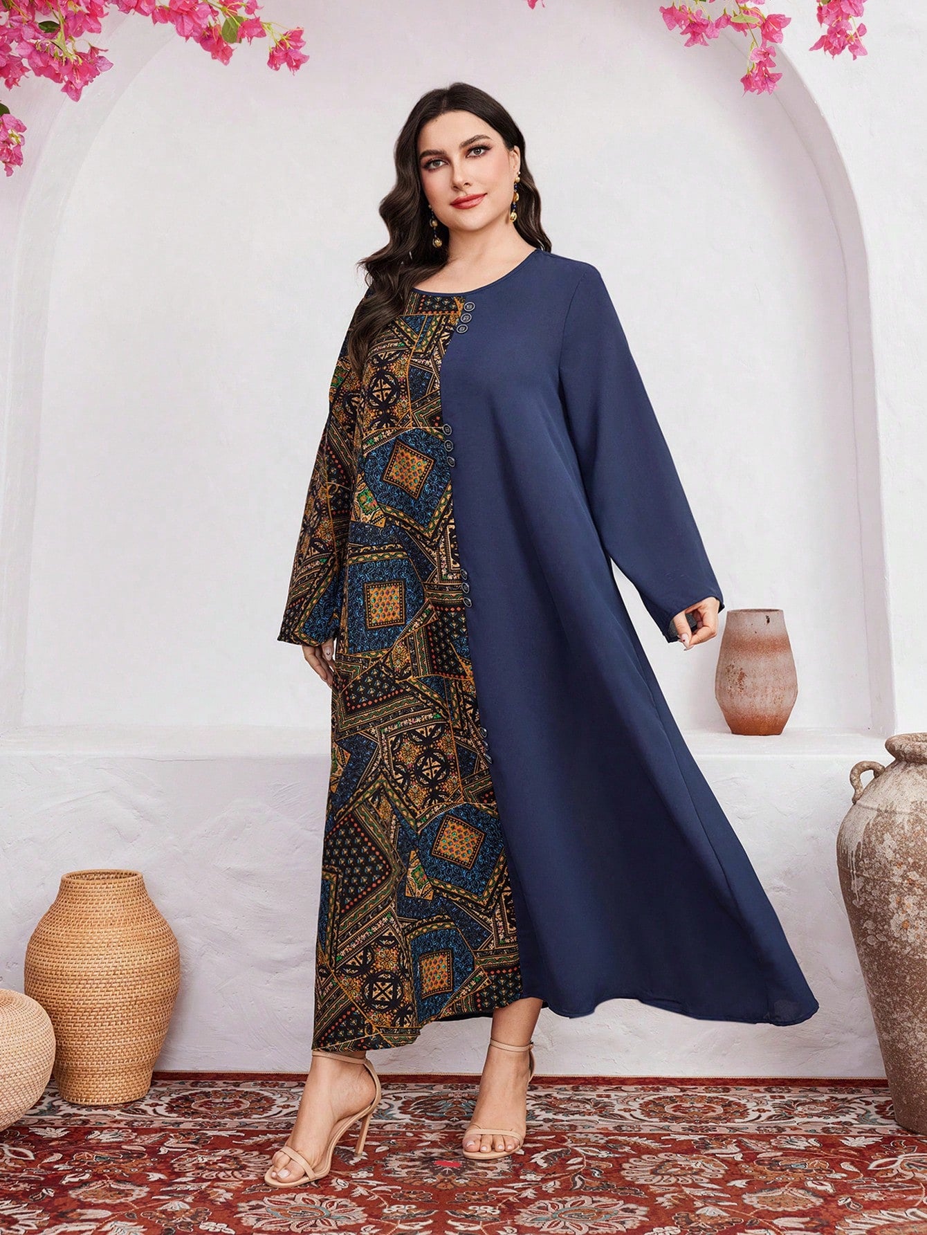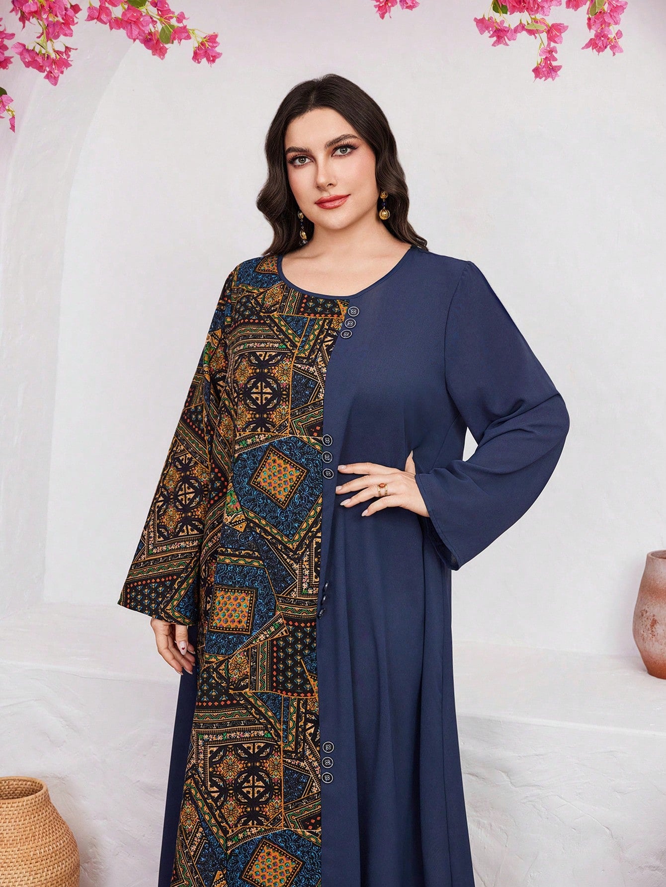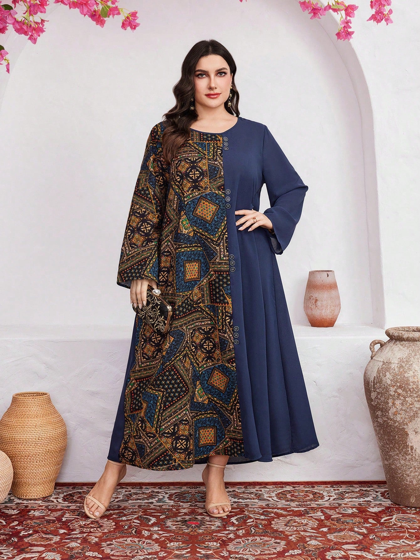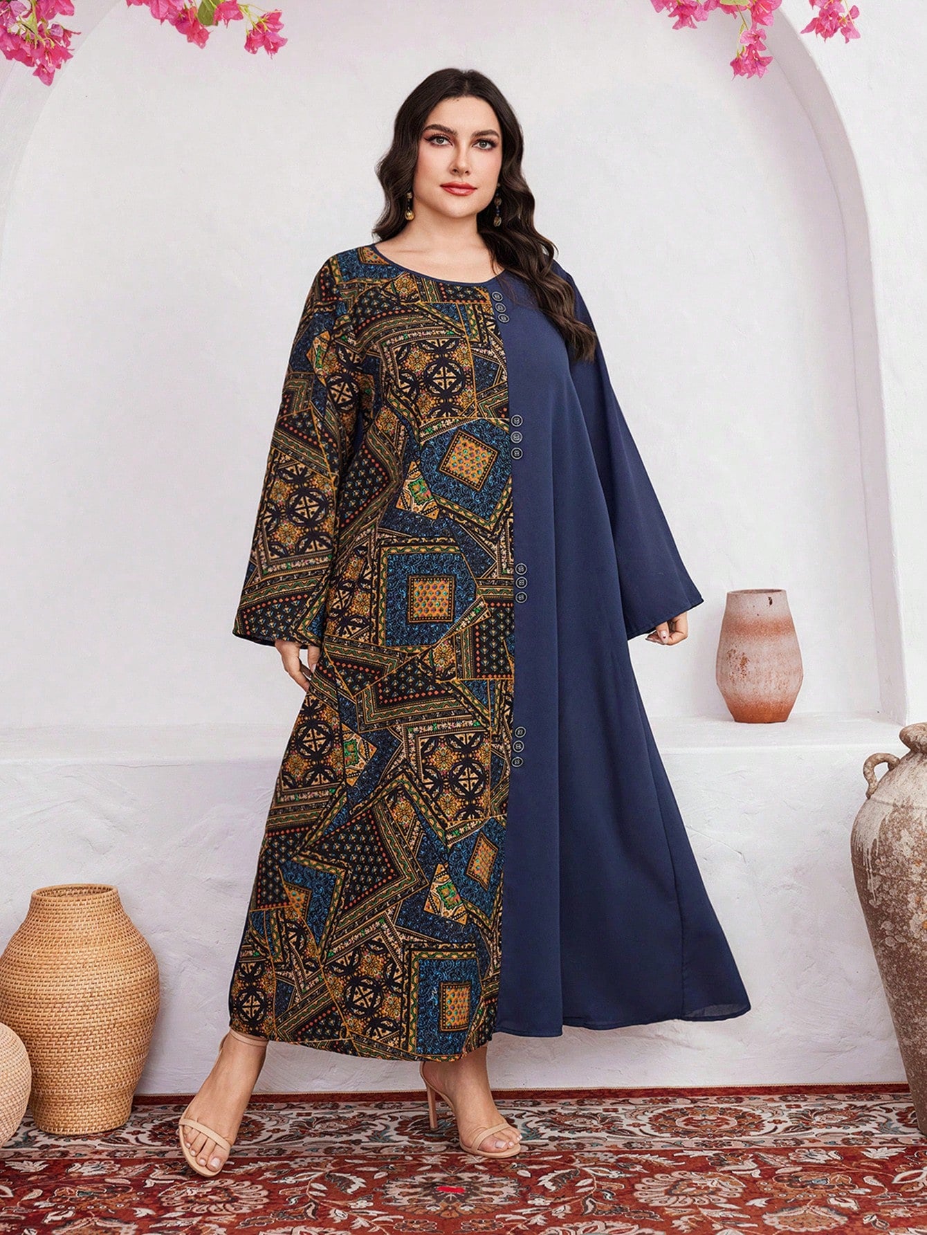 فستان بأكمام واسعة مزين بطبعات وقطع مختلفة مخصص للمقاسات الكبيرة