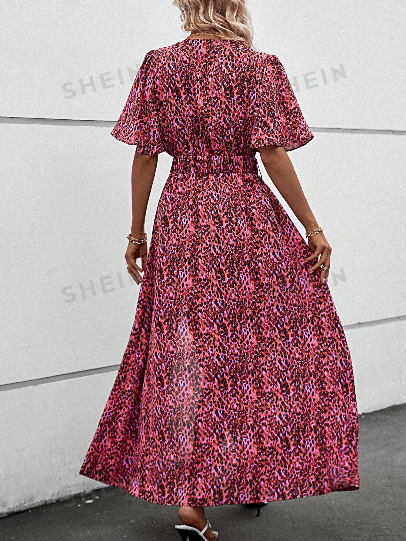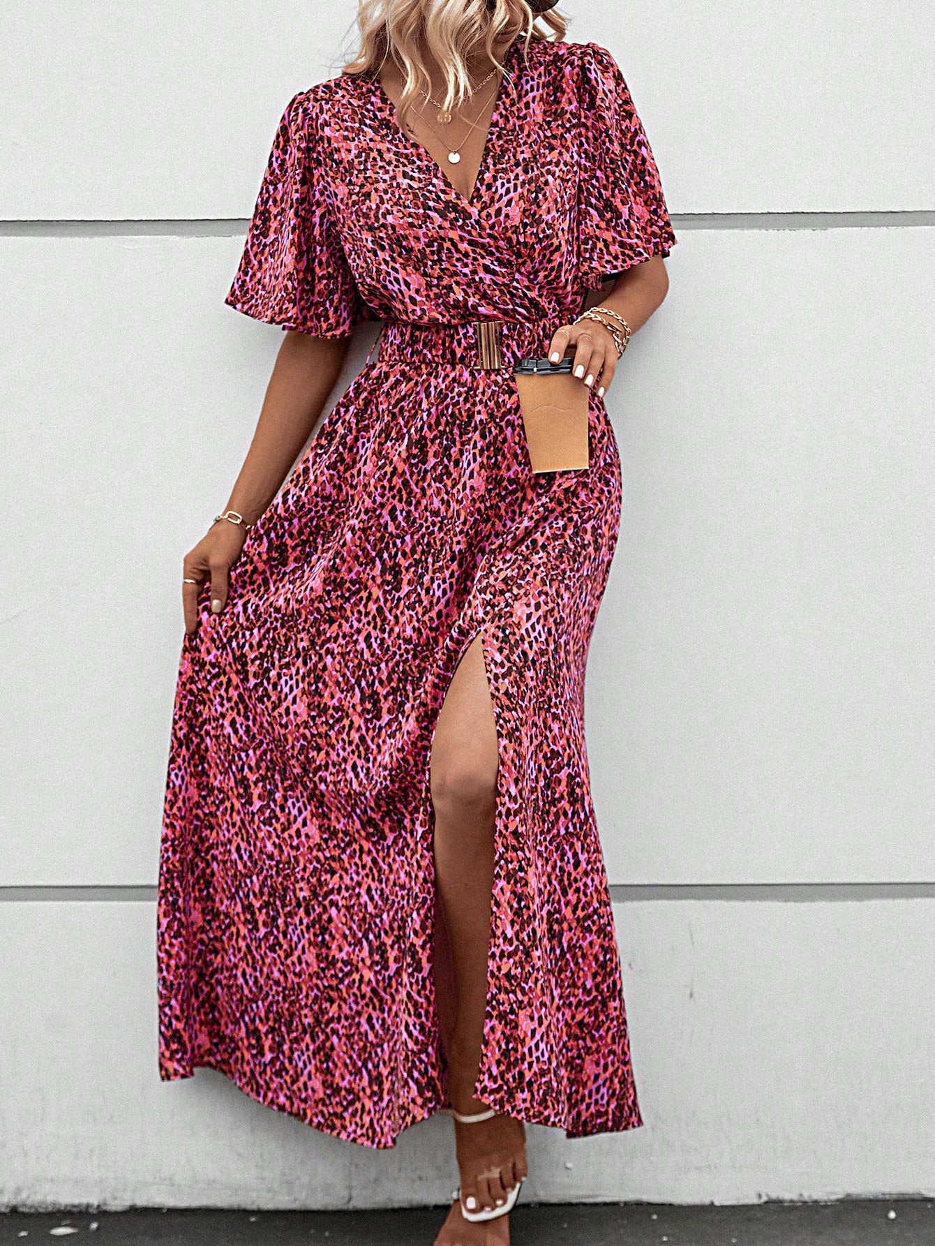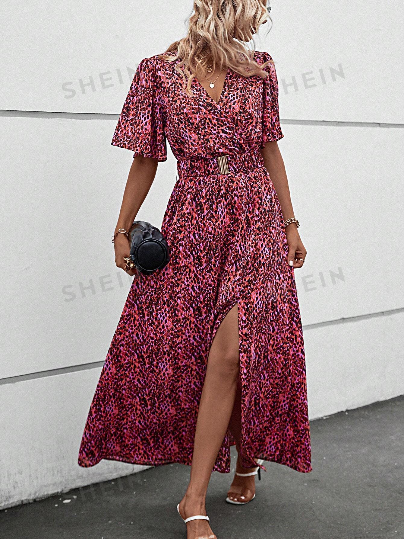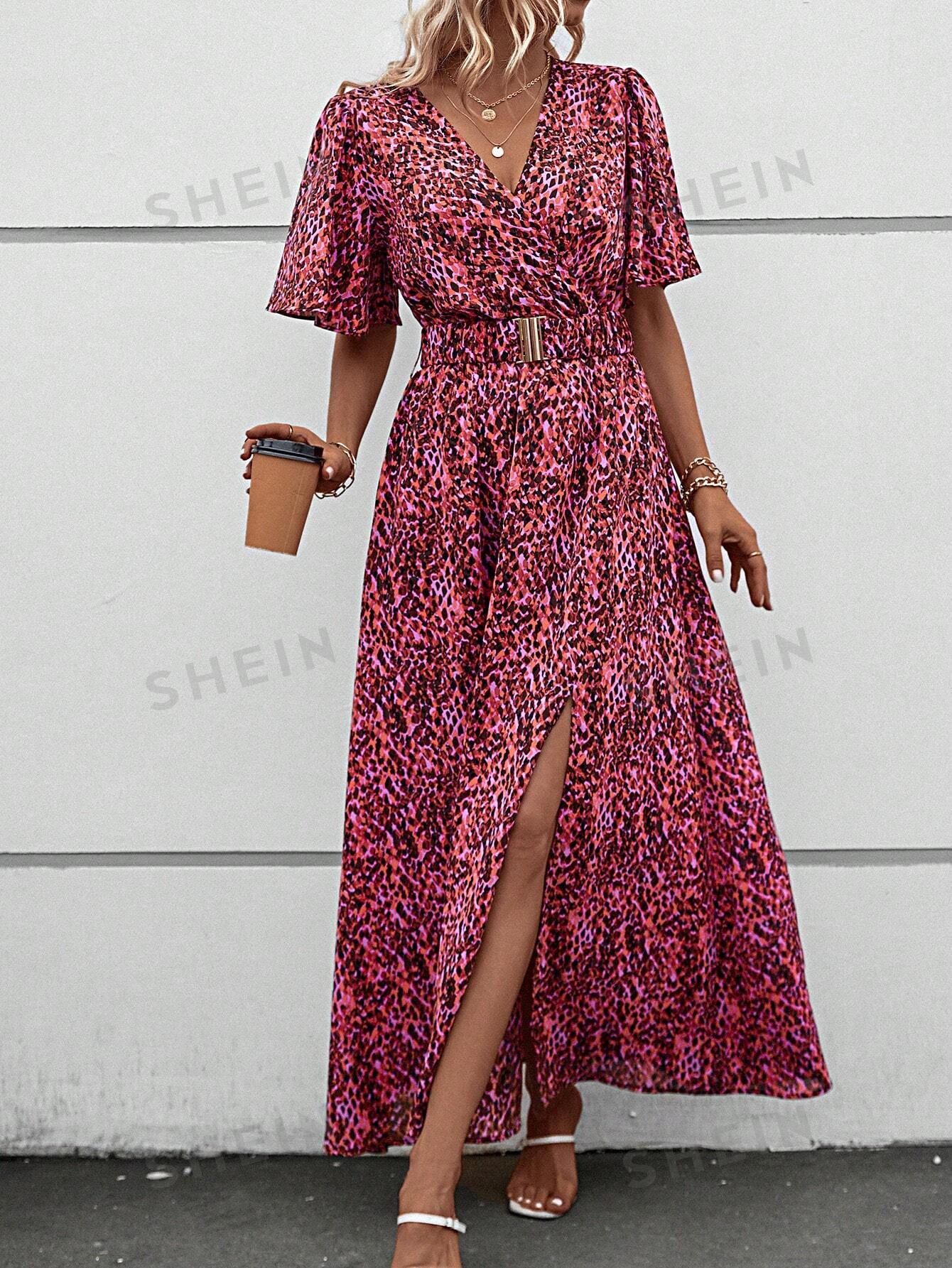 فستان بحزام طباعة شامل اكمام فراشة فتحة للفخذ