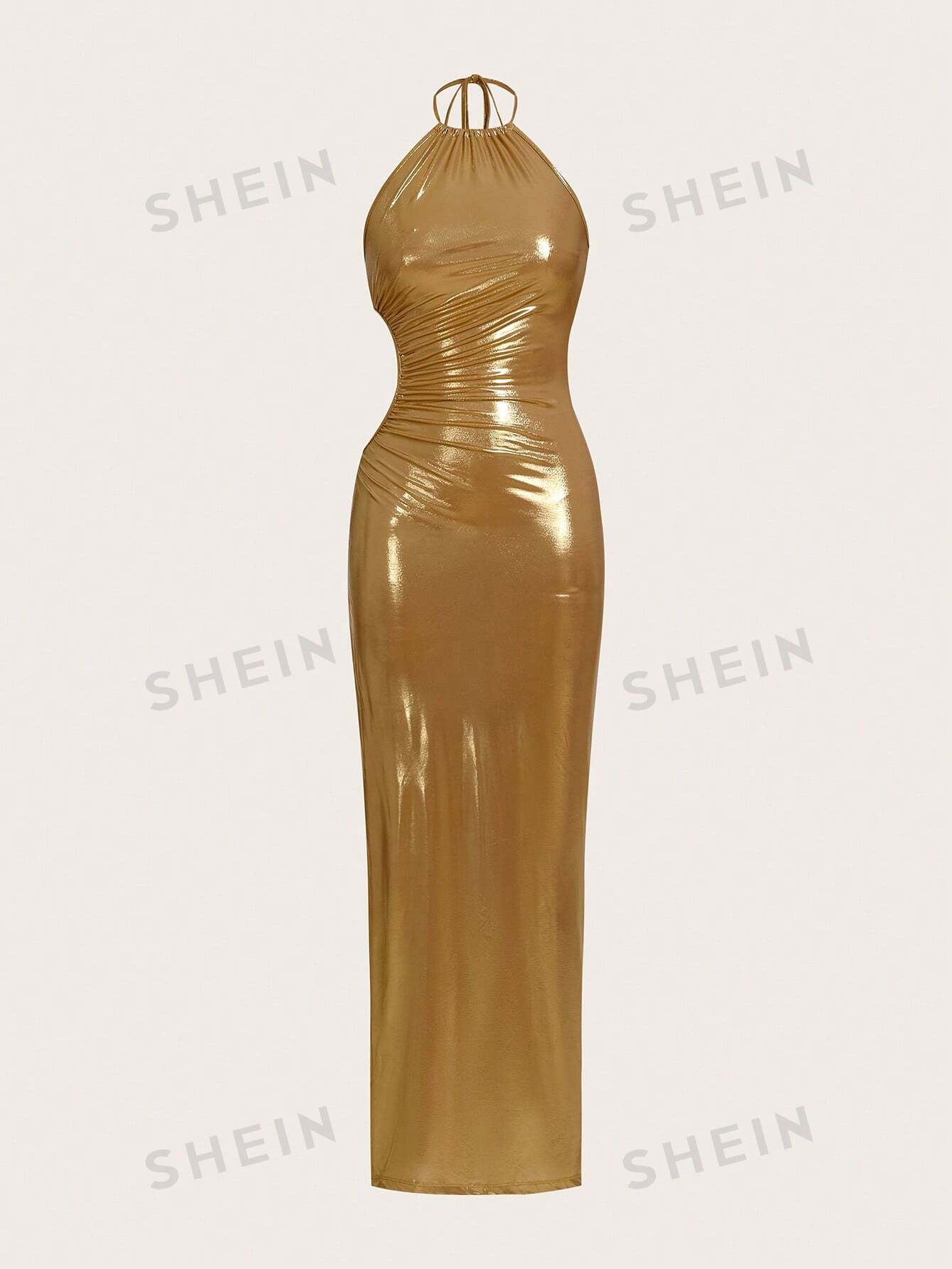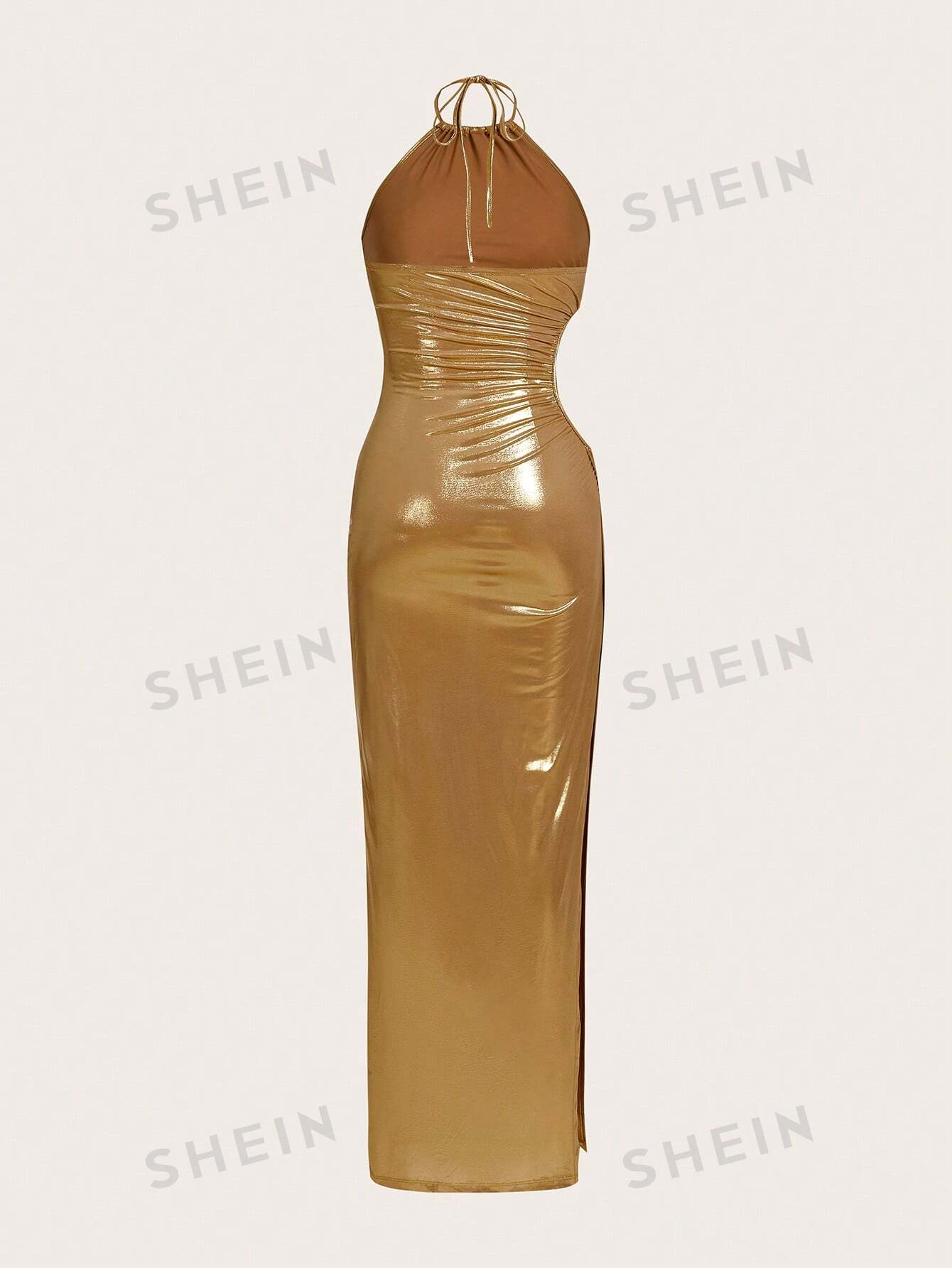 تفاصيل : عارية الذراعين, رباط الظهر, الثنية, شق عالية إلى الفخذ
