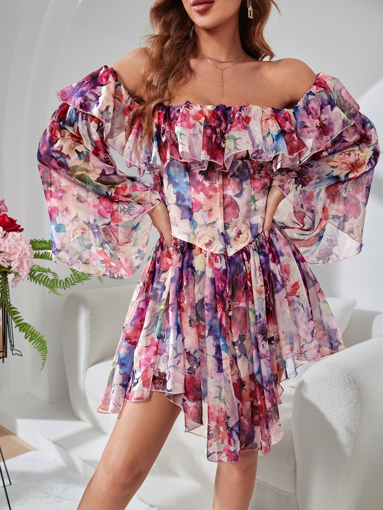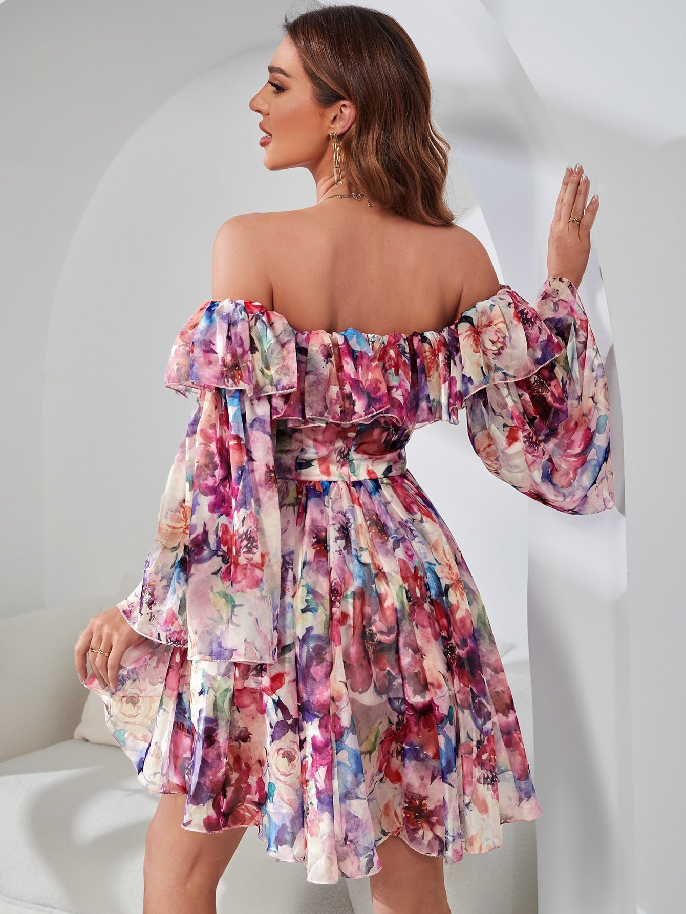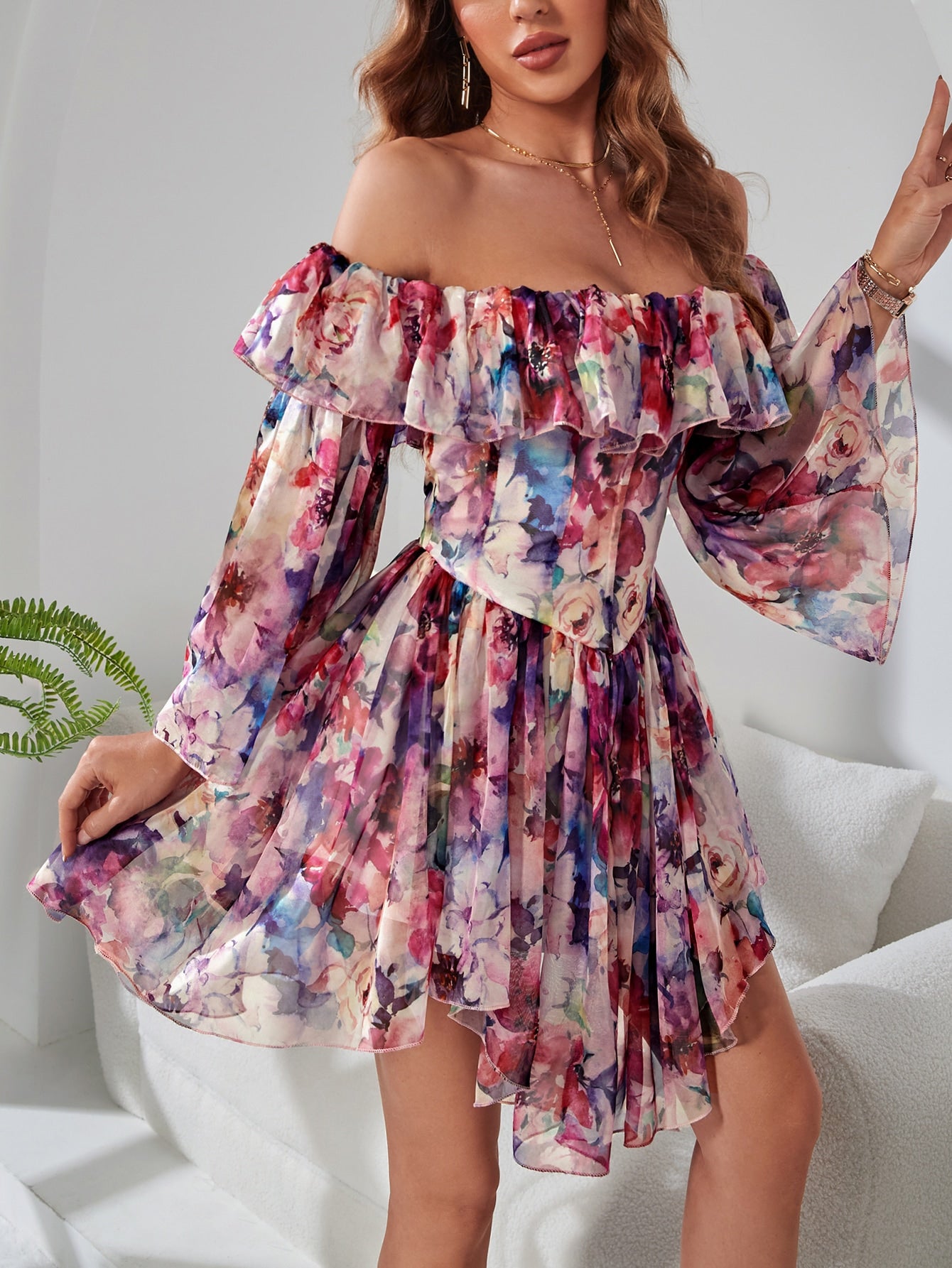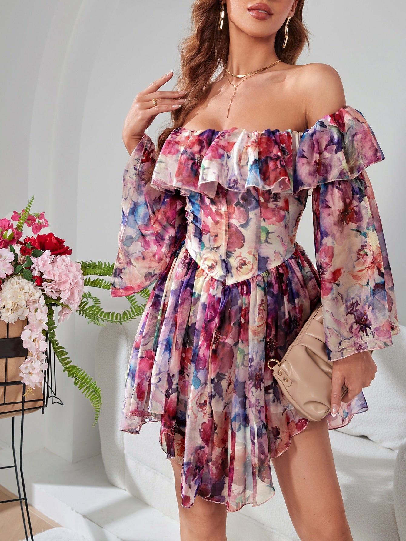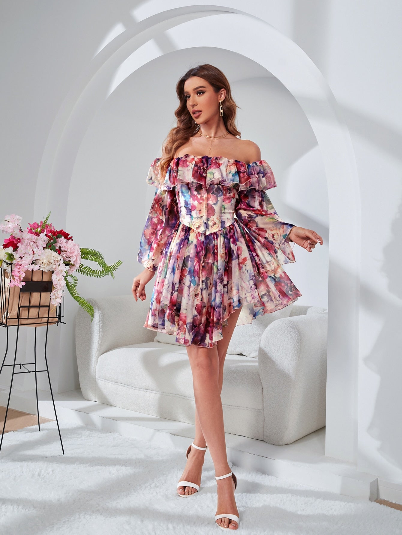 فستان بطباعة زهر شامل مقلم بكشكش حمالة
