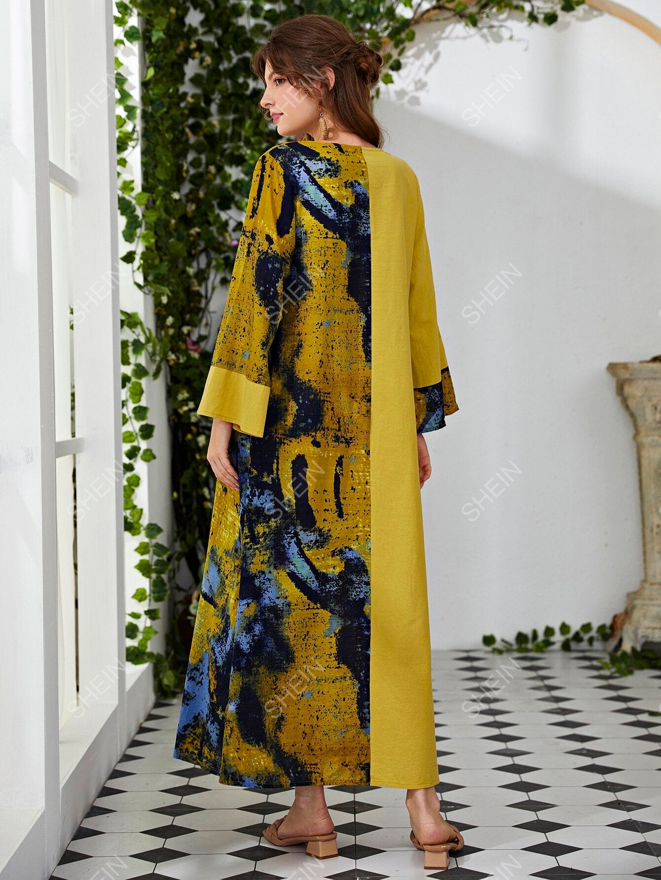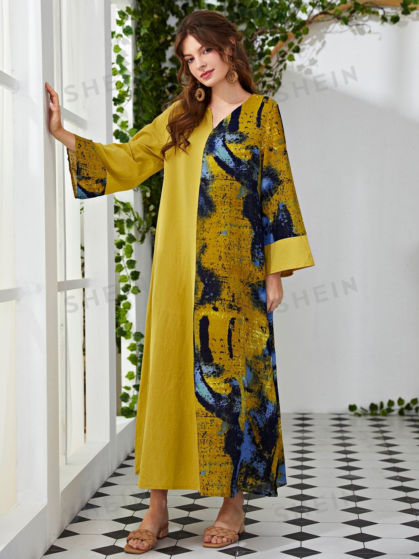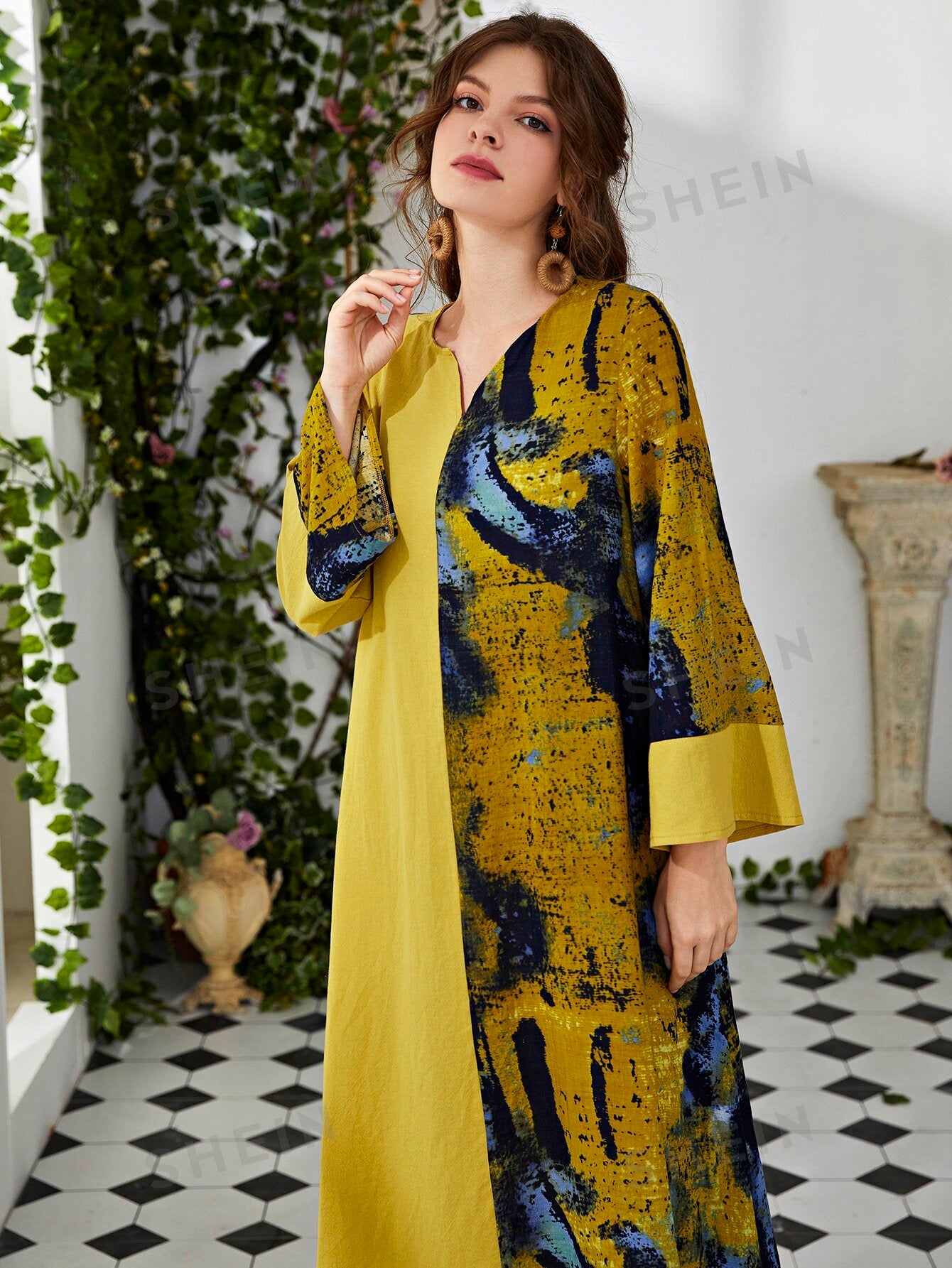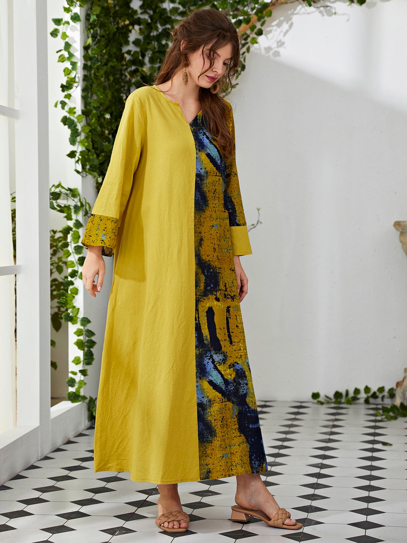 فستان تونك عريض برقبة على شكل V وبقع ألوان