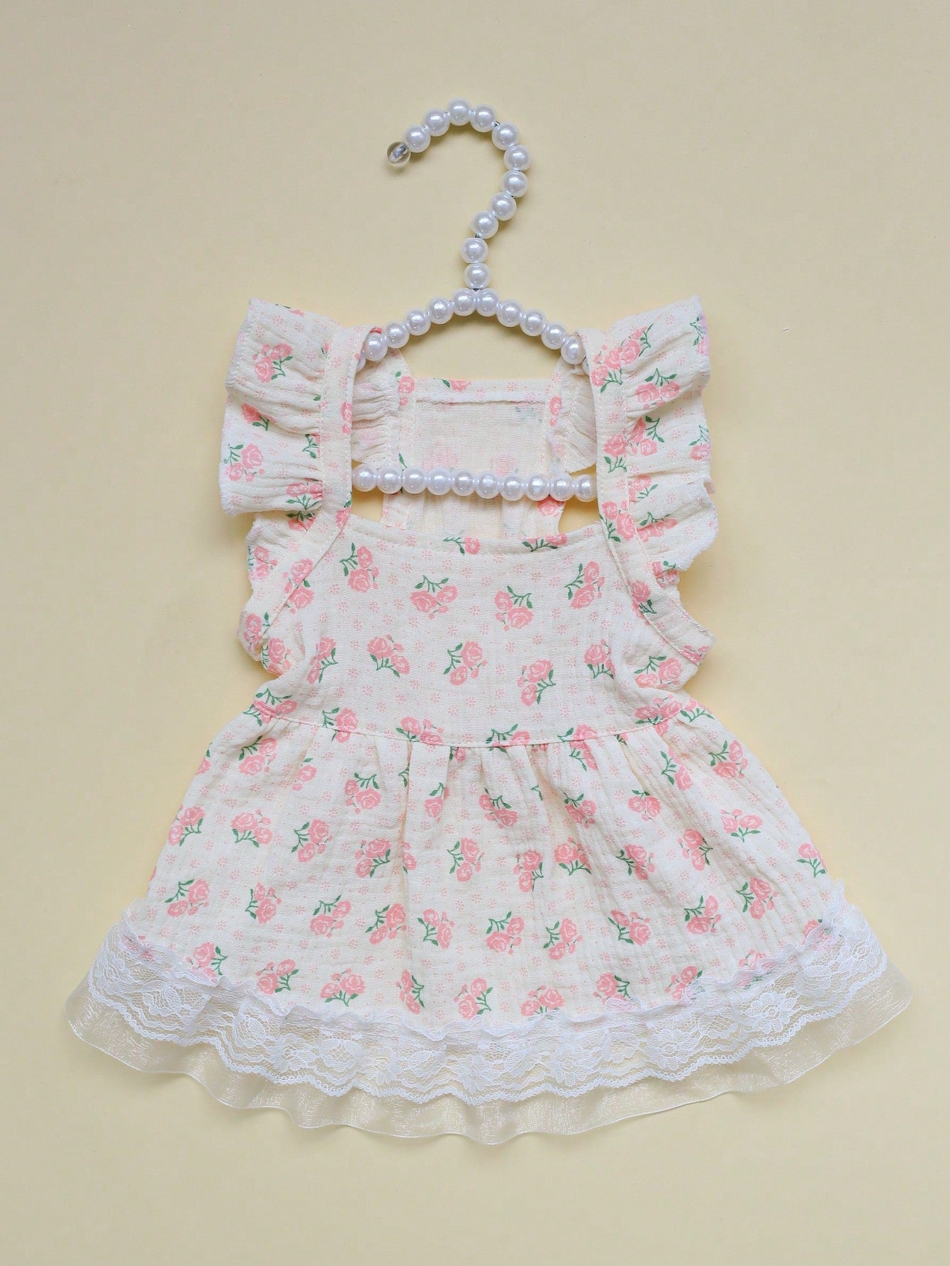 فستان حيوانات أليفة طباعة زهرة مقلم بكشكش قطعة واحدة