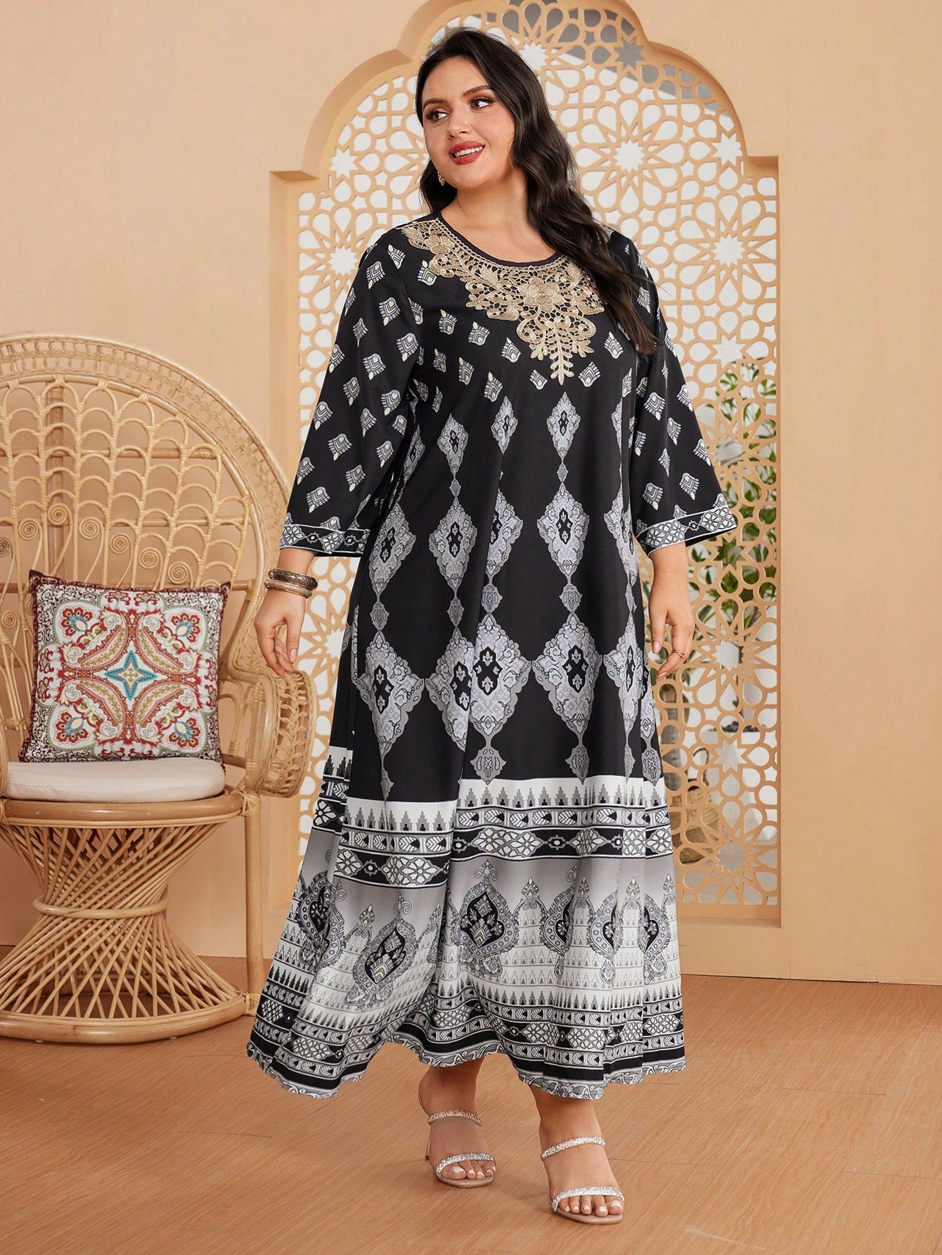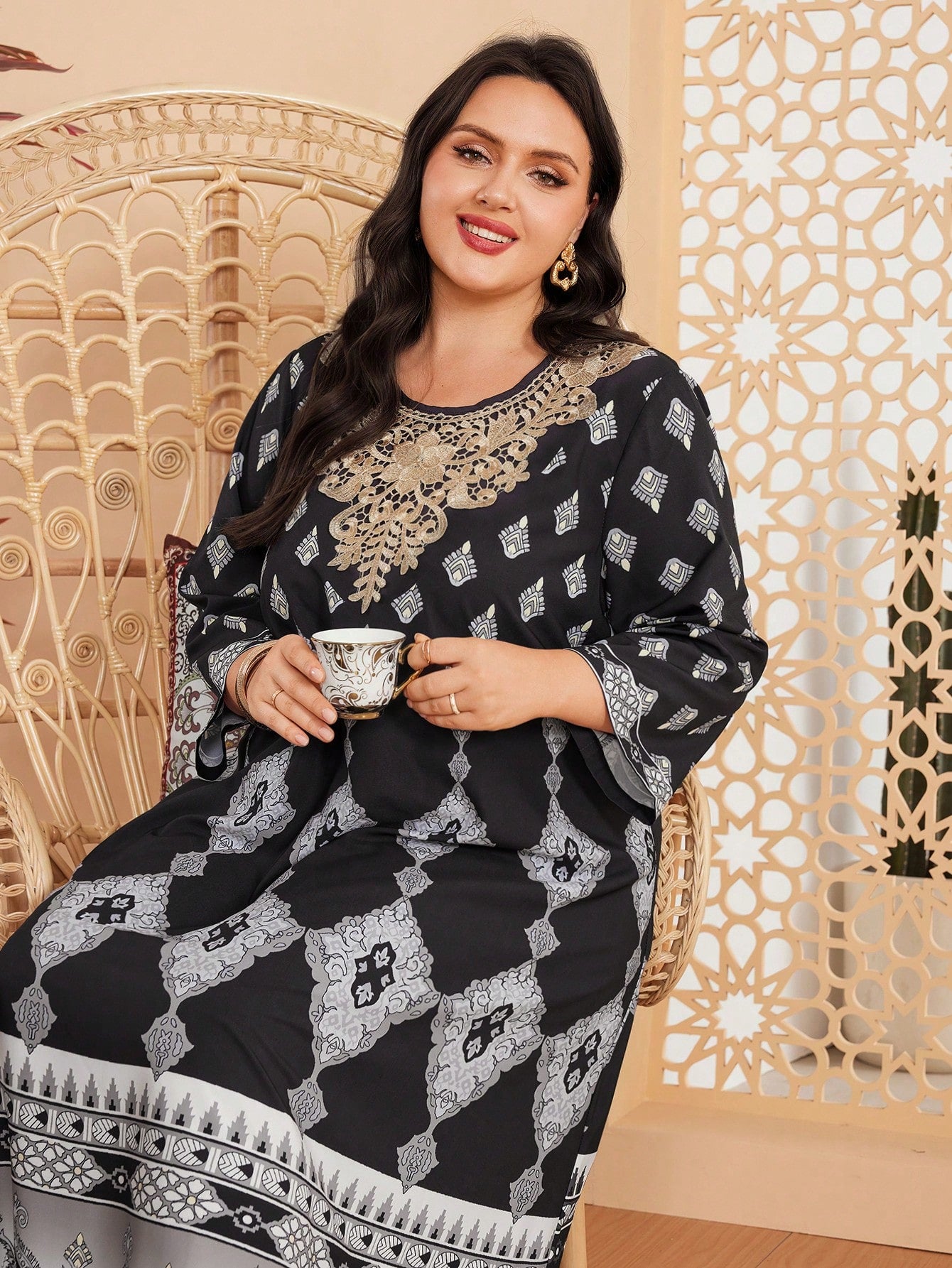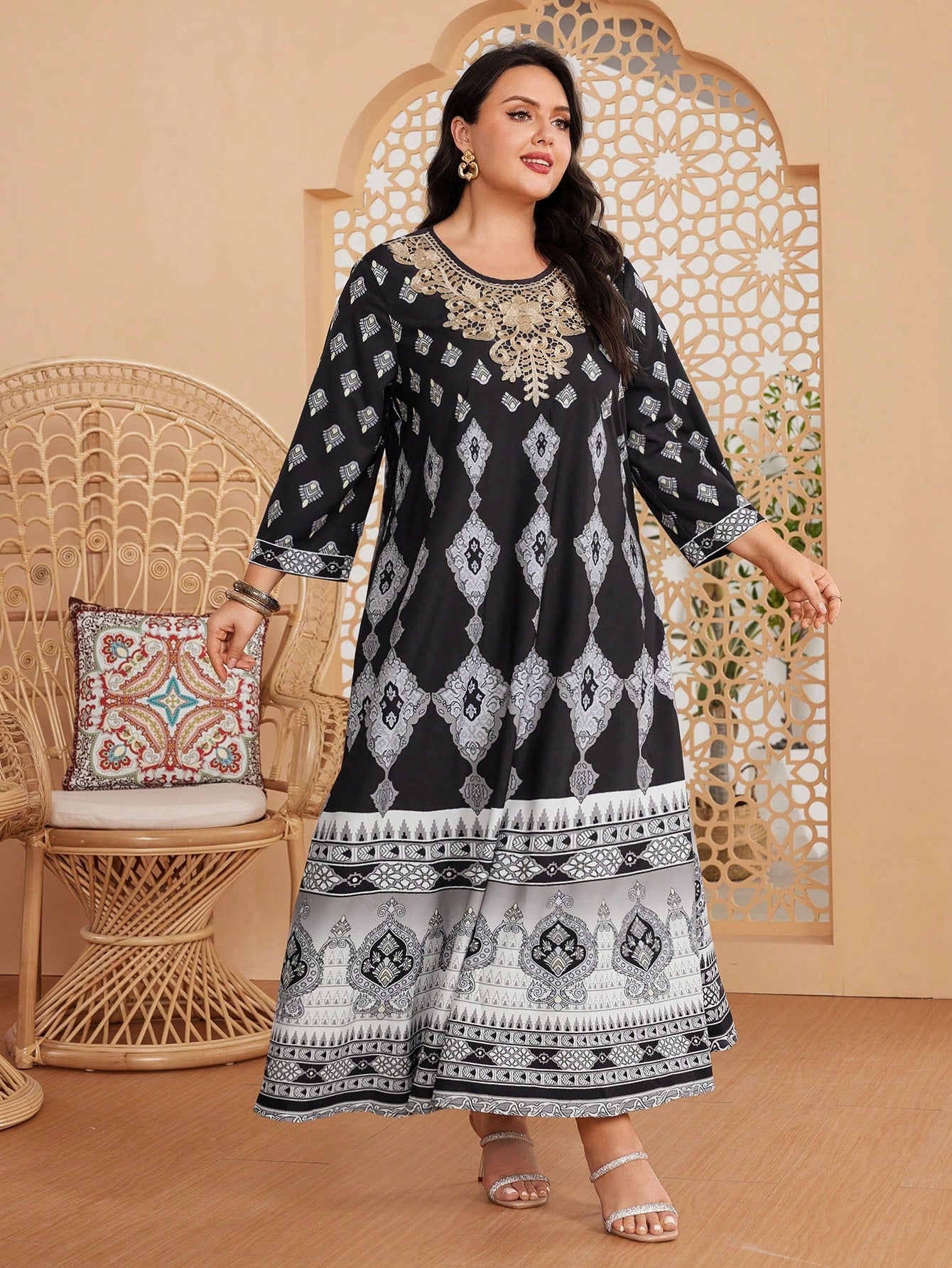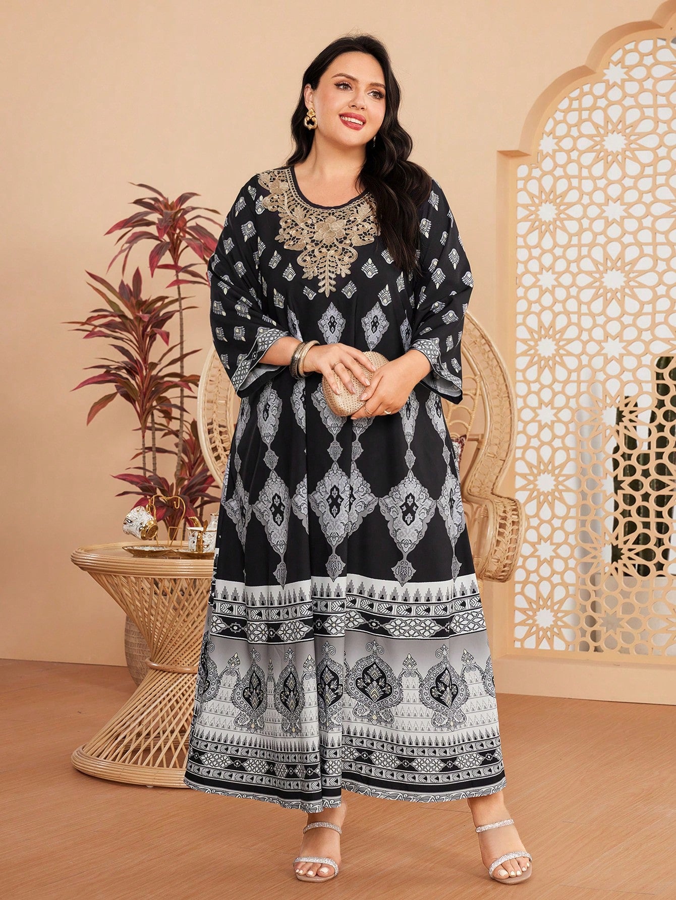فستان زهور بلس مطبوع متضارب مع دانتيل