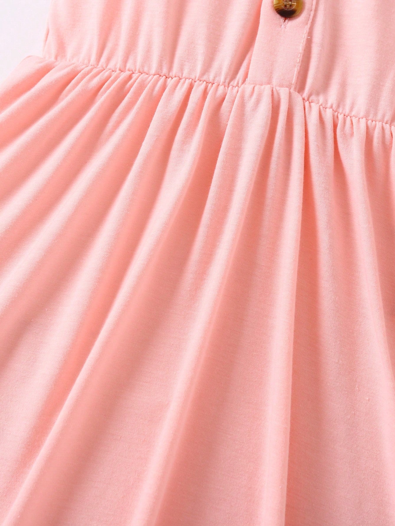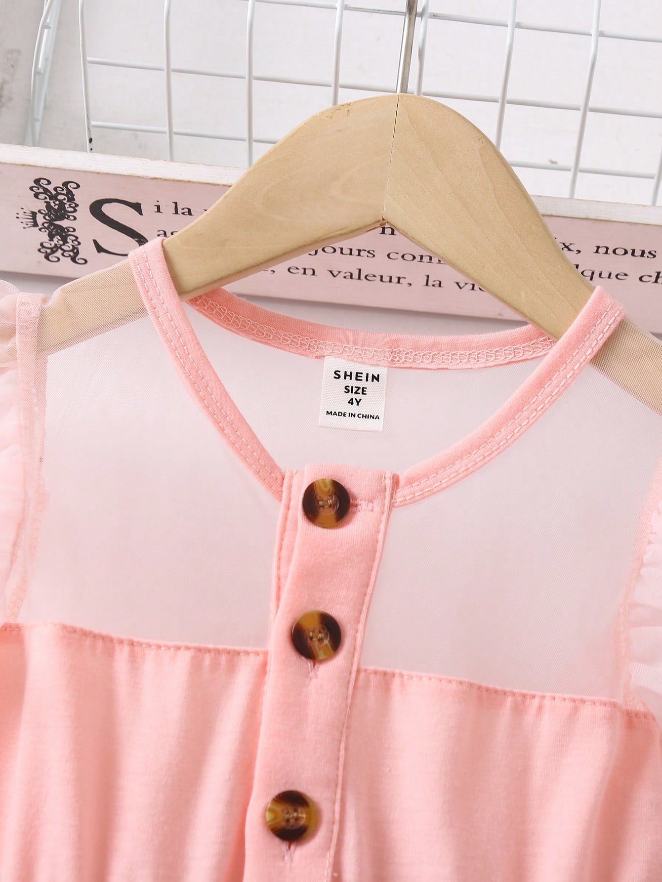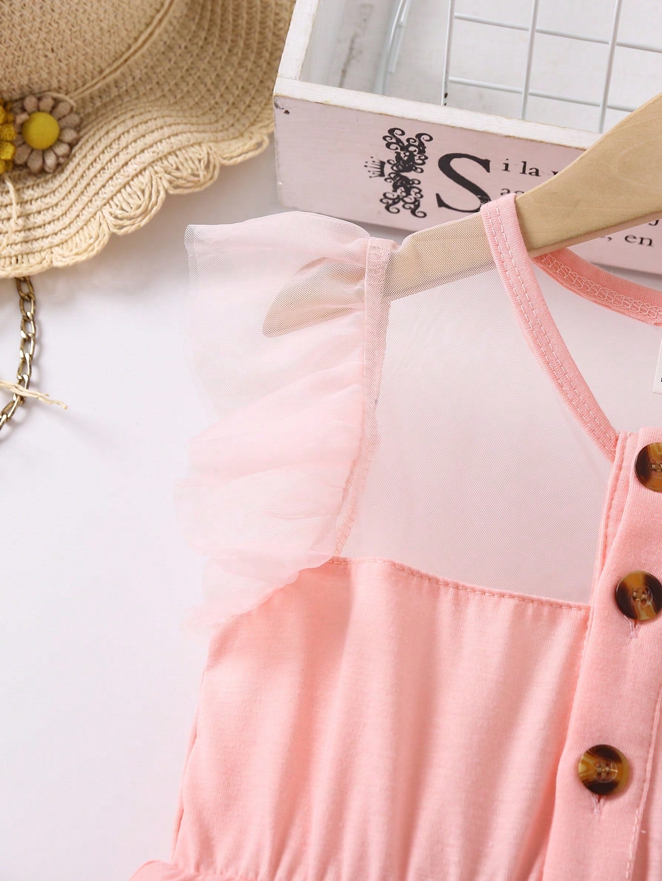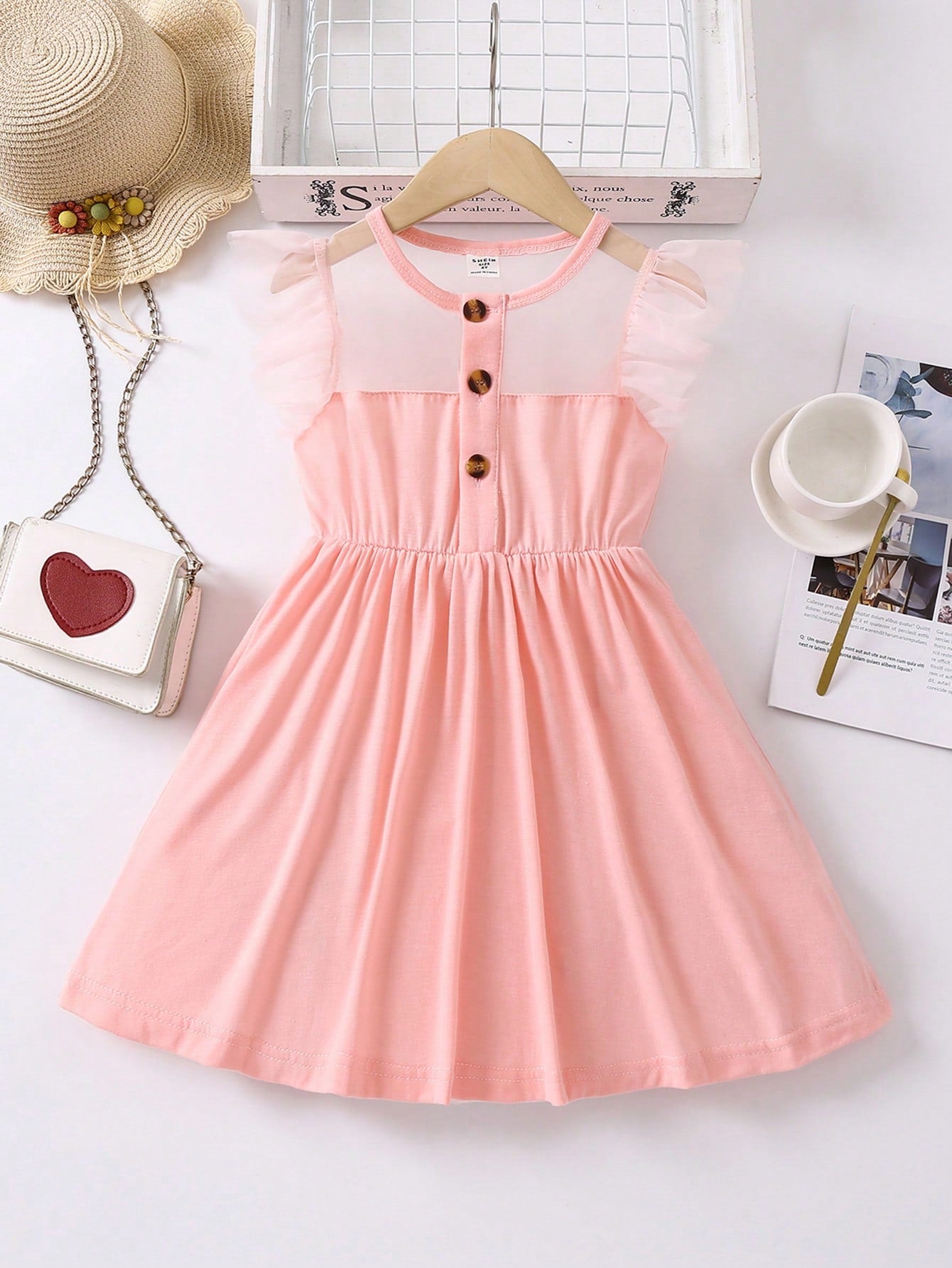 فستان شبكة متباينة مقلم بكشكش أزرار أمامية بنت طفل