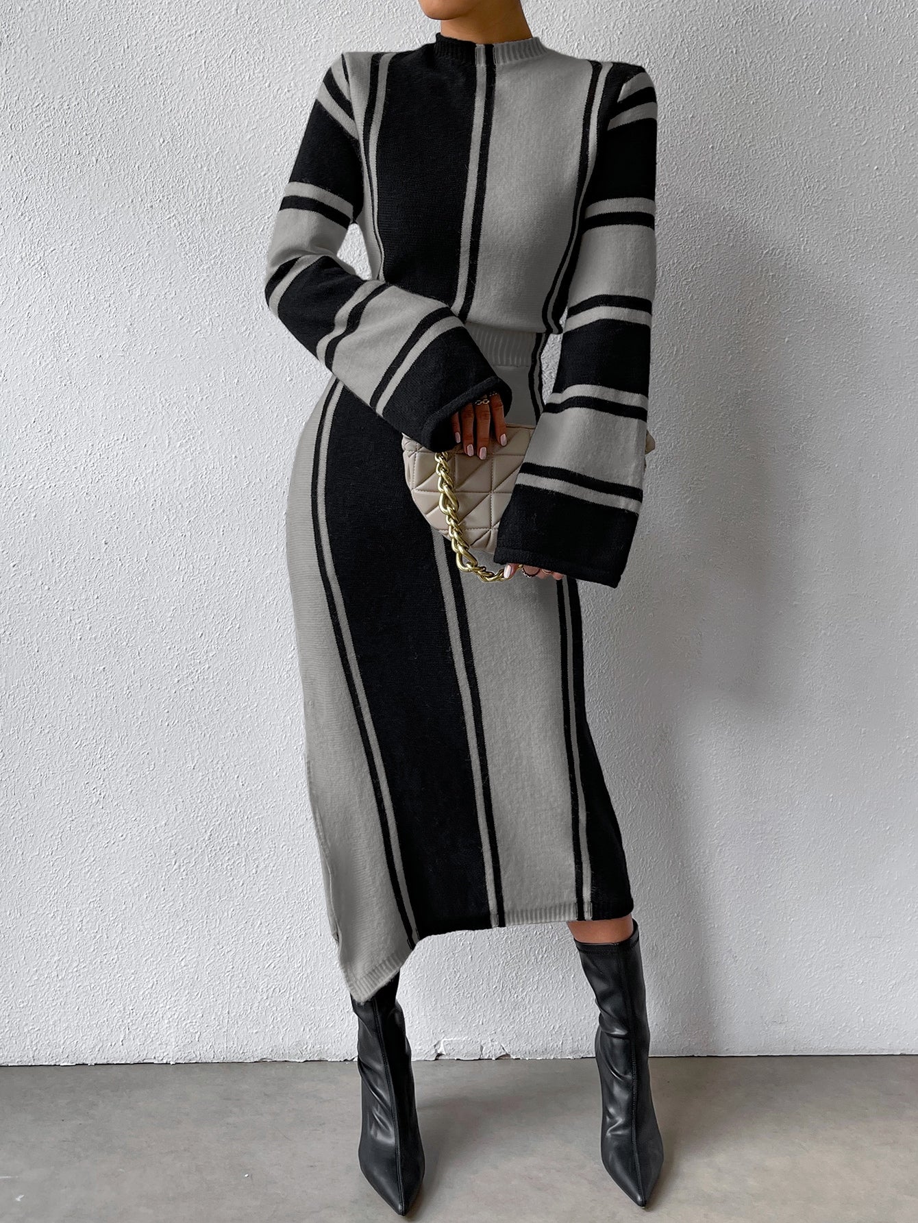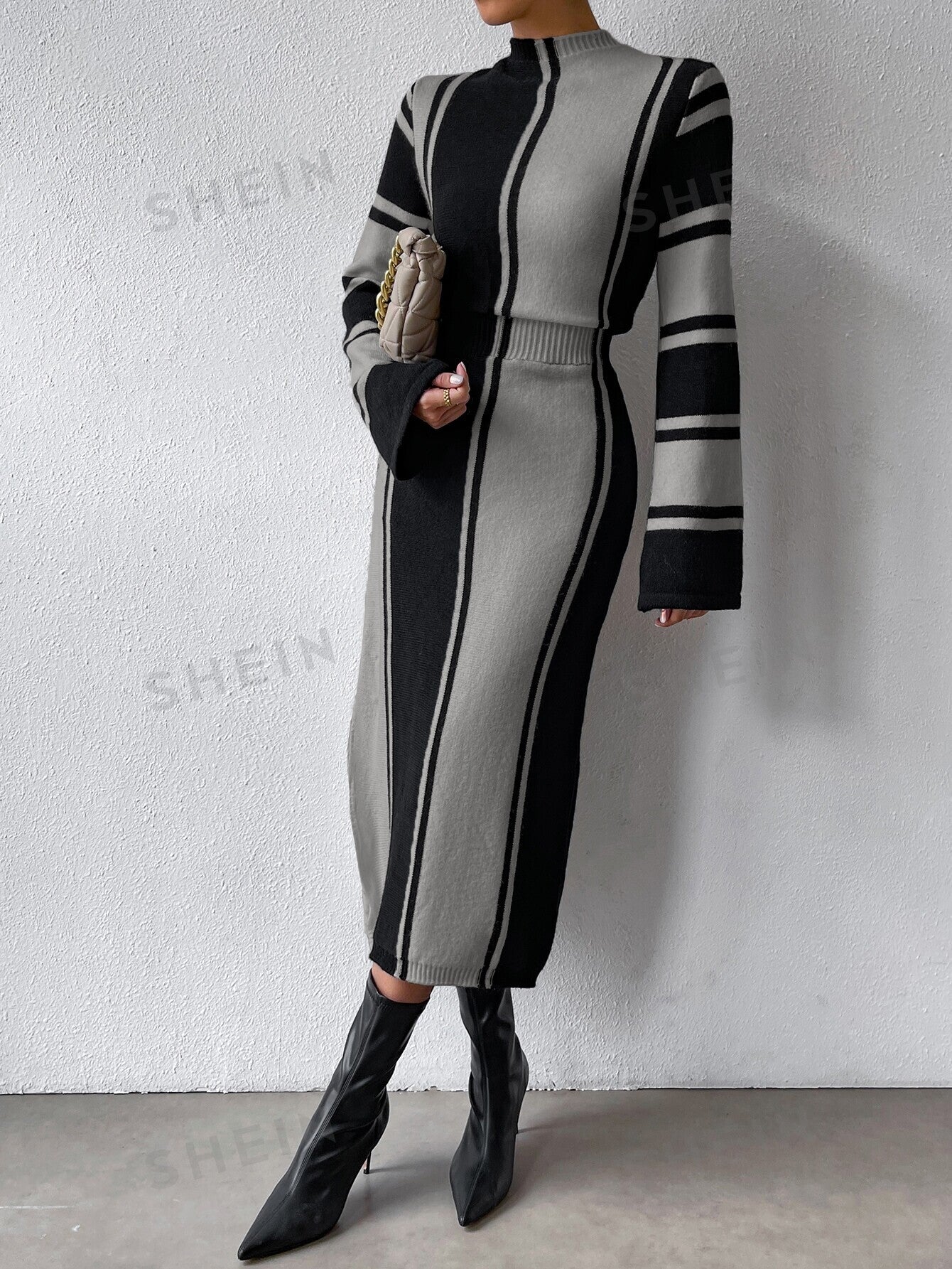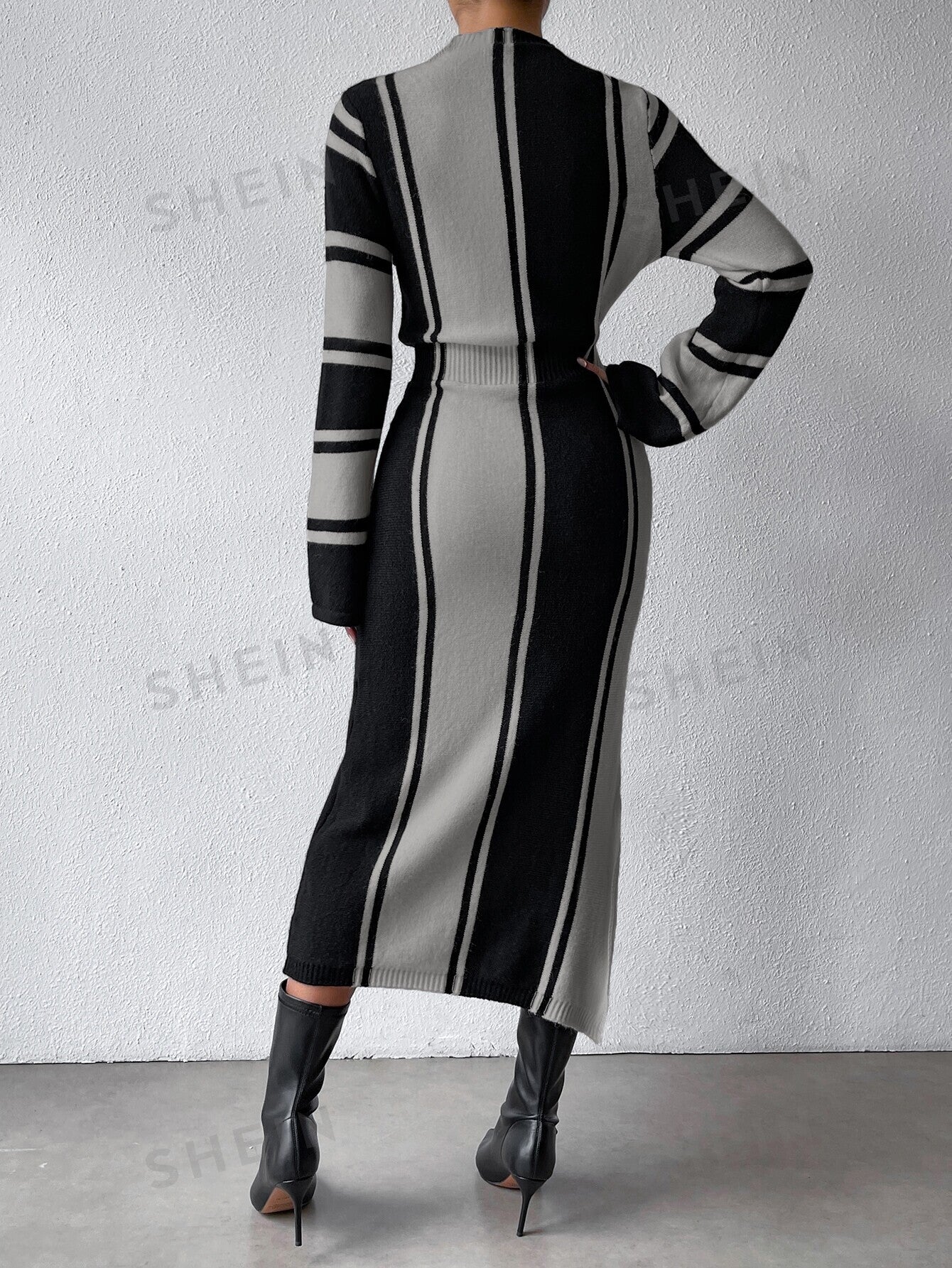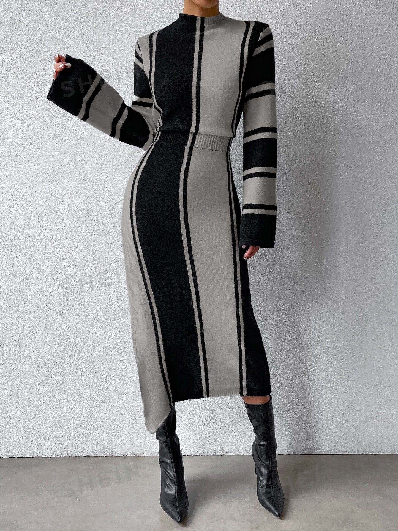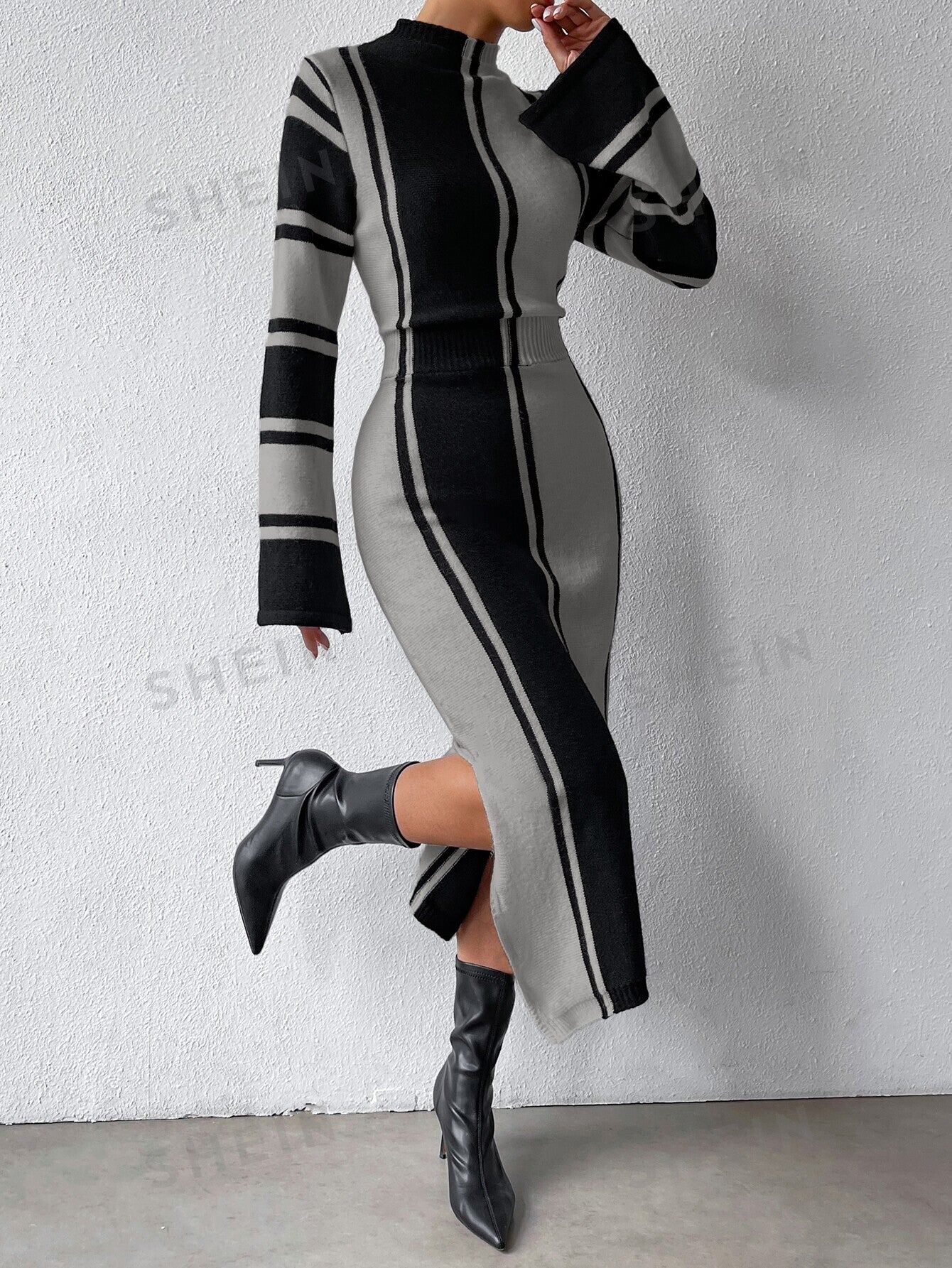 فستان صوفي ألوان متباينة وقوف الياقة بحافة شق