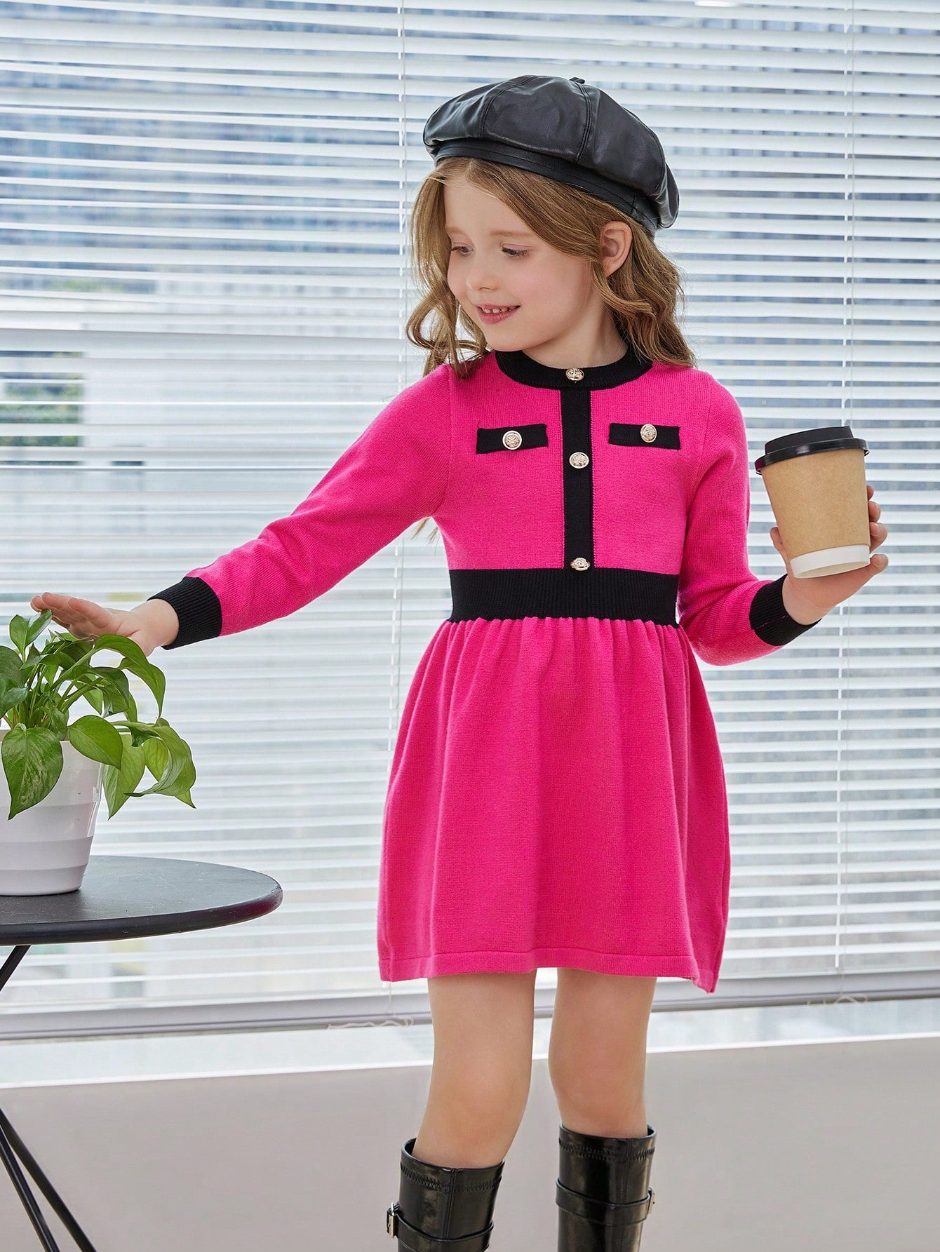 فستان صوف مقلم متباين أزرار أمامية بنت طفل
