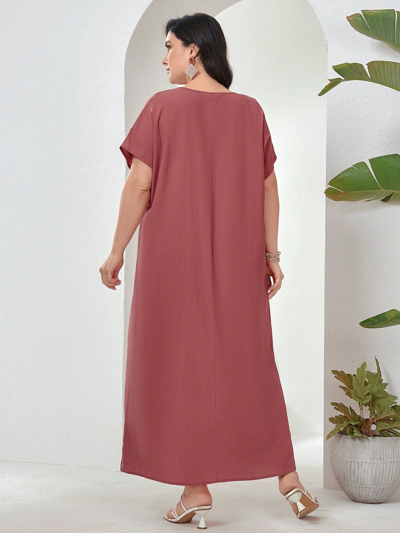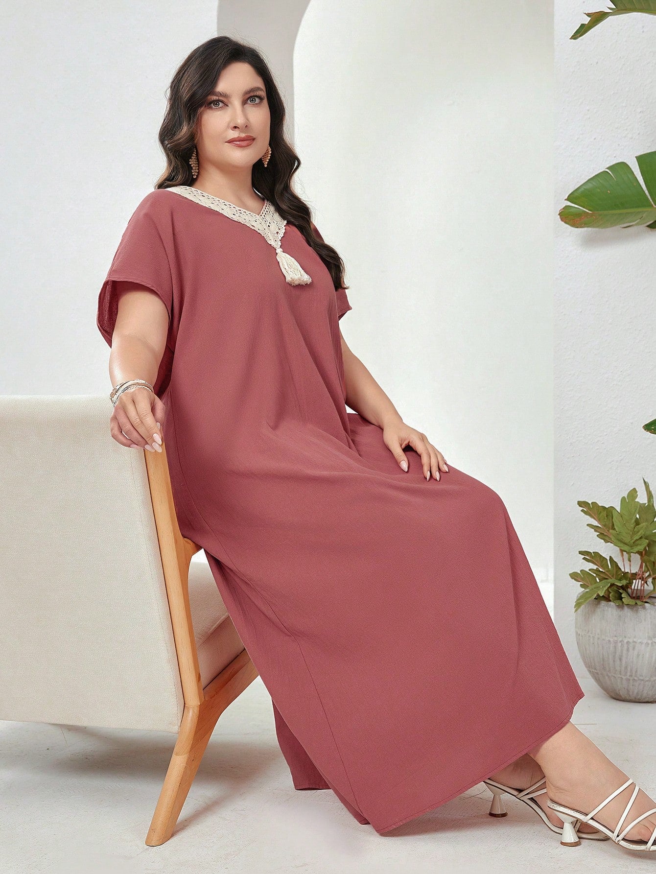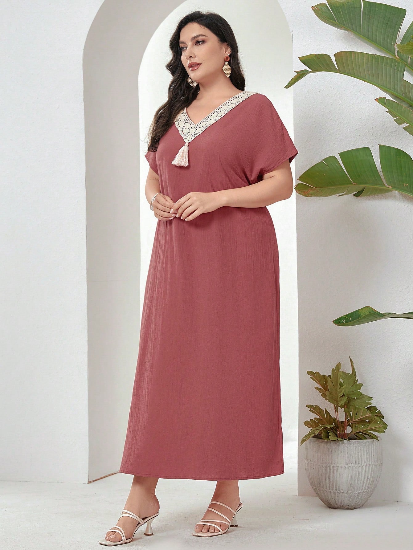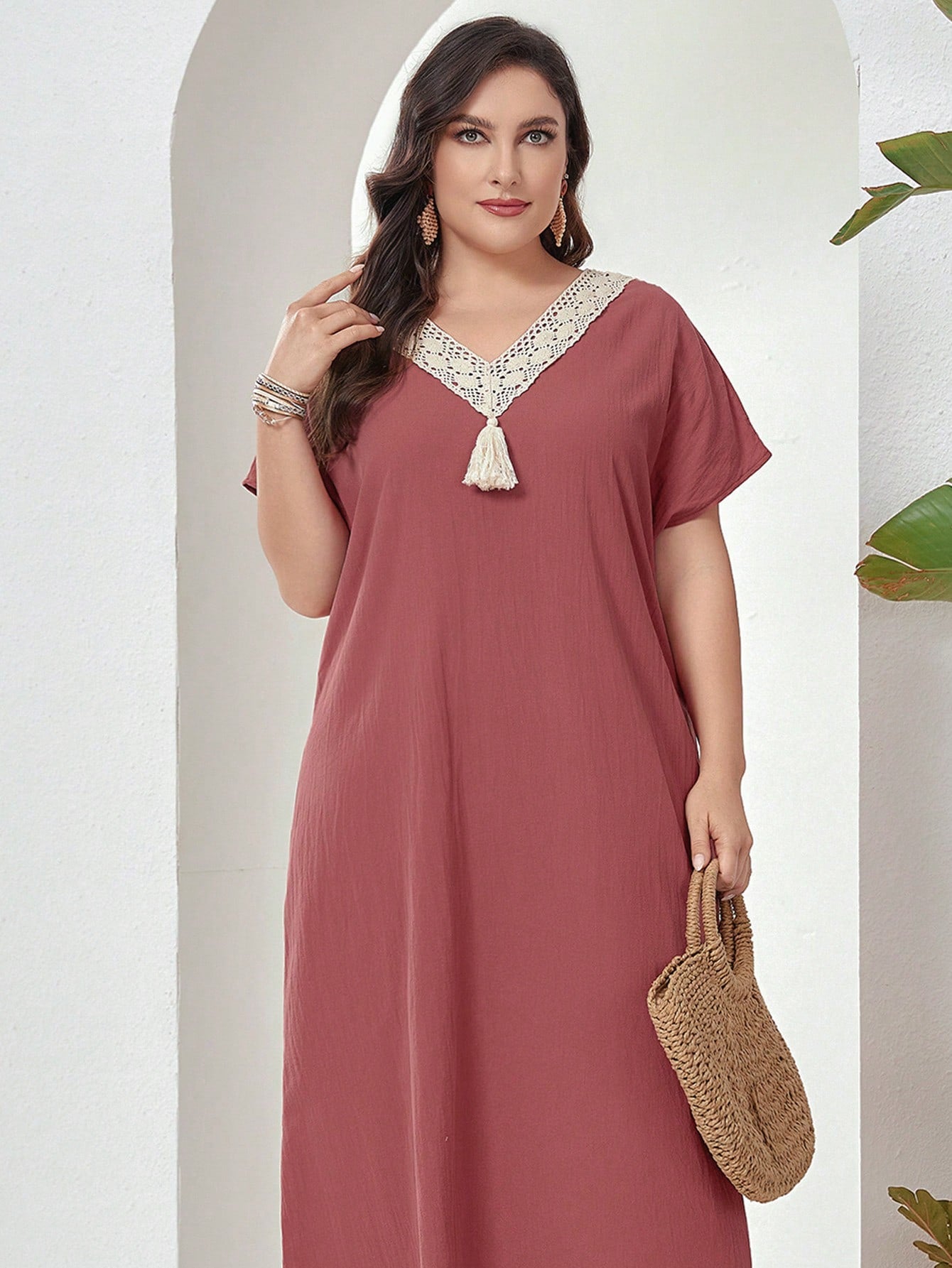 فستان صيفي بحجم كبير عارضة، عنق مستدير، تصميم ملون بقطع الدانتيل، كم فراشة، طويل الأكمام