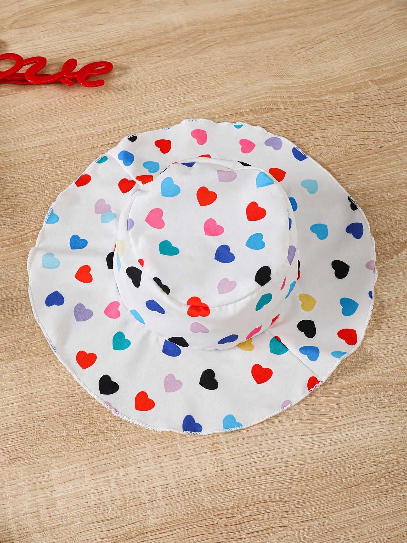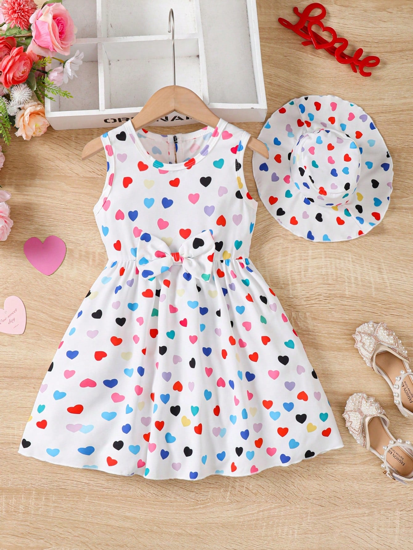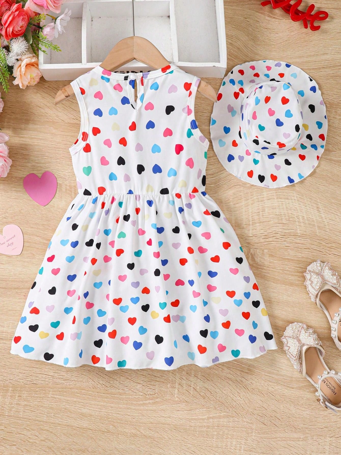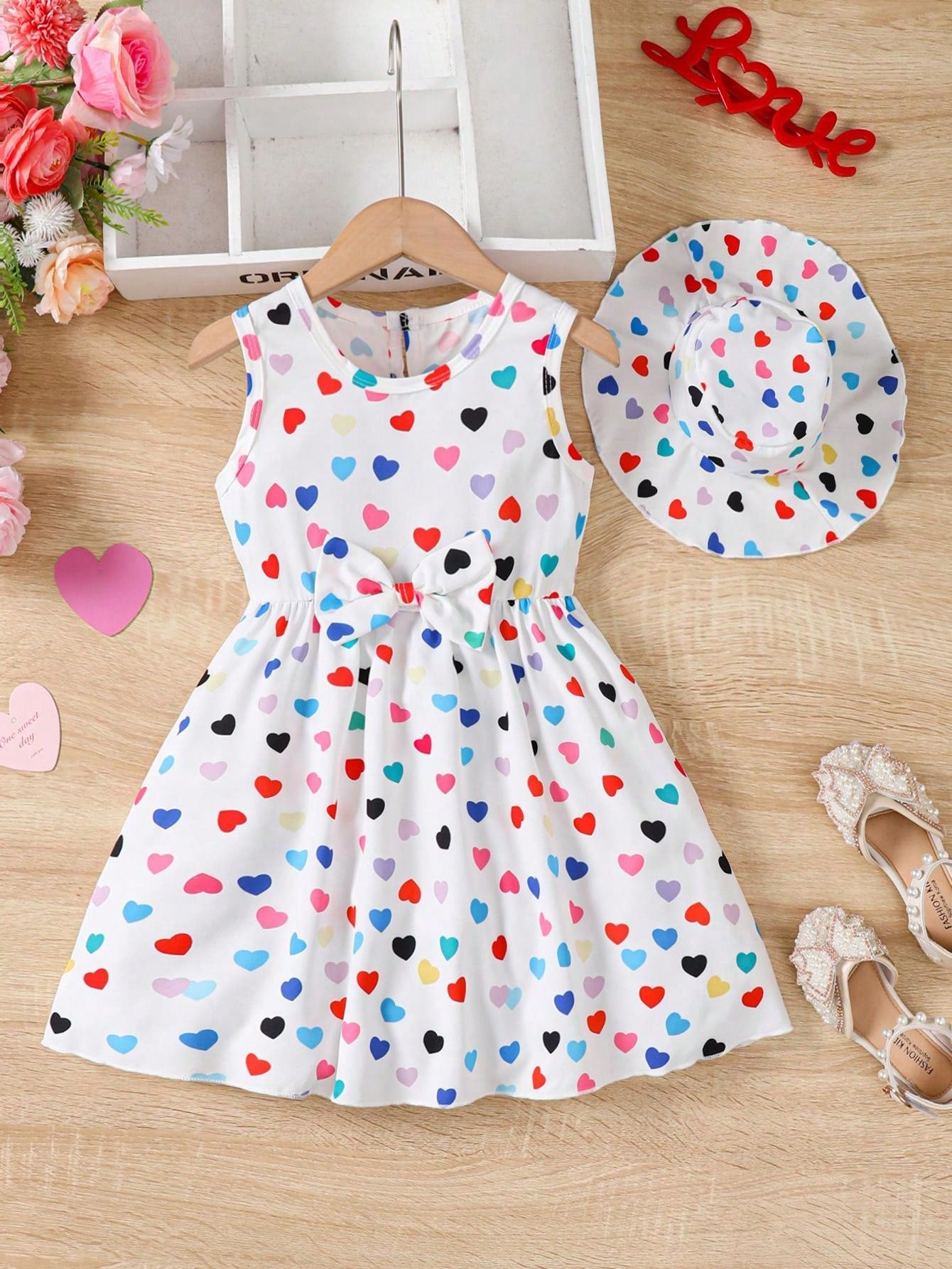 فستان صيفي لطيف للفتاة الصغيرة مطبوع بقلوب ملونة مع قبعة مطابقة