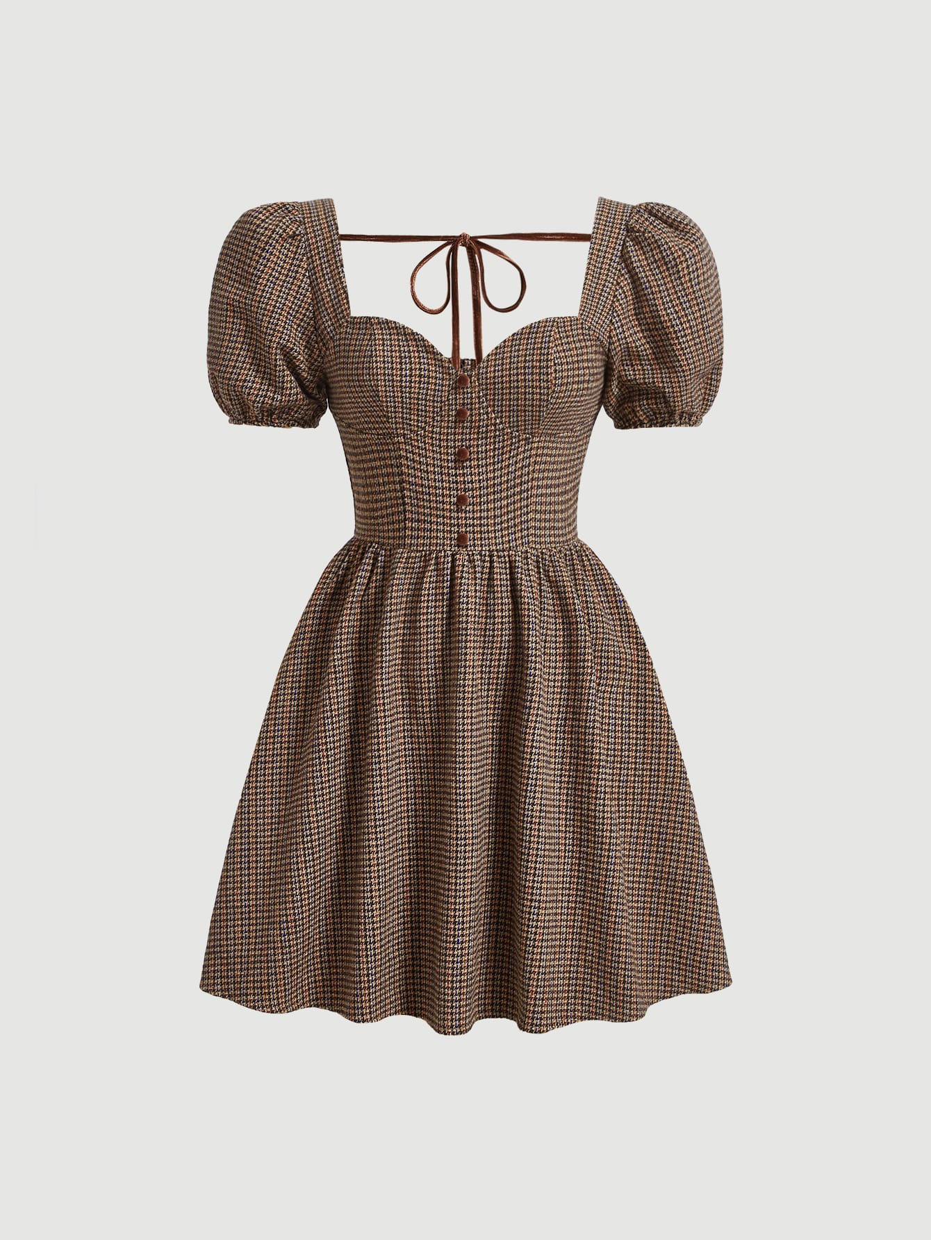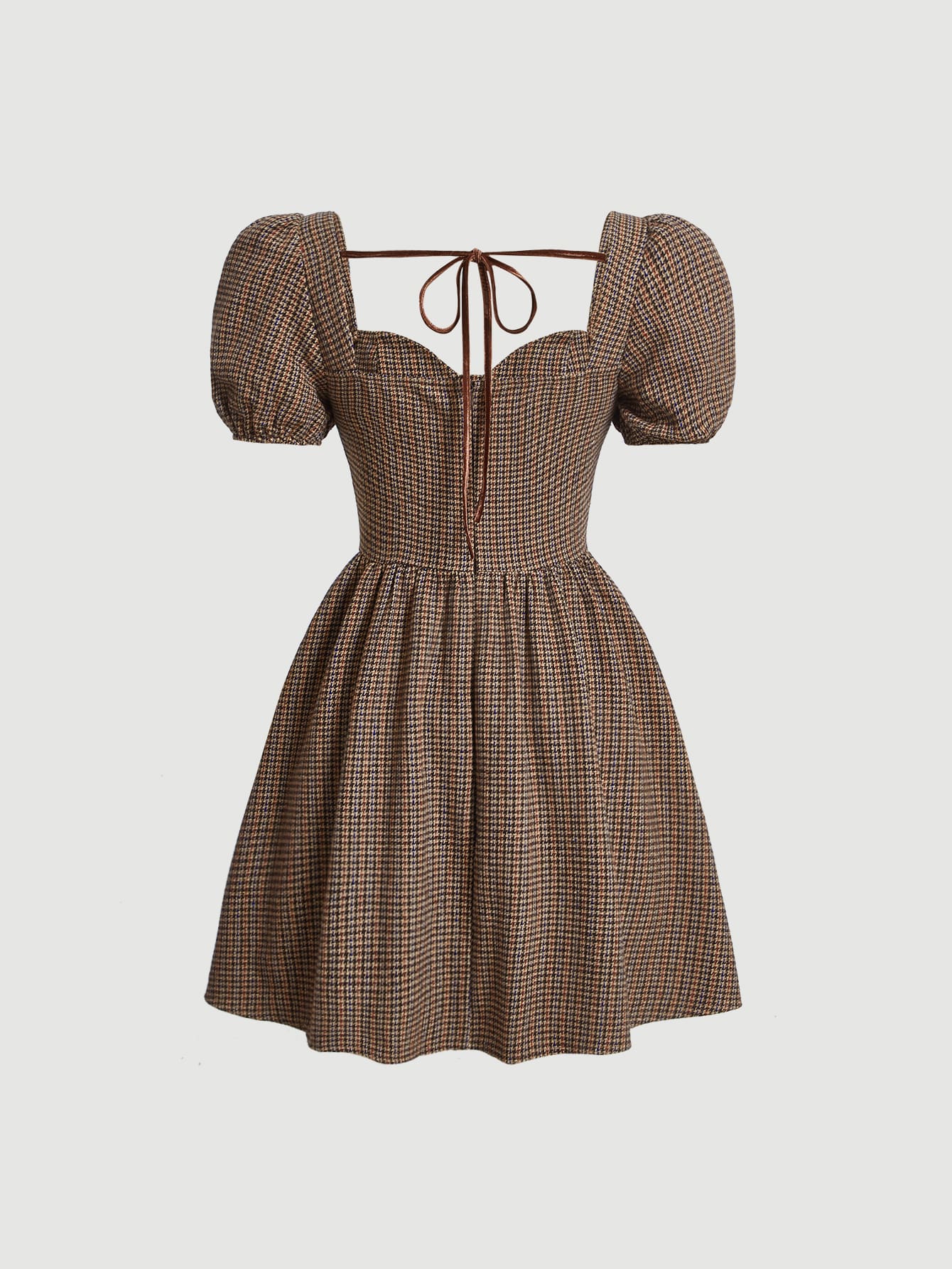 فستان طباعة مربع النقش اكمام منتفخة بربطة ظهر