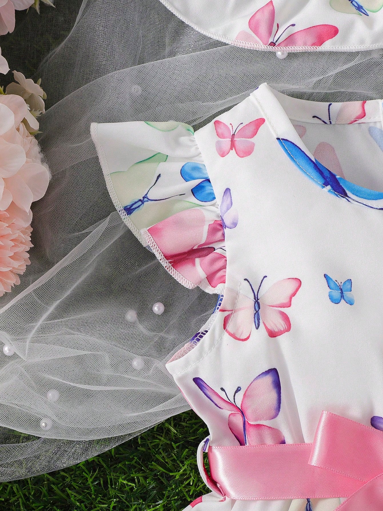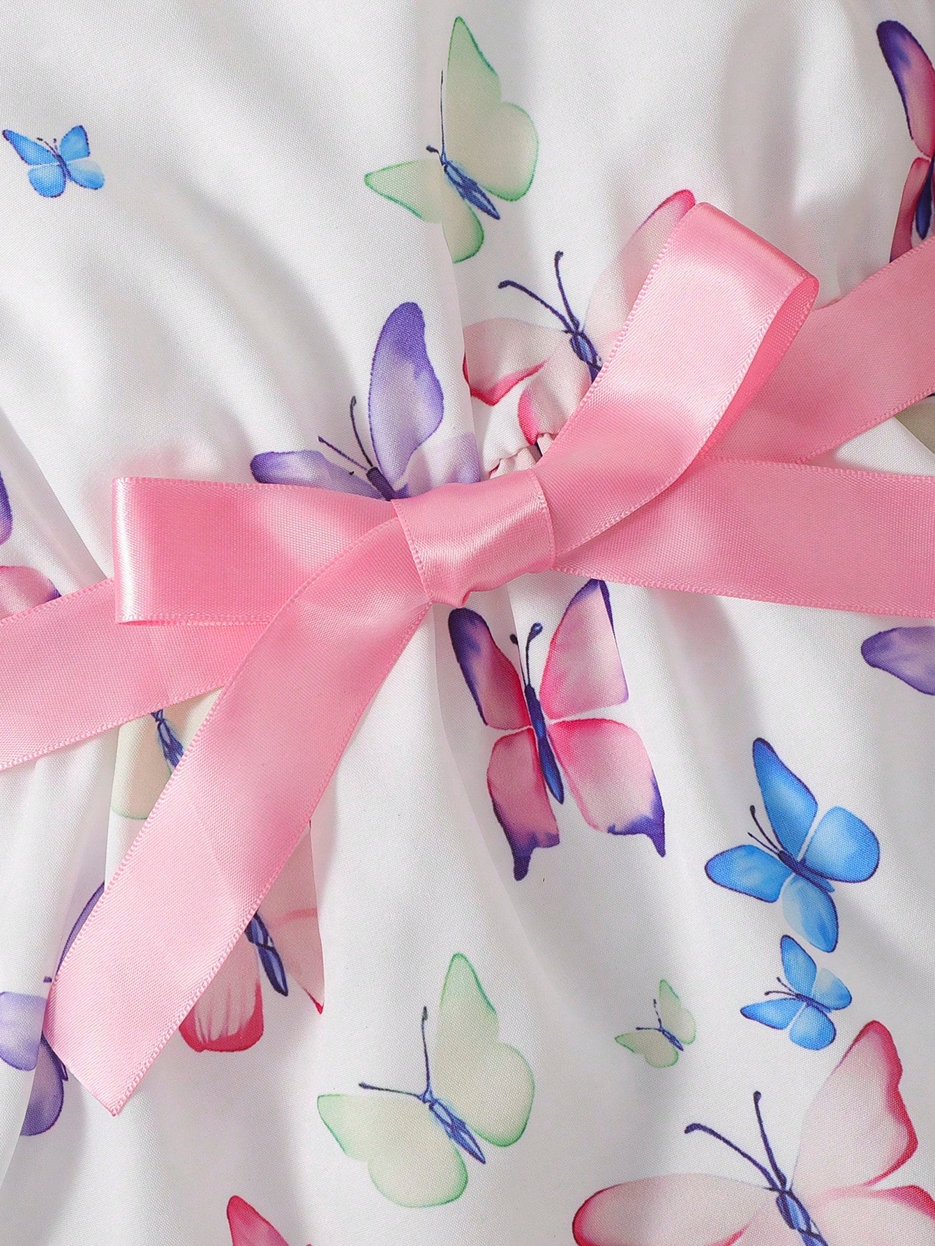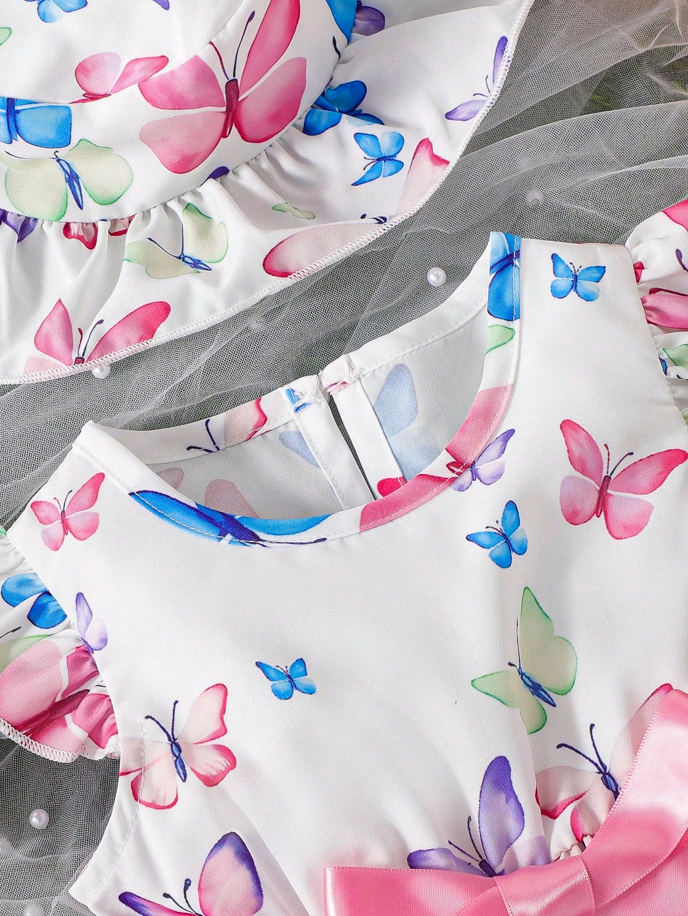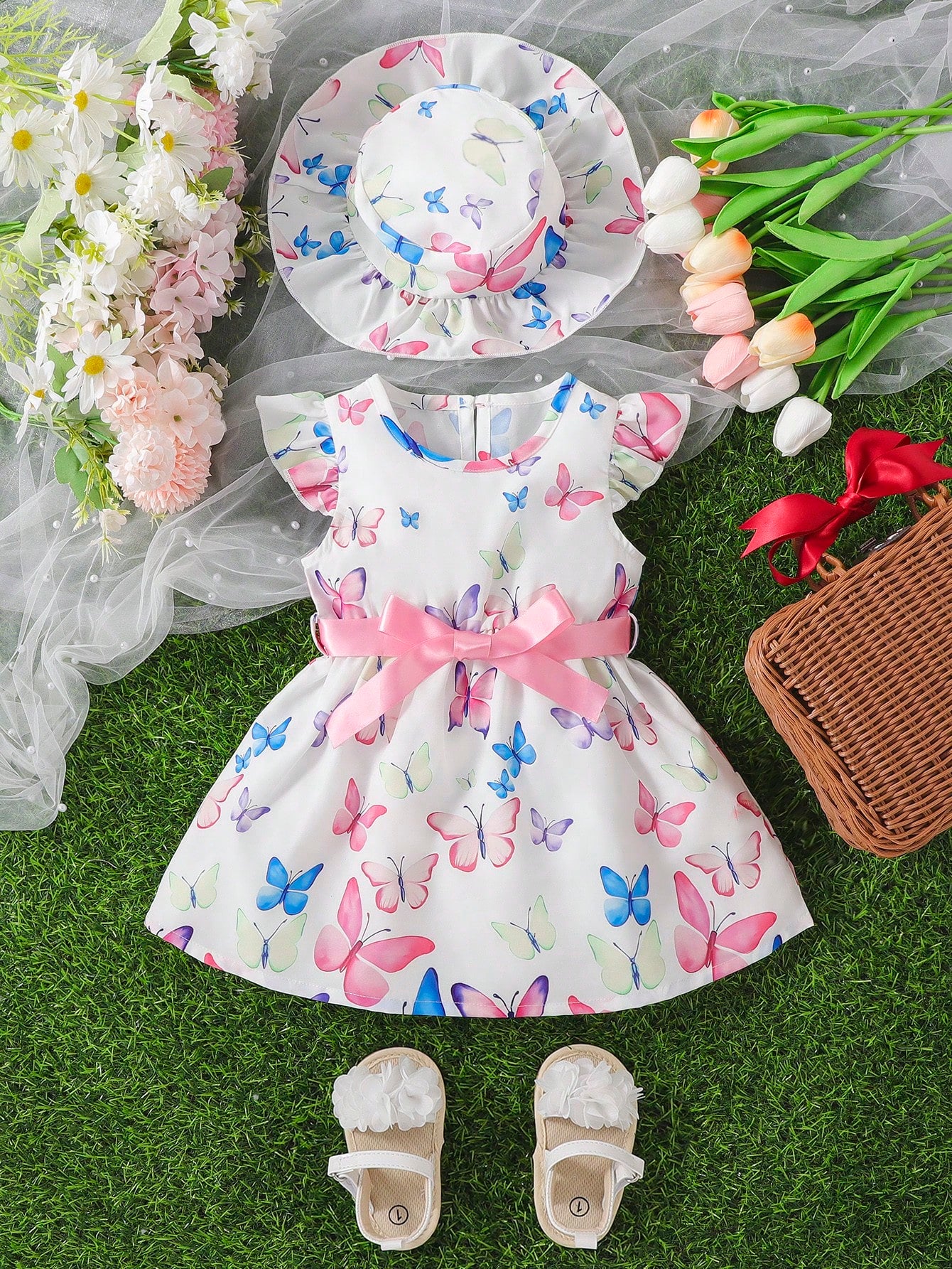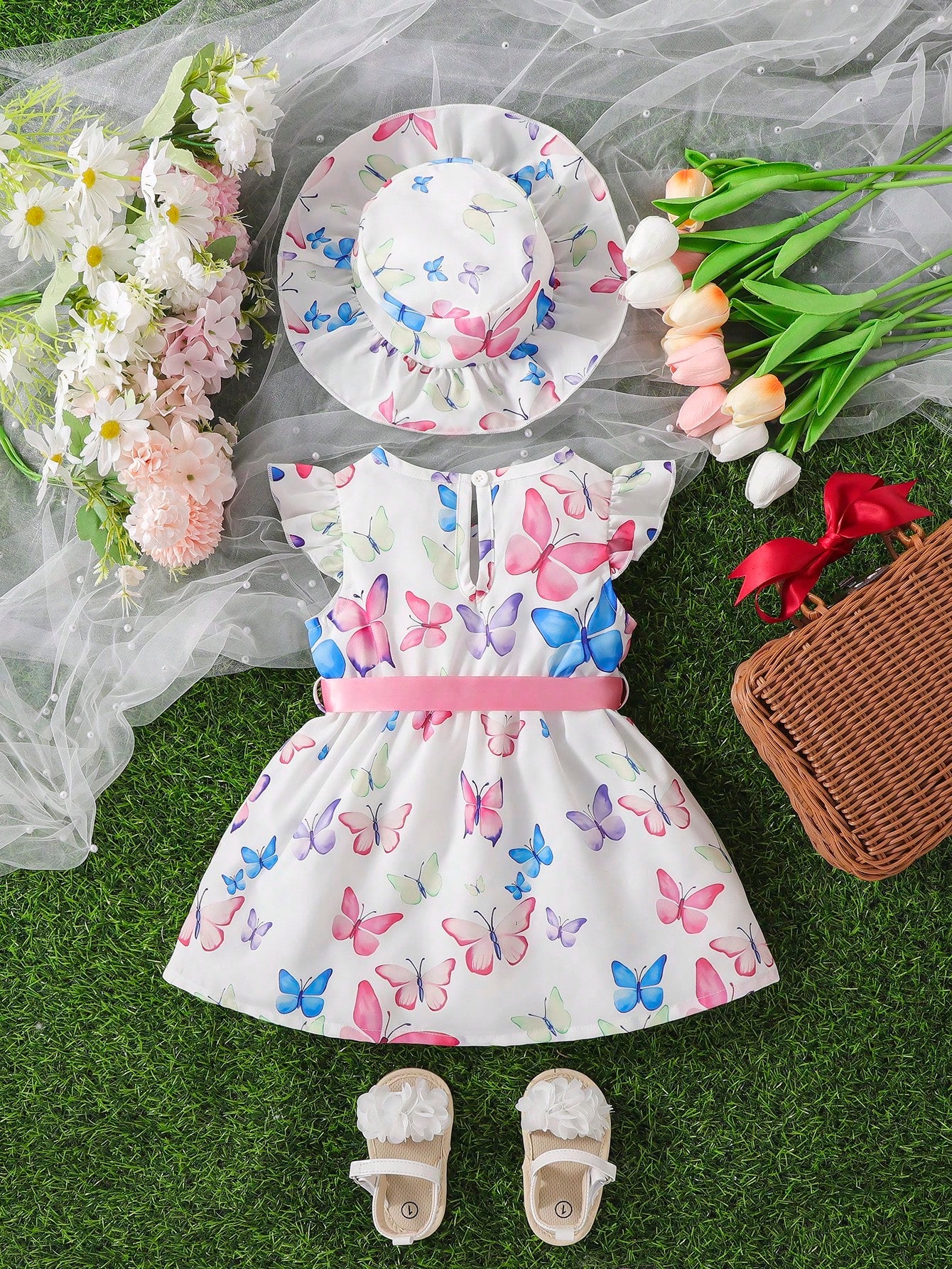 فستان طفلة بناتي بطبعة فراشة و تطريز فرو مع قبعة