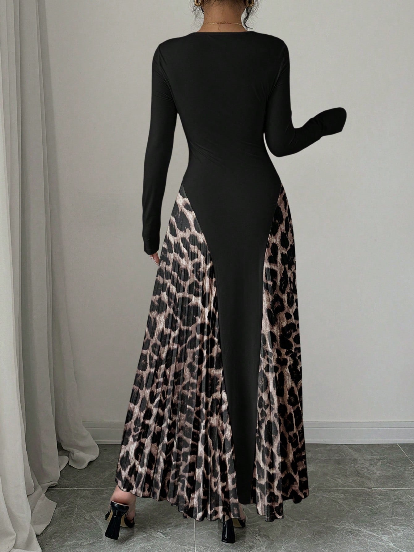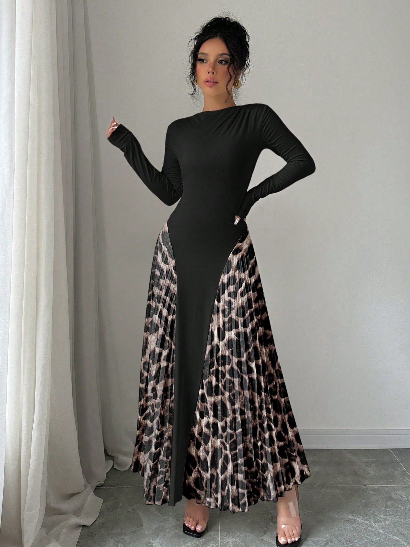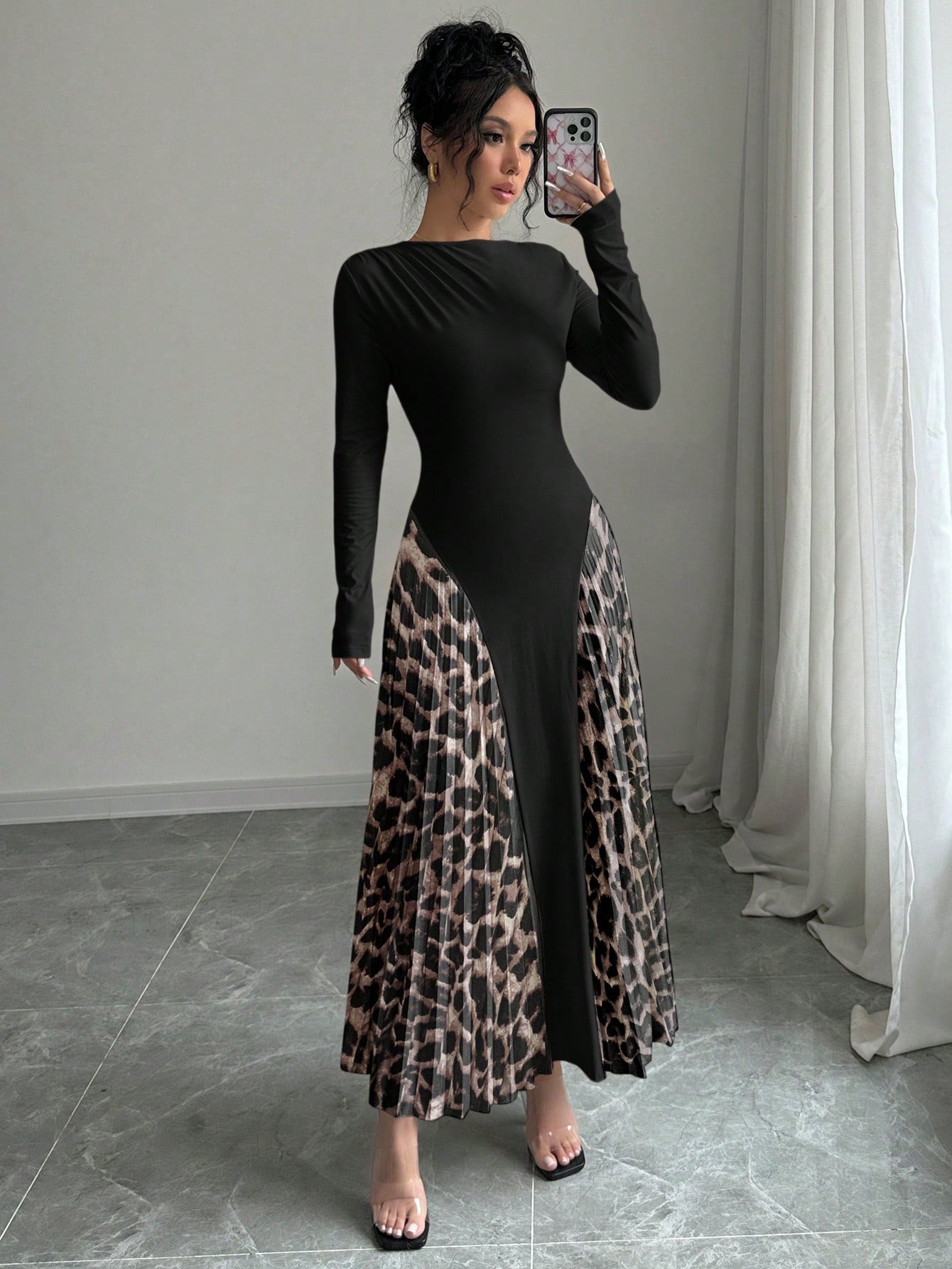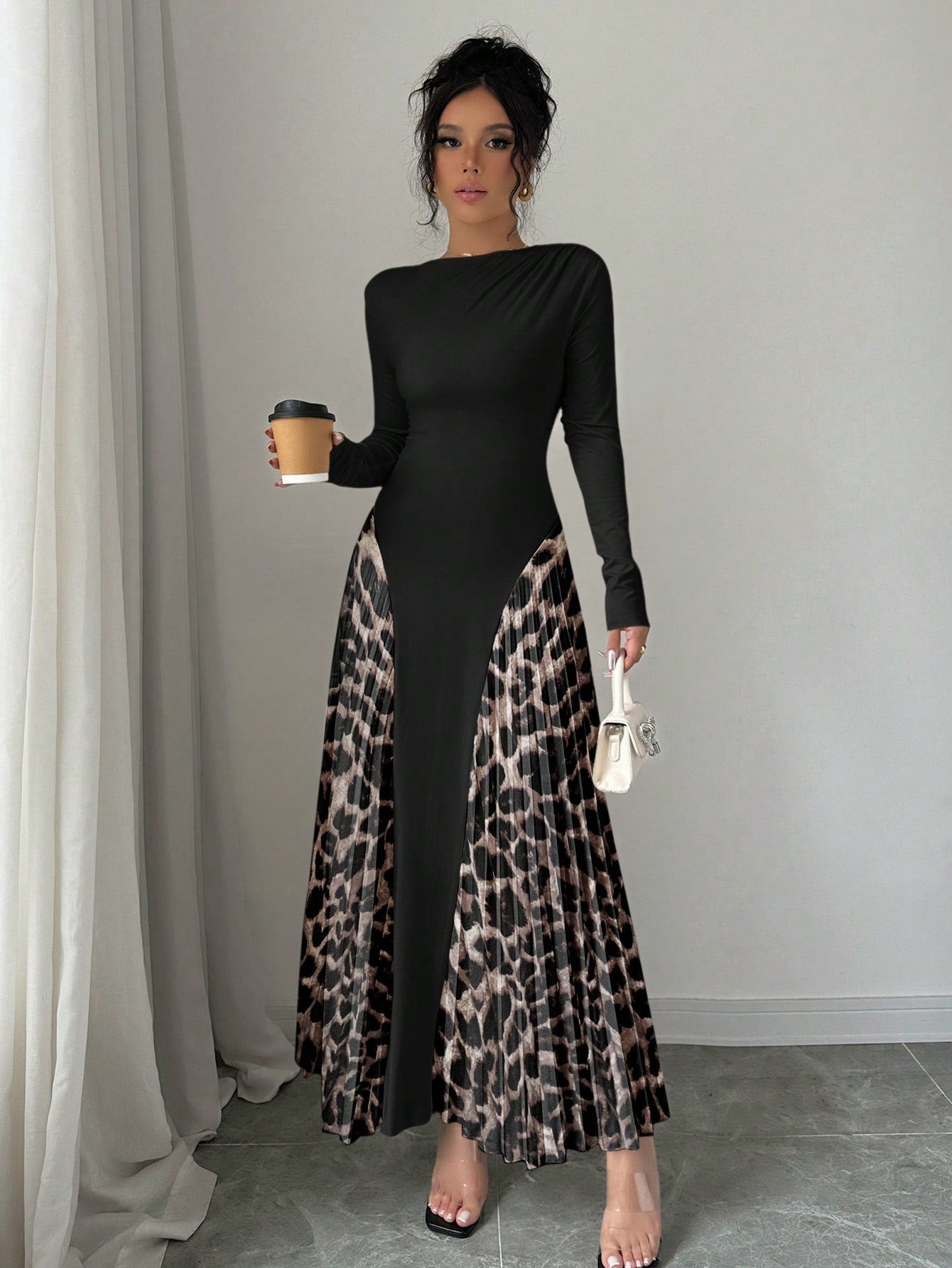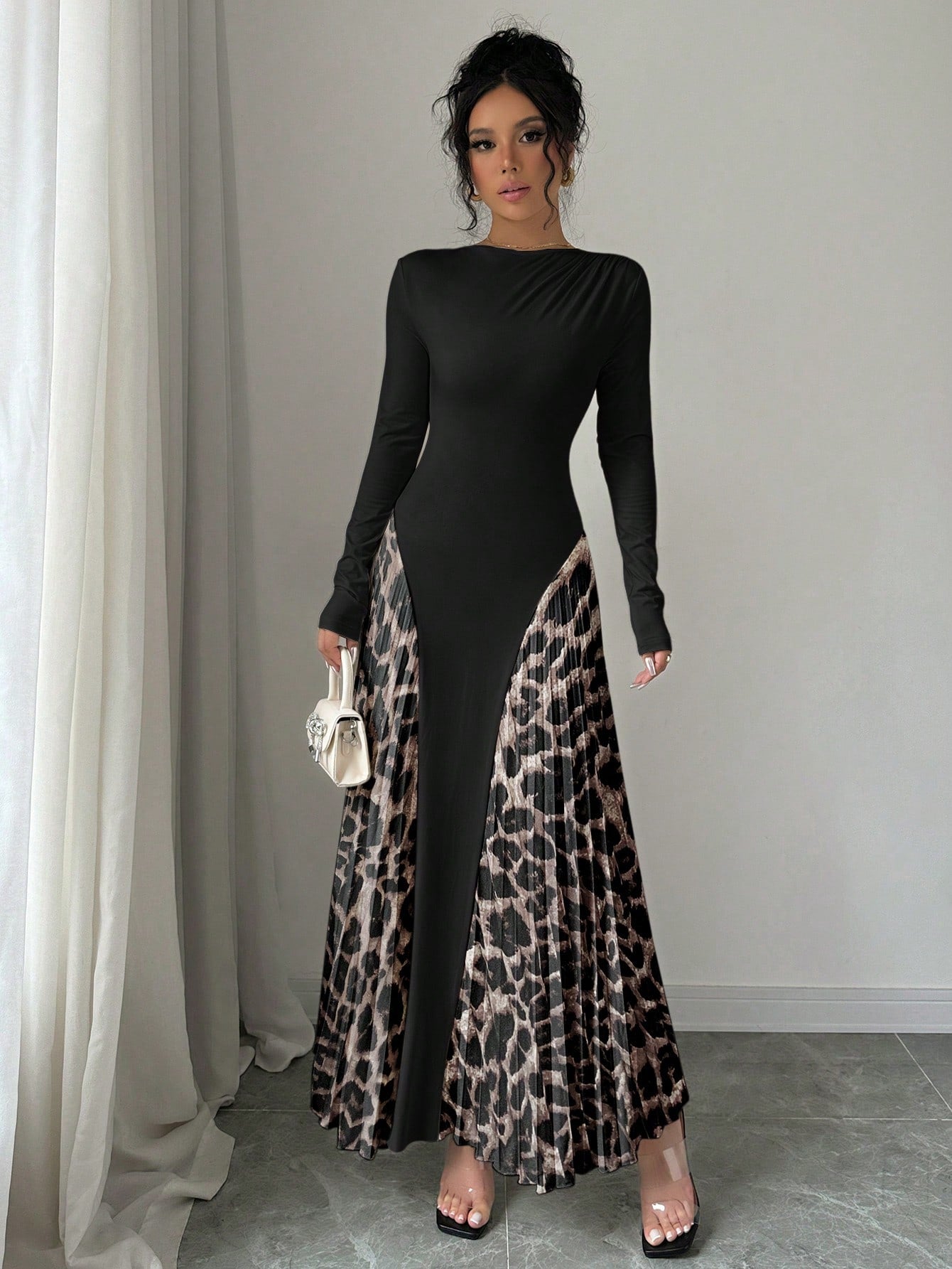 فستان طويل أنيق بأكمام طويلة وخصر مربوط بطيات