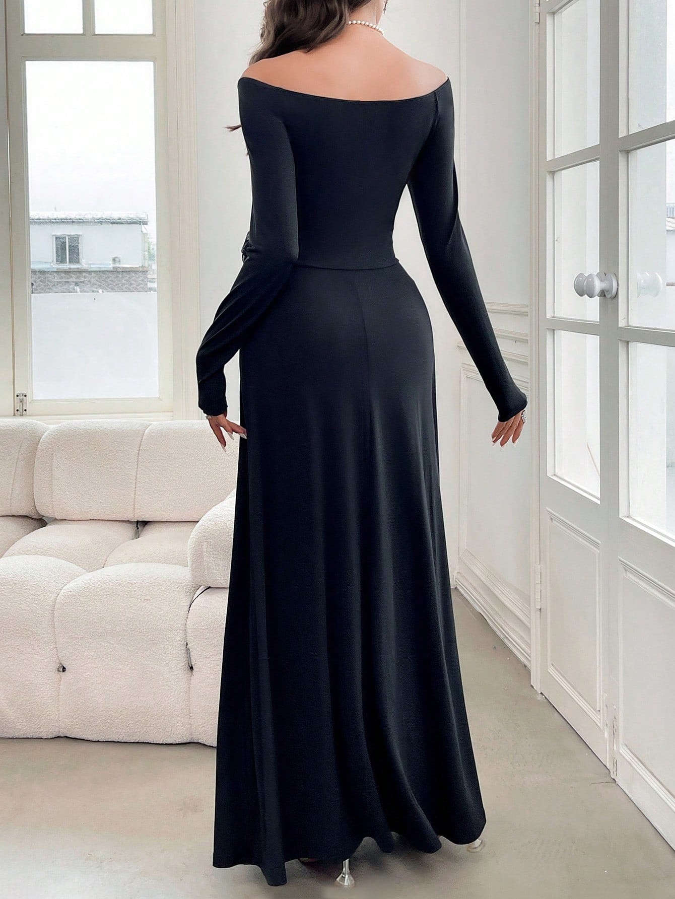 فستان طويل أنيق للنساء بياقة على شكل حرف V وأكمام طويلة مزين بزهور